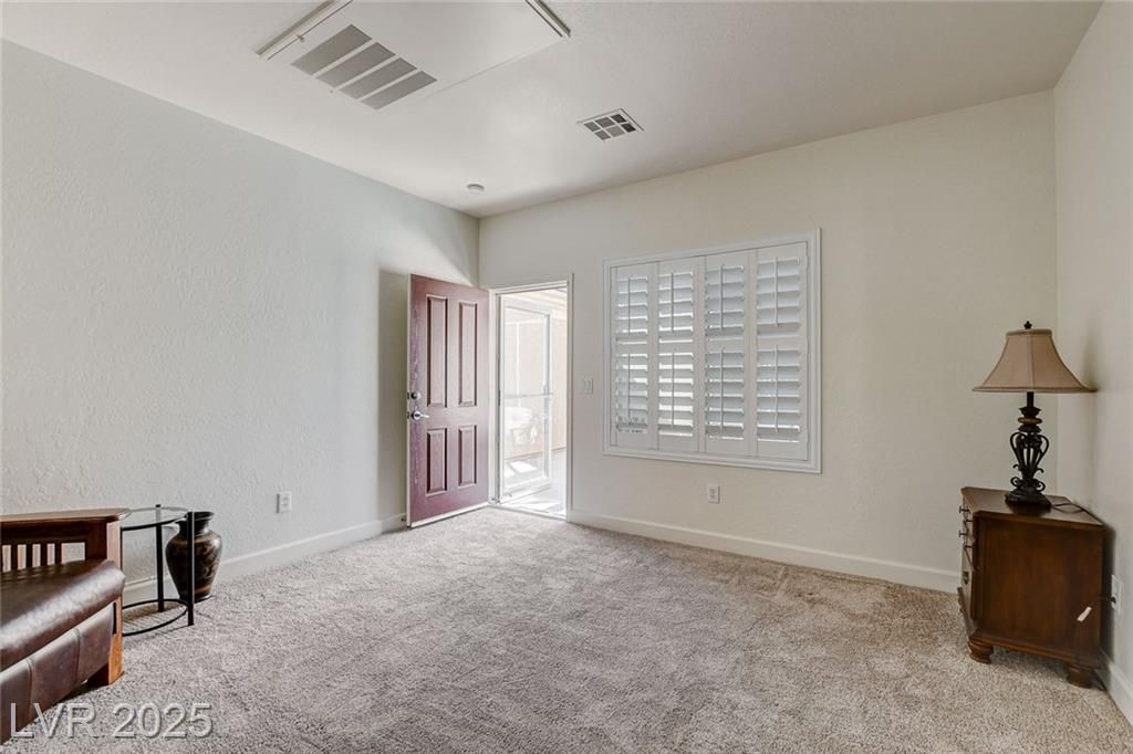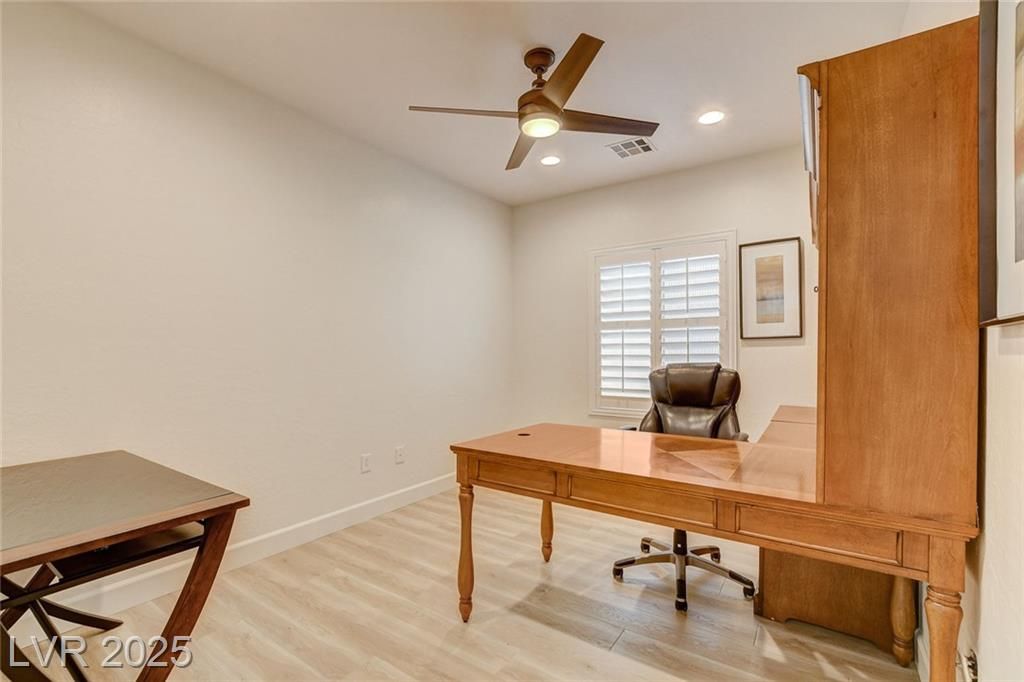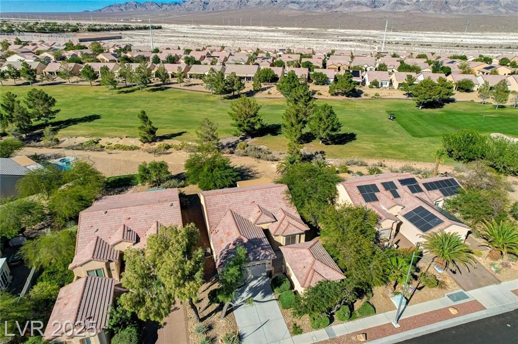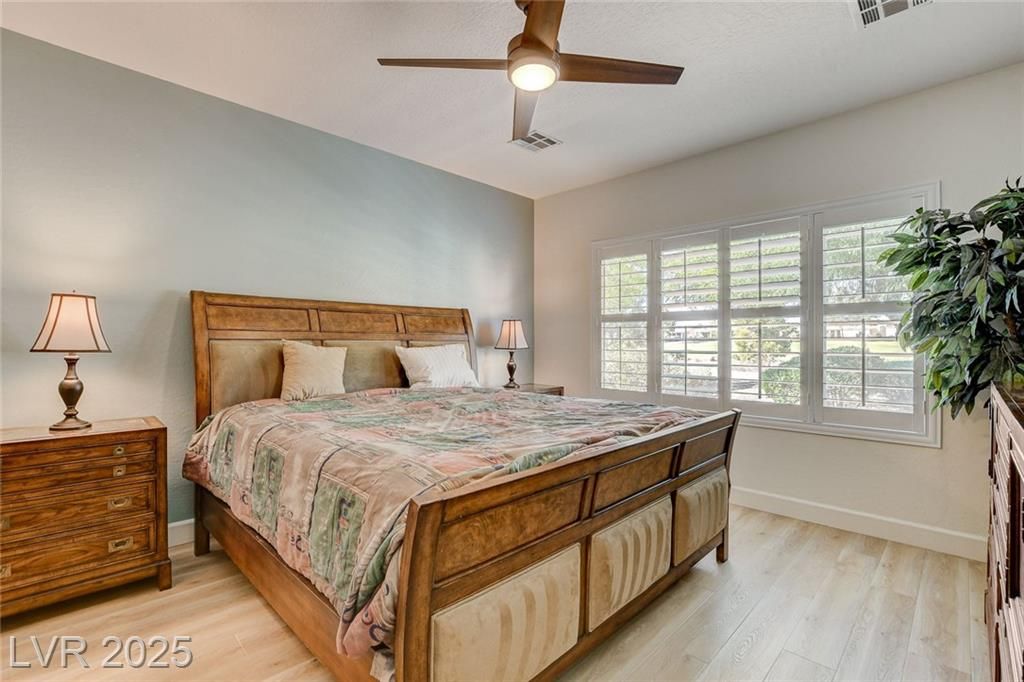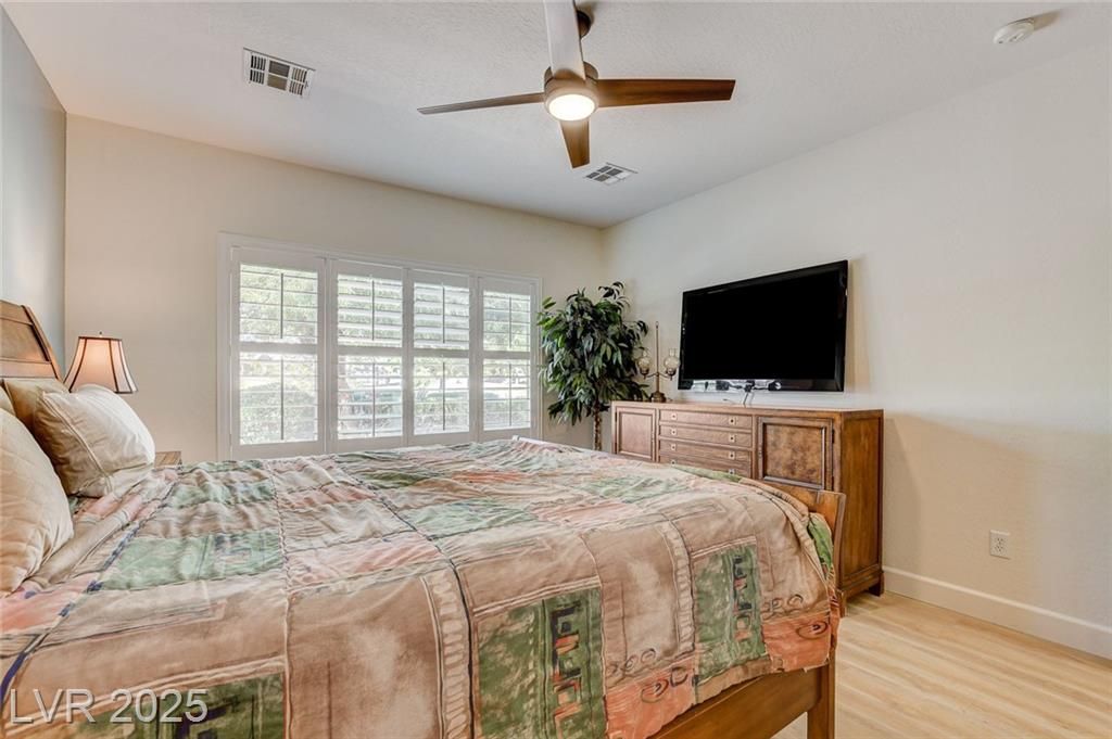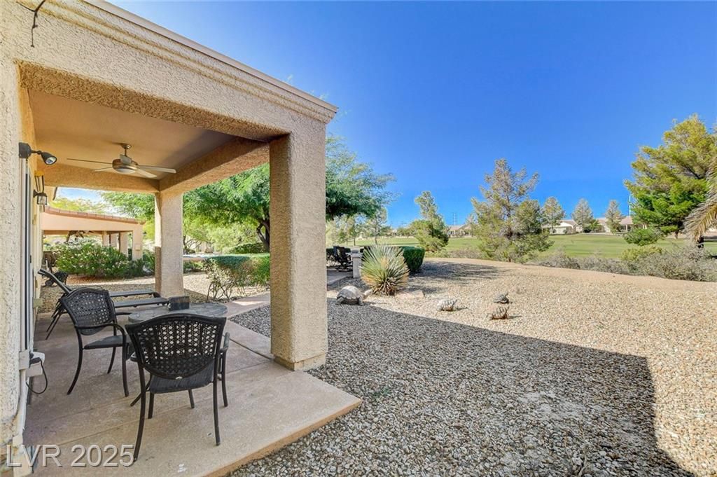 Located in Sun City Aliante on the Aliante golf course, along the 7th hole just an approach shot away from the green you will find this beauty waiting for you. The Laurel floorplan offers a casita including a private bathroom and walk in closet featuring a private courtyard behind. With three bedrooms and an office space adorned with all the modern updates, quartz countertops, stainless steel appliances, luxury vinyl plank flooring, oversized shutters and ceiling fans in every room. Enjoy the view from your own private seating area along the fairway. Enjoy both mountain and golf views along with all the amenities of the master planned community to include pools, parks, pickleball and tennis courts and more. Don’t miss this opportunity to call this beautiful home your own.