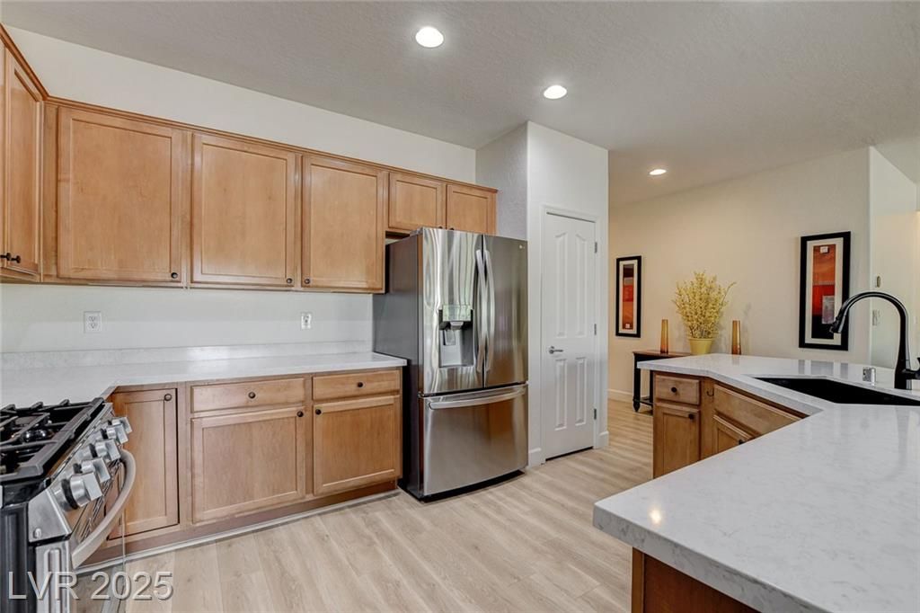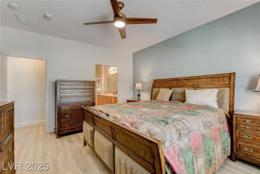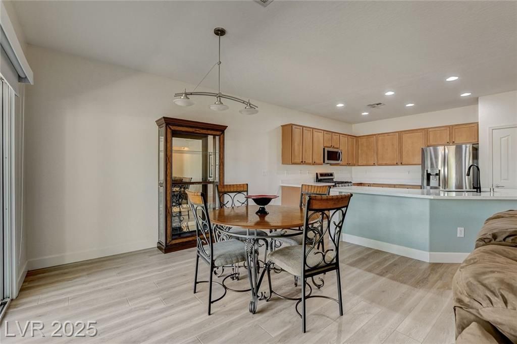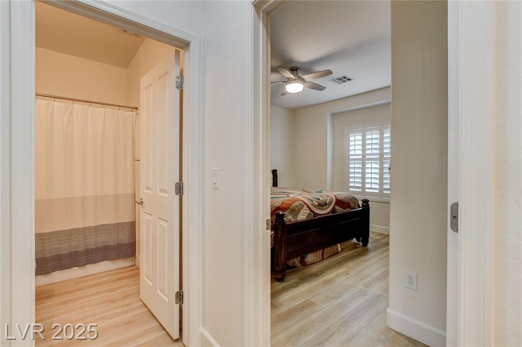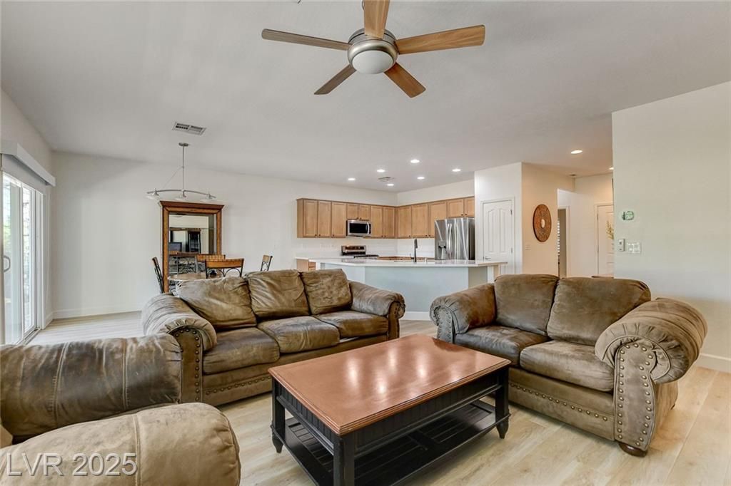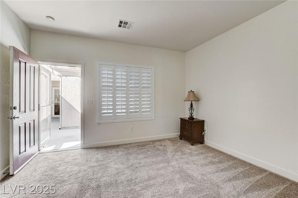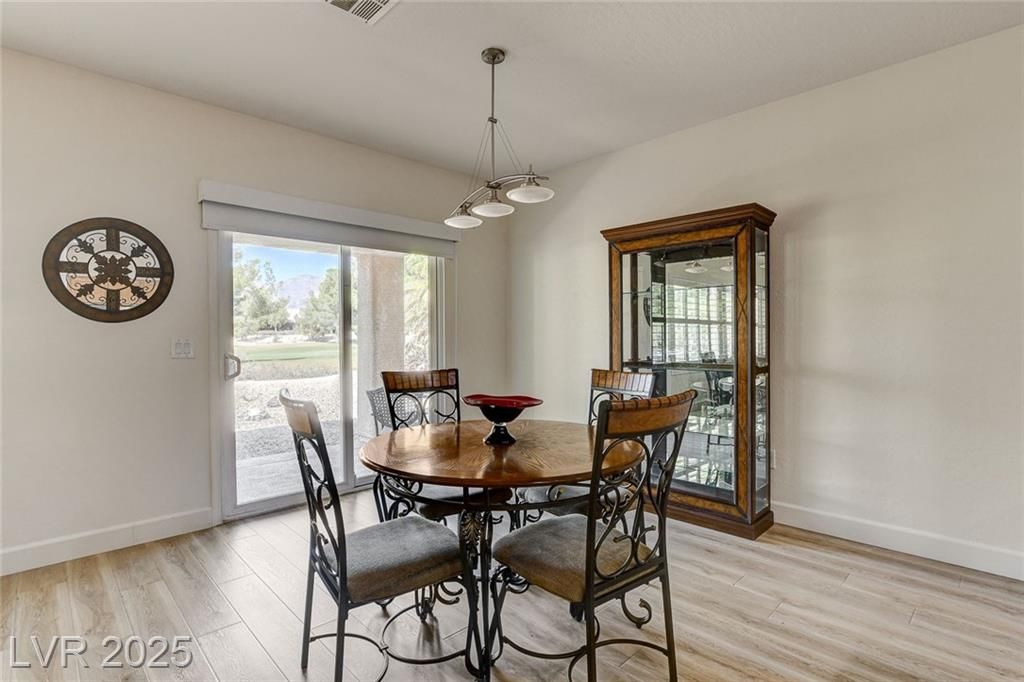 Located in Sun City Aliante on the Aliante golf course, along the 7th hole just an approach shot away from the green you will find this beauty waiting for you. The Laurel floorplan offers a casita including a private bathroom and walk in closet featuring a private courtyard behind. With three bedrooms and an office space adorned with all the modern updates, quartz countertops, stainless steel appliances, luxury vinyl plank flooring, oversized shutters and ceiling fans in every room. Enjoy the view from your own private seating area along the fairway. Enjoy both mountain and golf views along with all the amenities of the master planned community to include pools, parks, pickleball and tennis courts and more. Don’t miss this opportunity to call this beautiful home your own.
