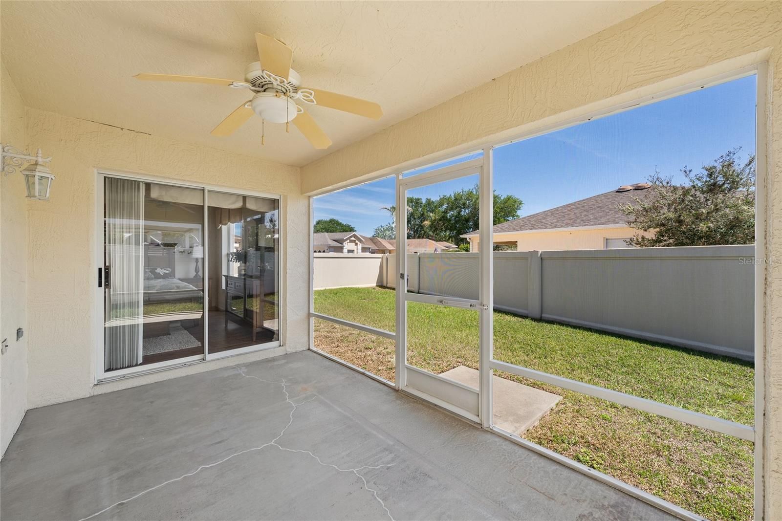 NO BOND*TURNKEY*CORNER LOT This Beautiful Courtyard Cameron Villa is located in the Desirable Village of Calumet Grove, Known for Friendly Neighbors, Active Social Calendars, Golf Cart Convenience, and Easy Access to Everything that Makes The Villages so Special. You will appreciate the low-maintenance landscape and inviting entrance. Step inside to a bright, warm interior where the open-concept living, dining, and kitchen areas flow seamlessly together, enhanced by gorgeous LVP flooring throughout. The spacious kitchen features an abundance of cabinetry, stainless steel gas appliances, a closet pantry, and a generously sized breakfast bar- perfect for casual dining or entertaining. The light-filled living area opens directly to the screened lanai. This private, outdoor space is ideal for entertaining guests or relaxing with your favorite beverage. The gated backyard is private, and perfect for pets or an outdoor retreat with room for a pool or fire pit. The master bedroom is tranquil, with a large walk-in closet and sliding glass doors that open onto the lanai. Guests will feel at home in the additional bedroom, with an adjacent full bath and linen closet, complete with a pocket door for added privacy. Conveniently located- just a 2-minute golf cart ride to pool and mailboxes! Roof 2021* A/C 2018 Don’t miss this incredible opportunity – schedule your private showing today!