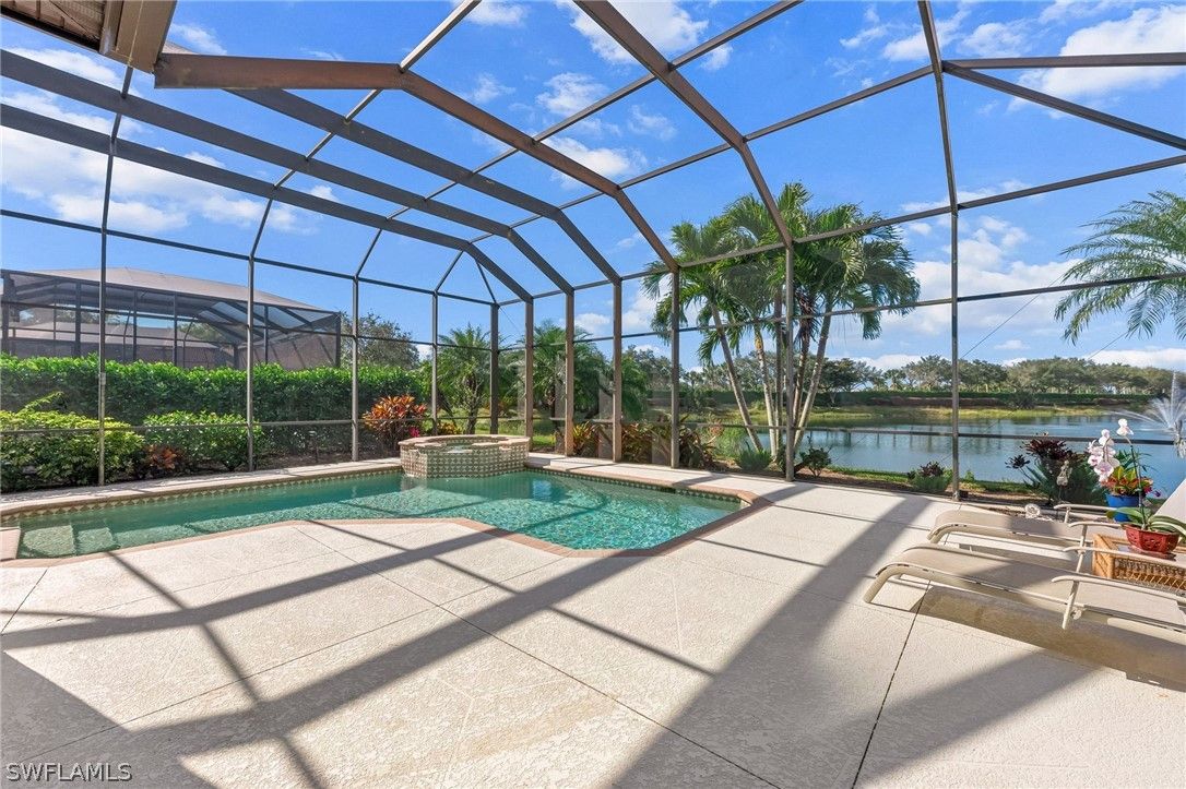 Beautifully cared for one owner home with 3 bedrooms, 2 baths, family room and living area. This is the largest floor plan in the community which is seldom available and located overlooking a large lake with lit fountain. Nicely tiled throughout main living areas, hardwood floor in den/3rd bedroom and carpeted bedrooms. Home has newer tiled roof and freshly painted exterior. Oversized lanai with abundant outdoor living space with large heated pool and spa. Located next to prestigious Classics Clubhouse with membership to the award-winning Players Club.