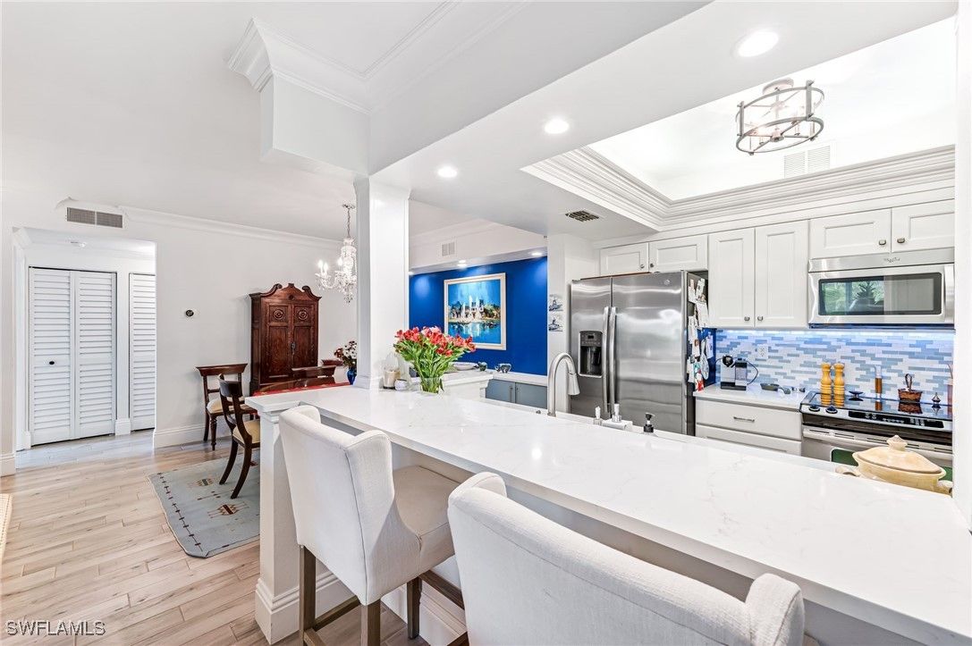 This beautifully updated corner condominium with a great layout, 1,671 SQ. FT. features two bedrooms, each with its own ensuite full bath, situated on opposite sides of the expansive living area for maximum privacy. The living room with tile flooring flows seamlessly into the sunny lanai to enjoy the beauty of the Naples foliage in the morning with coffee. The lanai is a serene space with impact-resistant sliding glass doors on both sides and screens to enjoy fresh air when temperatures are mild. The updated kitchen with contemporary cabinetry, sleek quartz countertops, a farmhouse sink and high-quality GE appliances, makes it easy to prepare something special for guests. Just off the kitchen, the dining area fits a table for 8 family members and friends and a newly added buffet cabinet with quartz top for additional storage. The oversized primary bedroom suite is a sanctuary, featuring a large walk-in closet, an updated bathroom with dual sinks, newer countertops a luxurious soaking tub and glass enclosed shower. The generously sized guest bedroom allows for two full-size beds or a king, also includes two large closets an updated bath with glass shower, dual sinks and newer quartz countertops. Also in the home, a full size washer dryer. The ample storage options include a large indoor storage closet near the front door for all your sports gear, luggage and holiday decor. In addition, residents enjoy a refreshing swim in the sparkling lakeside pool at Willow Brook. This is a pet-friendly community, allowing two pets per condominium with no weight restrictions, owners will keep their pets on a leash while walking around Willow Brook. Also they have one of the lowest HOA fees in Pelican Bay. They boast a strong rental history, with first-floor condominiums renting up to $8K/month during peak season with a 60 day min. When you are ready to head out on the town, your covered parking space is just a short distance away, with guest parking also nearby. Every detail of this home has been designed to offer a relaxing space after a day at the private beach, tennis or pickleball courts, kayaking, sailing, jet skiing, games with friends at the community center or shopping. Also available within Pelican Bay are world-class cultural events, well known musicians, the Baker museum with contemporary artists, Naples philharmonic, broadway shows, and interesting lectures. As a homeowner within Pelican Bay many of these amenities are included in your quarterly fee, such as private beach access overlooking miles of coastline with chair and umbrella service, 2 private beachfront restaurants, 26 tennis courts, a fitness center, kayaks, community room, social activities and 20 new pickleball courts. A vibrant, friendly community which hosts regular social events, offering plenty of opportunities to meet your neighbors and engage in community activities.