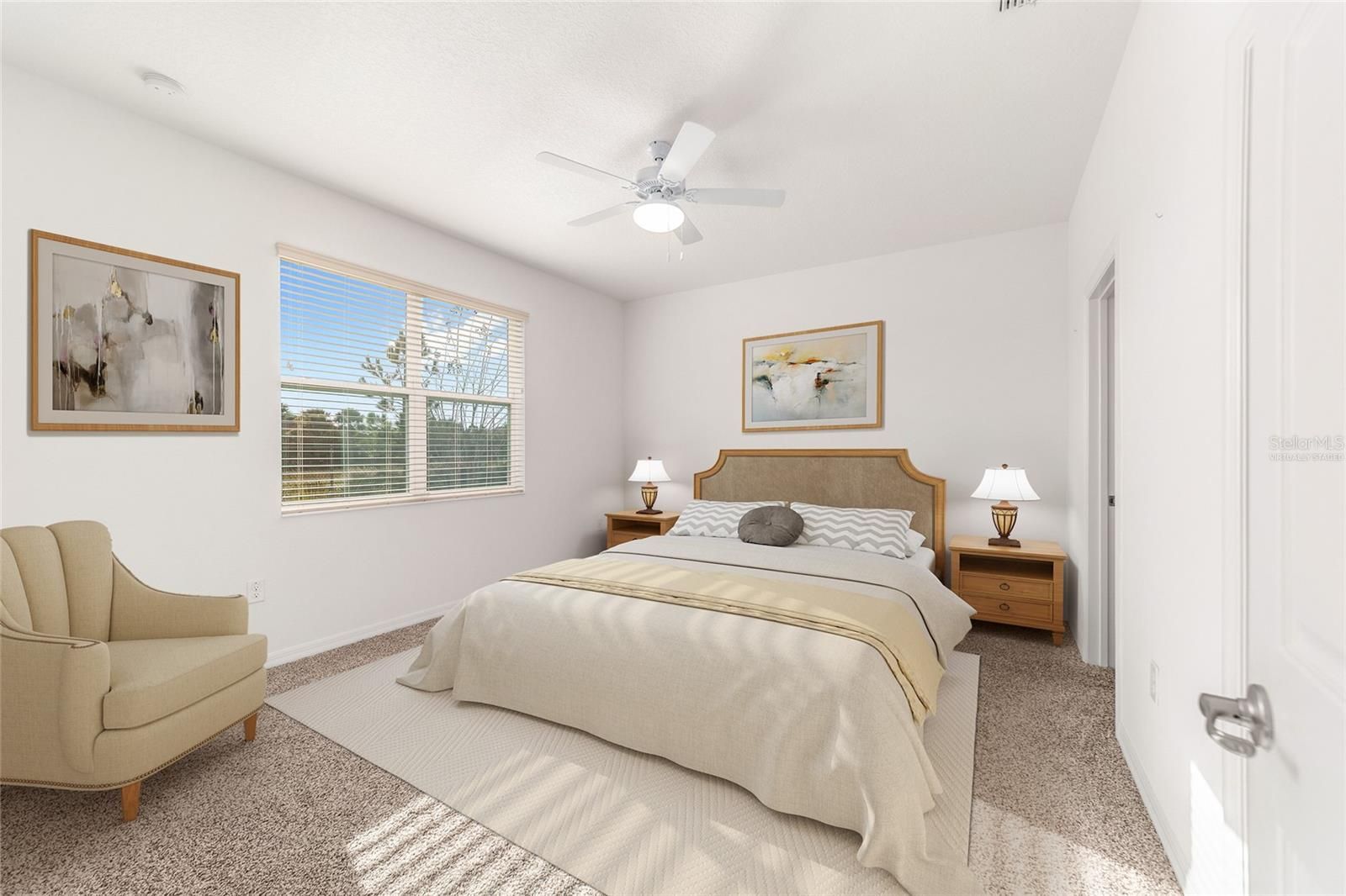 - Ceiling Fan(s), High Ceilings, Open Floorplan, Main Level Primary, Solid-Wood Cabinets, Split Bedrooms, Stone Counters, Thermostat, Walk-In Closet(s), Window Treatments