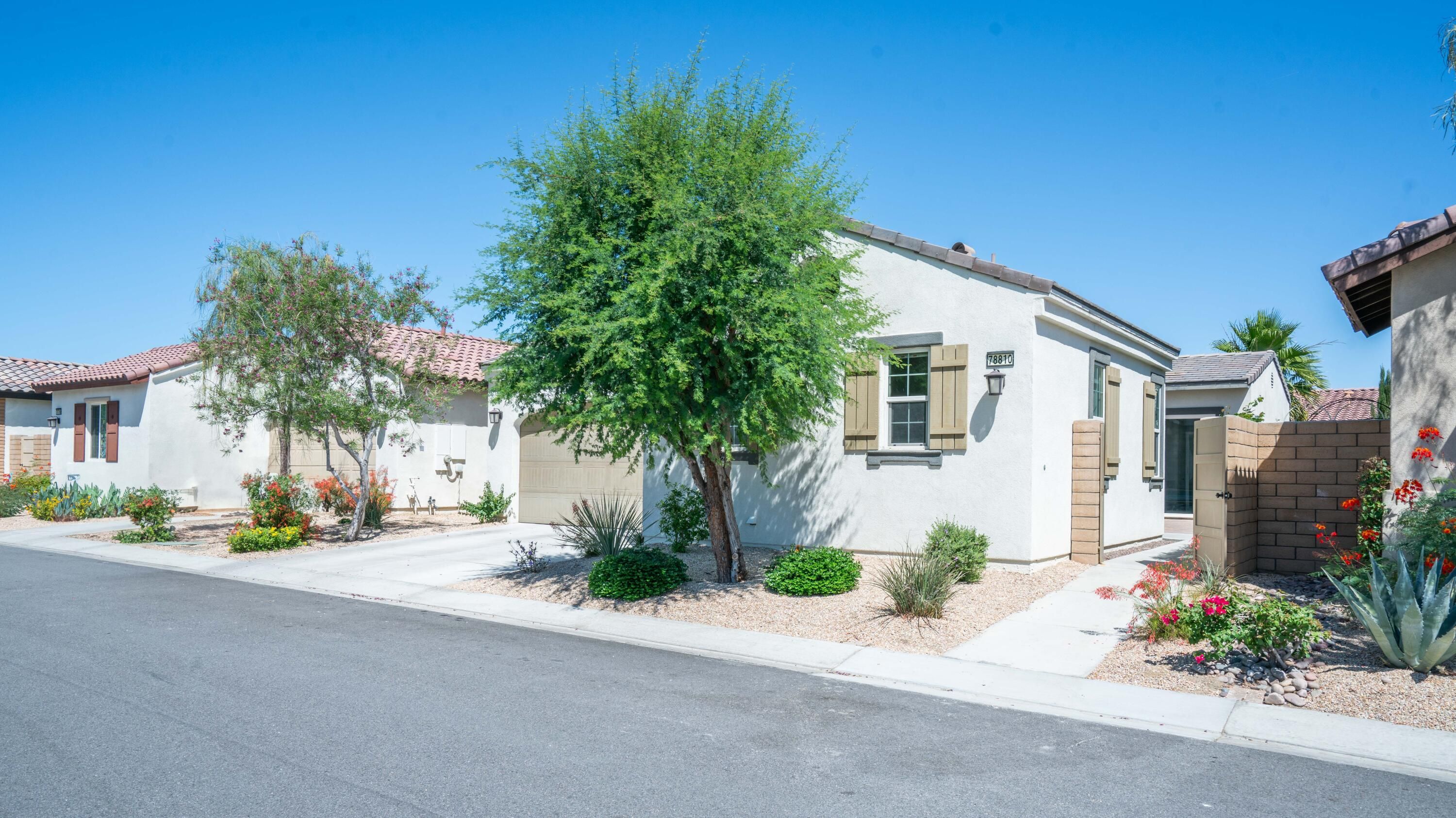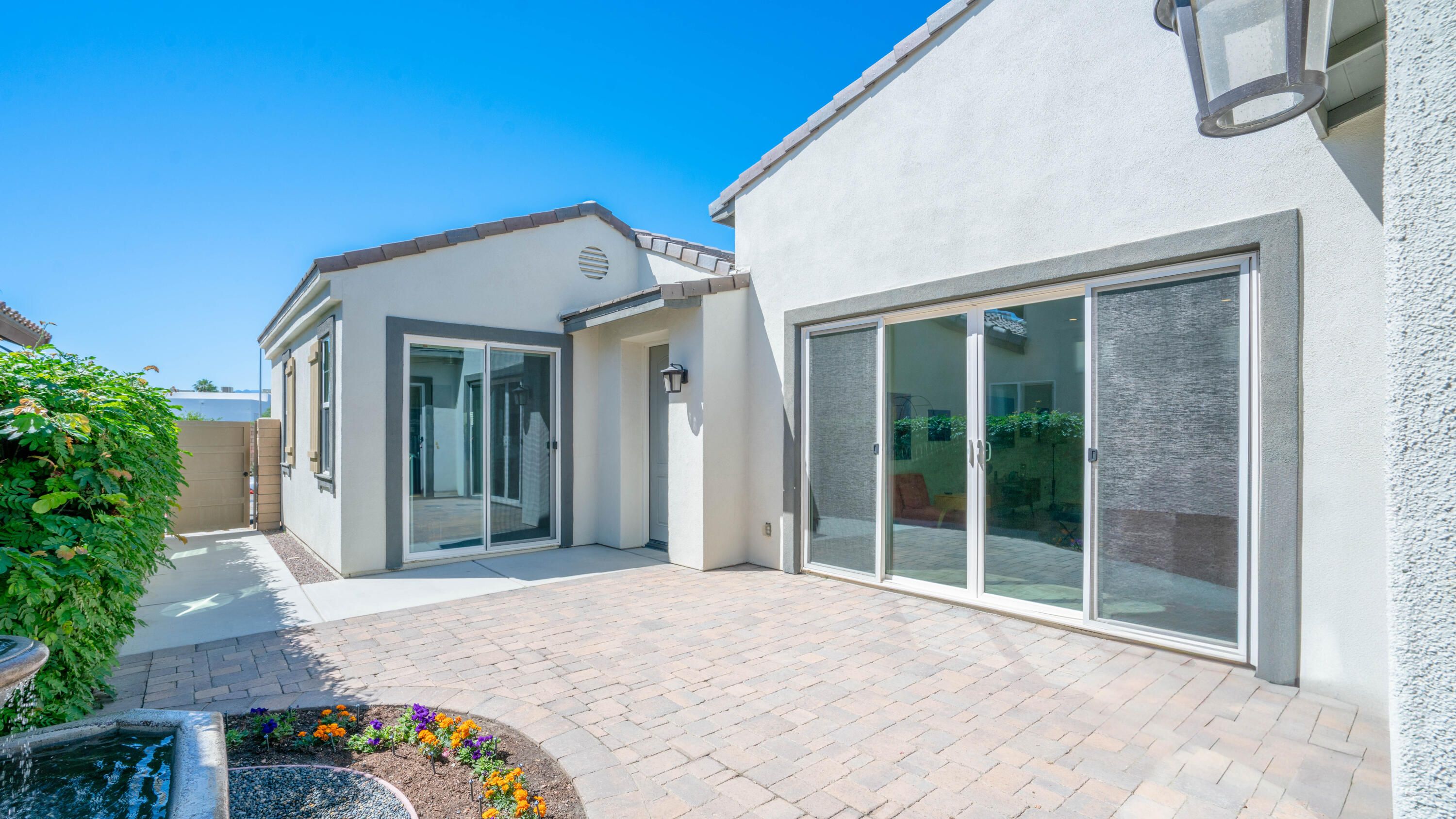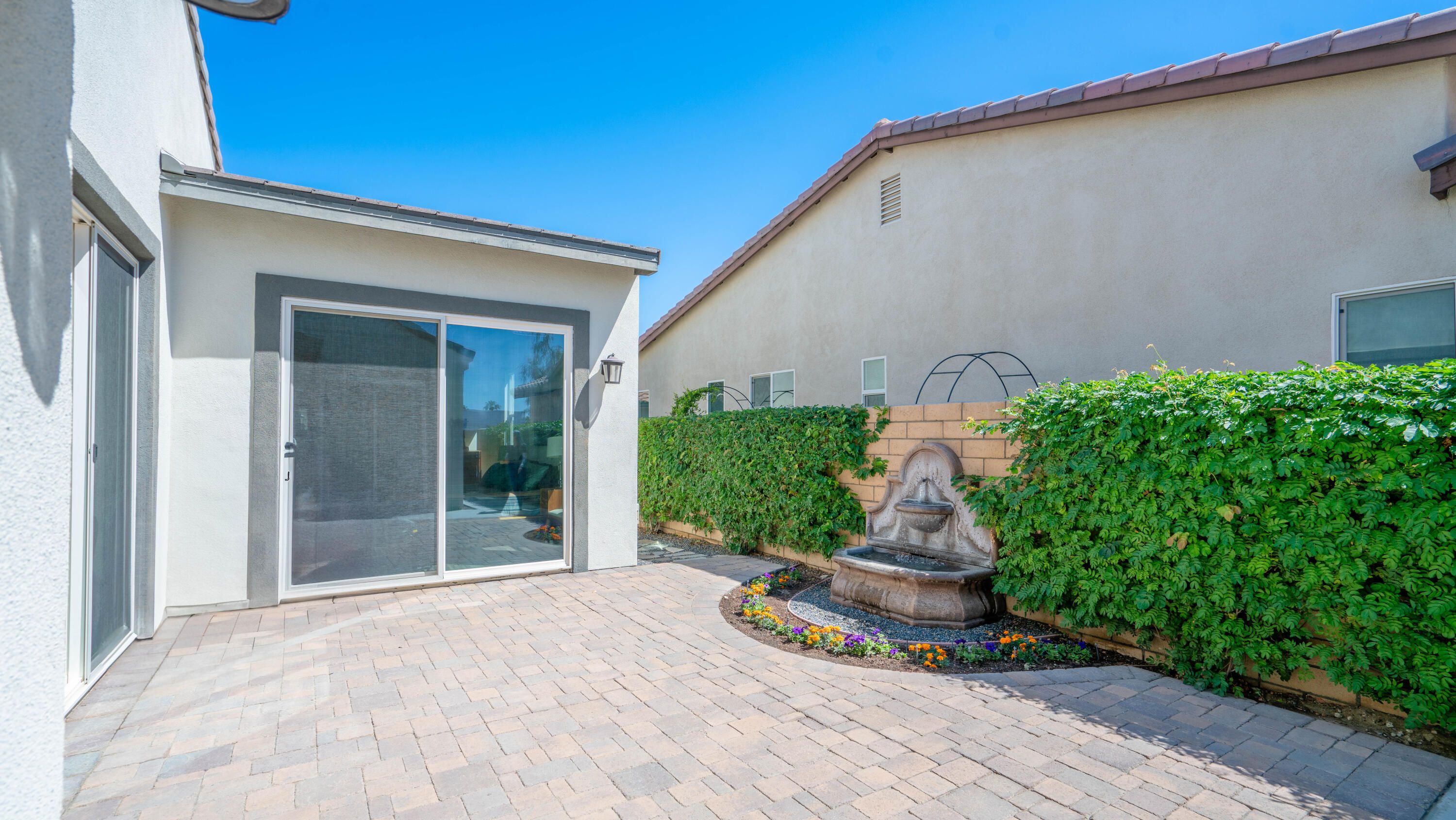 Comfortable, Low Maintenance Desert living at Domani 55+ Resort Style community. This 3 Bedrooms, 3 ½ Bath, 2 car Garage offers a great mix of style and practicality. Imperial Irrigation District (IID) means Lower electric cost. A standout feature is the Guest bedroom with its own private entrance to the backyard giving visitors extra privacy. Home features open floor plan with vaulted ceilings and a bright, airy feel. Granite countertops in the kitchen with ample sleek cabinetry as well as a pantry. Formal dining area opens to the patio through oversized floor to ceiling sliding doors inviting seamless indoor-outdoor flow. Tile floors throughout the main living area while laminate in the bedrooms. Primary suite is spacious, with a walk in closet and well-appointed bathroom with walk in shower. Each bedroom has its own en-suite bathroom for privacy. Separate laundry room. Landscaping by Tessera creates a welcoming courtyard with pavers and tranquil fountain. Low HOA includes Resort style pool & spa, pickleball and Bocce ball courts, full gym, Conference room, clubhouse, and a gated dog park. Ideally located near shopping, dining, and entertainment. Also, within easy reach of golf courses, Tennis courts, and hiking trails, this home offers the best of desert living in one of Palm Desert's premier 55+ communities.