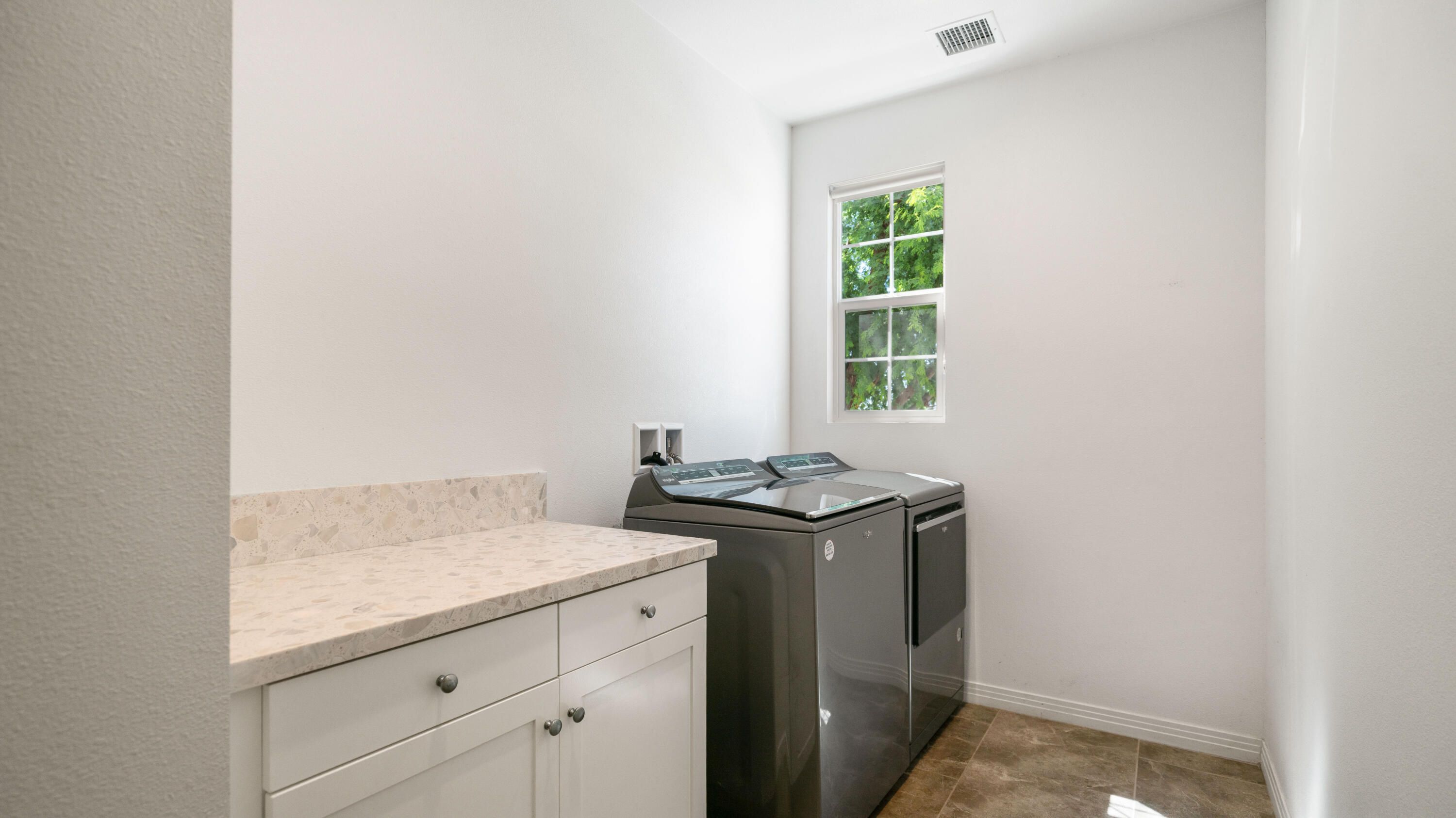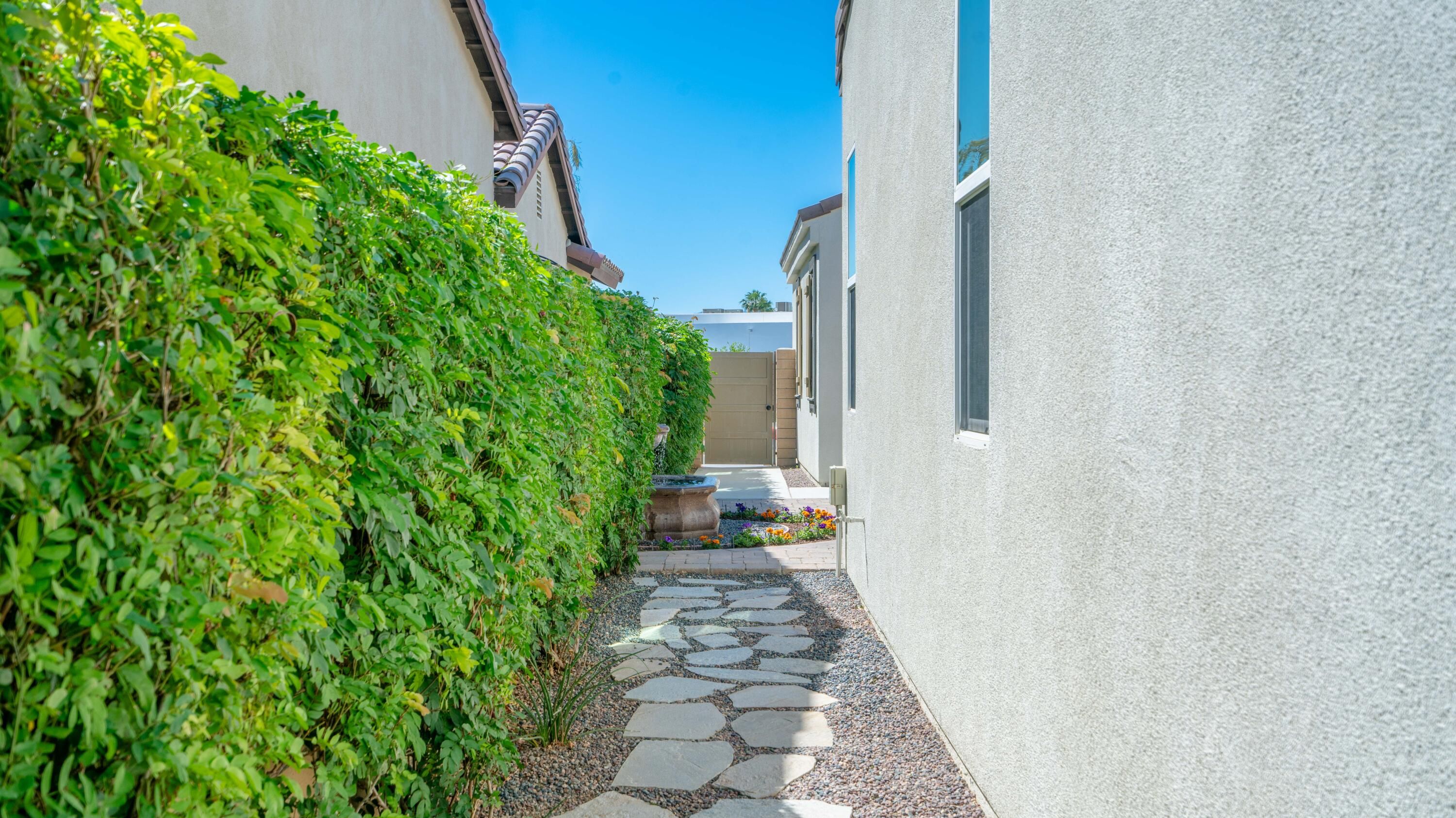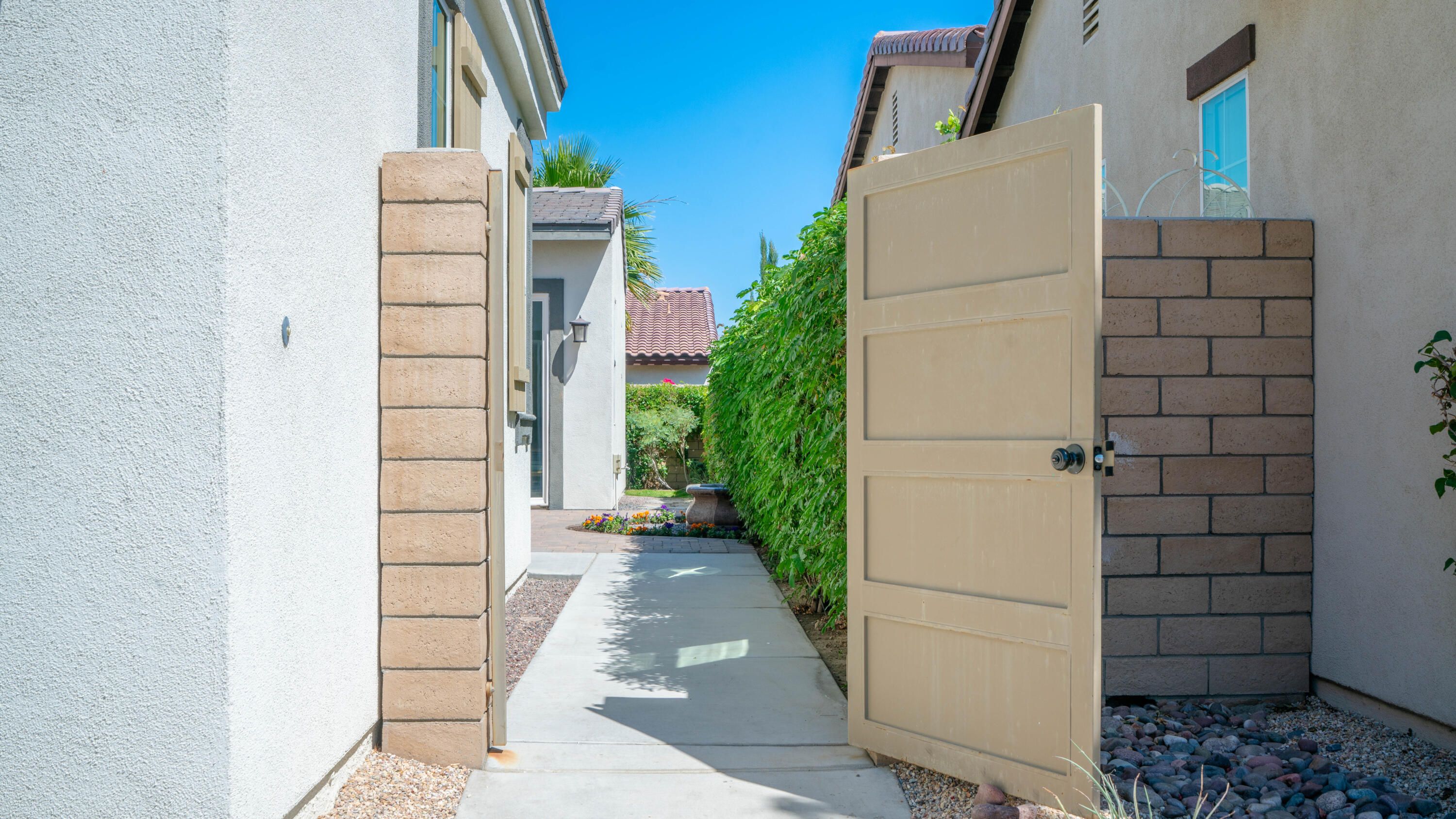 Comfortable, Low Maintenance Desert living at Domani 55+ Resort Style community. This 3 Bedrooms, 3 ½ Bath, 2 car Garage offers a great mix of style and practicality. Imperial Irrigation District (IID) means Lower electric cost. A standout feature is the Guest bedroom with its own private entrance to the backyard giving visitors extra privacy. Home features open floor plan with vaulted ceilings and a bright, airy feel. Granite countertops in the kitchen with ample sleek cabinetry as well as a pantry. Formal dining area opens to the patio through oversized floor to ceiling sliding doors inviting seamless indoor-outdoor flow. Tile floors throughout the main living area while laminate in the bedrooms. Primary suite is spacious, with a walk in closet and well-appointed bathroom with walk in shower. Each bedroom has its own en-suite bathroom for privacy. Separate laundry room. Landscaping by Tessera creates a welcoming courtyard with pavers and tranquil fountain. Low HOA includes Resort style pool & spa, pickleball and Bocce ball courts, full gym, Conference room, clubhouse, and a gated dog park. Ideally located near shopping, dining, and entertainment. Also, within easy reach of golf courses, Tennis courts, and hiking trails, this home offers the best of desert living in one of Palm Desert's premier 55+ communities.