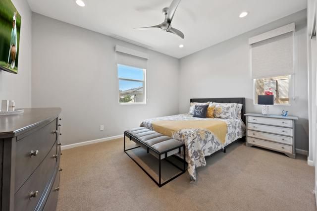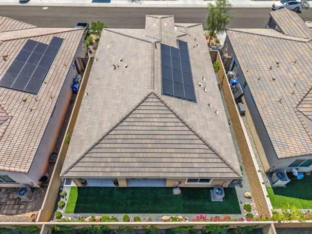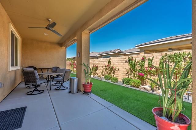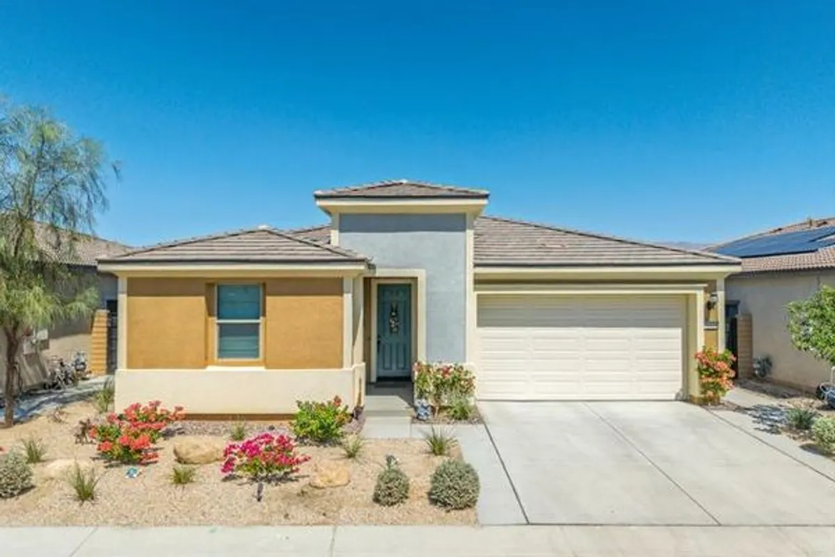 Welcome to Domani, Palm Desert's premier 55+ community, offering resort-style living at one of the best values in the desert with low HOA dues and incredible amenities. This beautifully maintained home features the sought-after Belwood floor plan by Pulte Homes, a favorite for its open concept design and the highly desired flex room, perfect as a home office or optional third guest bedroom. This property is especially unique as it offers an extended driveway, providing additional parking space--an uncommon and highly desirable feature within the community. Inside, thoughtful upgrades include a whole-home water softener, indoor water filtration/softner systems, tankless water heater, fire sprinkler system, custom shades throughout, freshly painted interiors, and ceiling fans in both bedrooms as well as the gathering room. The garage has been enhanced with an epoxy-coated floor, insulated garage door, and its own dedicated air conditioning system, while the entire home has been outfitted with rain gutters for added protection and peace of mind. Outdoors, enjoy custom desert-friendly, low-maintenance landscaping accented by fruit-bearing trees, creating a relaxing desert retreat. The driveway has also been extended giving you more room. Enjoy offsetting your electricity costs with your Sun Run Solar panels. As a resident of Domani, you'll have exclusive access to over 5,000 square feet of community amenities, including a stylish clubhouse with fitness center, resort-style pool and spa with patio, outdoor fireplace lounge, bocce and pickleball courts, and beautiful park spaces--all within the privacy of a gated community. Offering style, comfort, and lifestyle at an unbeatable value, this home is the perfect opportunity to enjoy the best of Palm Desert living.