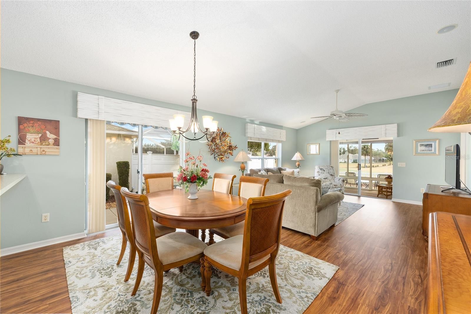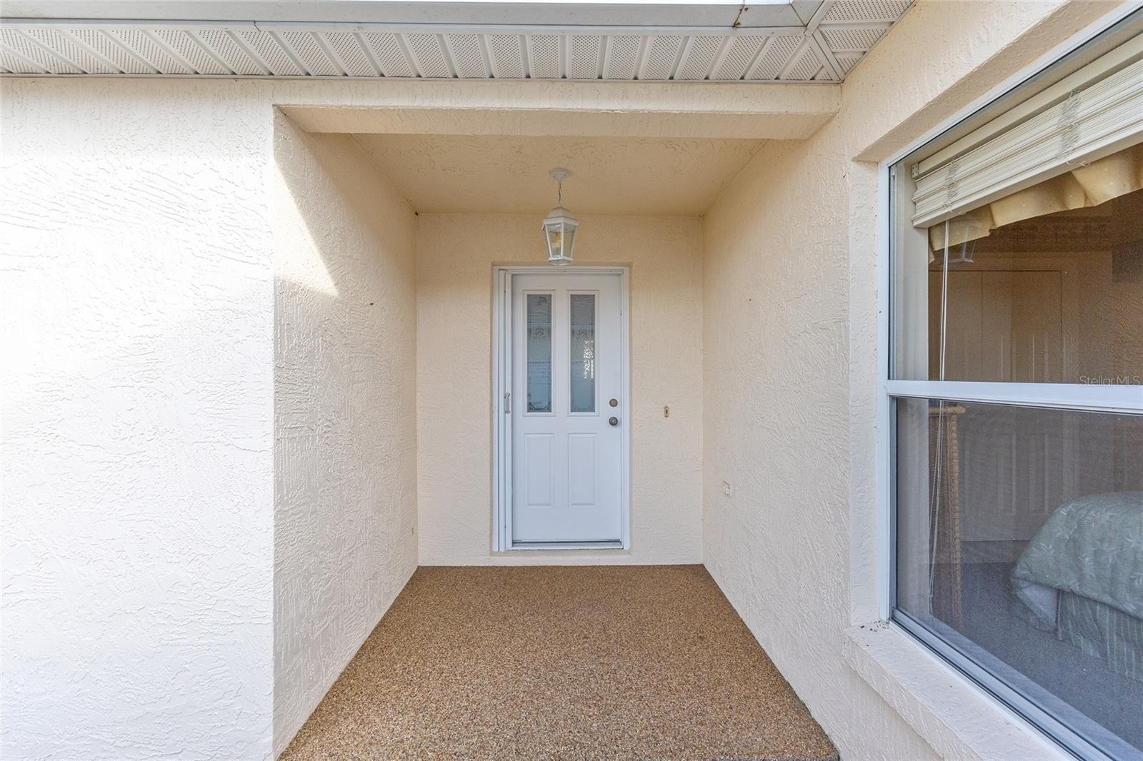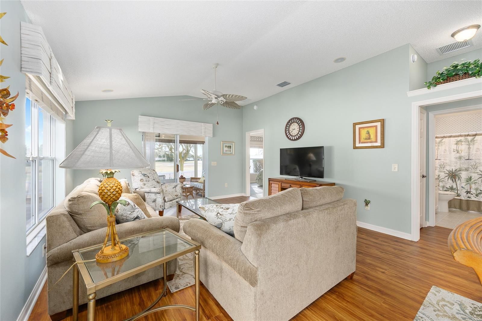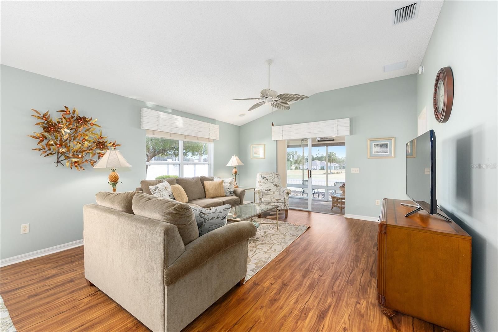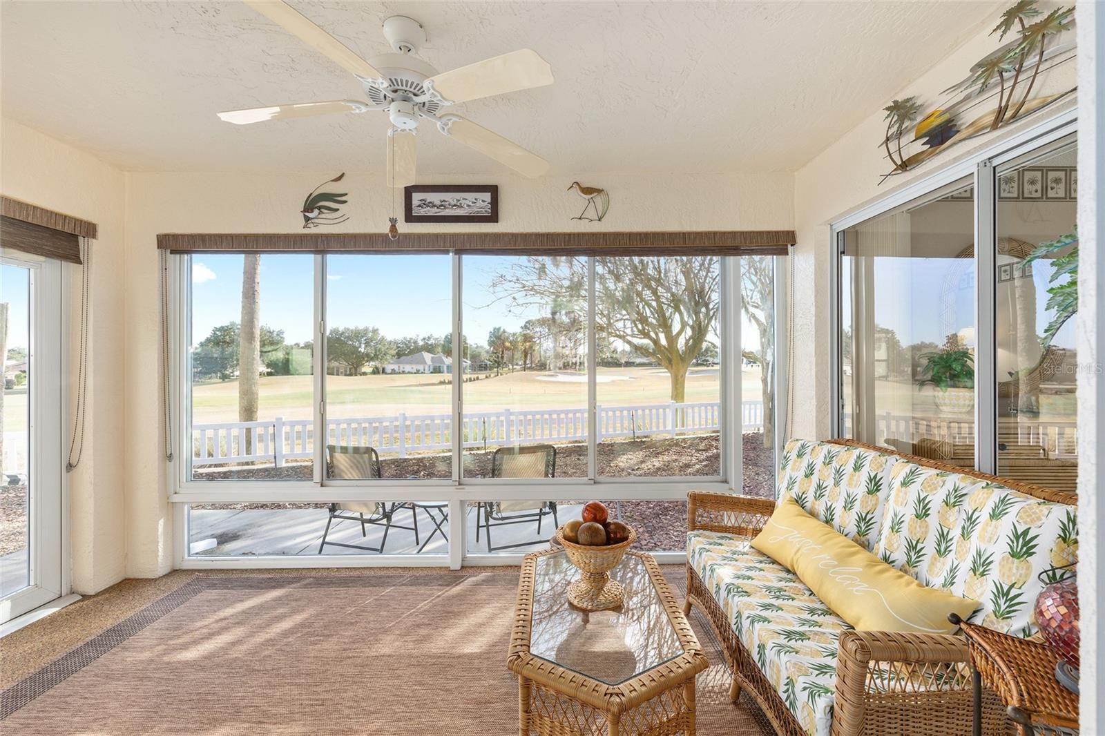 TURNKEY & MOVE-IN READY ~ BOND PAID ~ ROOF (2020) ~ HVAC (2019) ~ HWT (2023) ~ EXPERIENCE the ultimate VILLAGES LIFESYTLE in this IMMACULATE FOXGLOVE courtyard villa, perfectly positioned on a PREMIUM GOLF FRONT homesite with STUNNING DOUBLE FAIRWAY VIEWS This 3-bedroom, 2-bathroom gem offers 1,415 square feet, PLUS the extra GLASS ENCLOSED LANAI area of 135 square feet and is truly MOVE-IN-READY. Lovingly maintained by its original owners as a seasonal residence, this home is in PRISTINE CONDITION and comes complete with UPSCALE FURNISHINGS. The thoughtfully updated interior features elegant LVP FLOORING throughout the LIVING areas, while the glass-enclosed lanai provides a comfortable year-round space to enjoy those BREATHTAKING GOLF COURSE VISTAS. Step outside to the dining room patio, where an ELECTRIC SUNSETTER AWNING offers the perfect blend of sun and shade for outdoor entertaining. PEACE OF MIND comes standard with a newer roof (2020) featuring a RADIANT BARRIER in the ATTIC for enhanced energy efficiency, plus an HVAC system (2019) and paid bond! The convenient location puts you close to recreational facilities, medical services, and shopping, making everyday living a breeze. This is a rare opportunity to own a turnkey villa in pristine condition with COVETED GOLF COURSE VIEWS. Don't miss your chance to call this beautiful home truly yours! Please note: all measurements are taken from public records, buyer to verify.