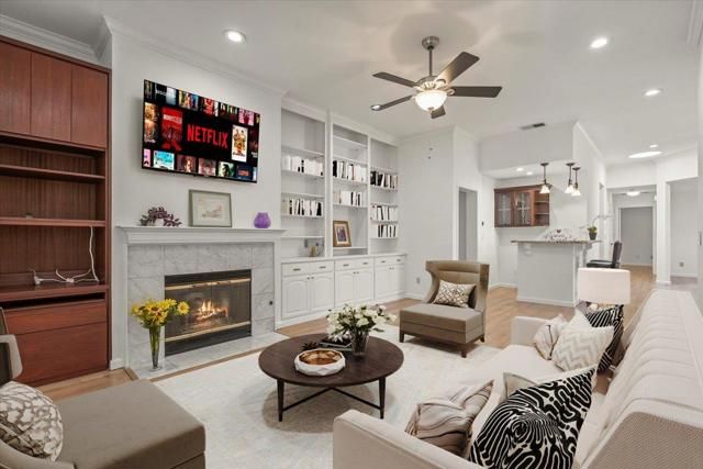 Beautiful Highland Village home. 2 bedrooms plus office and 2 1/2 Baths. Oversized 2 car garage. End unit with back deck overlooking canyon with a stream. Newly remodeled baths with heated floors in the master bath, water filter & cooler, new lighting, and plenty of storage. Newer engineered flooring throughout in the living areas, freshly painted interior. Stainless steel kitchen appliances. Fireplace in the living room for cozy evenings. Built in bar with cabinets. Office features a sit on bench by window and plantation shutters. Remote controlled European rolling shutter on west wall of home. The Villages HOA fee includes golf membership * 24 hr. security * water/sewer/Cable TV/community newspaper * 4 swimming pools w/hot tubs * 6 tennis courts * bocce ball courts * 4 pickle ball courts * Exercise Facility * Library * US Post Office * restaurant & bistro. There are over 60 organized Clubs to join. A Community Activity office that has Special Events & Excursions. It is resort style comfort living with too many amenities to lists them all! A great feeling of safety from 24 hour security at gate. Must see this home, great location and an excellent value.