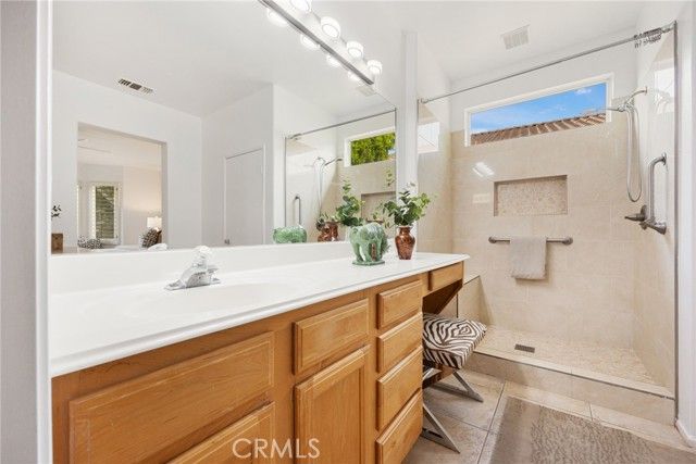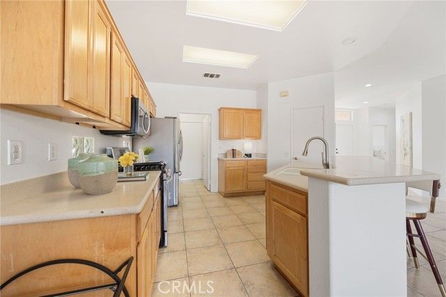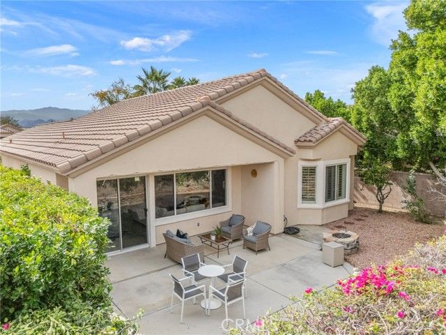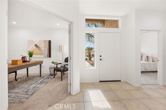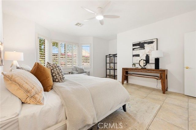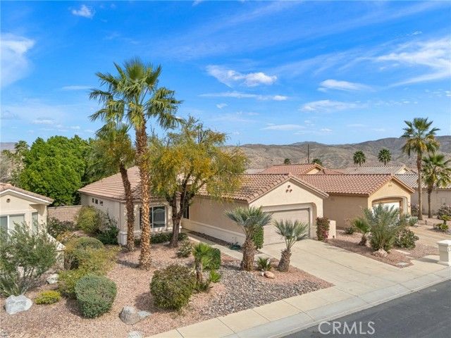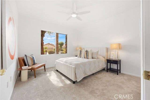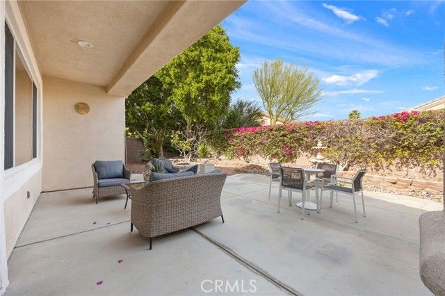 Desert living meets resort-style amenities in this thoughtfully maintained single-level residence located within the gated, 55+ community of Sun City Palm Desert. Offering approximately 1,680 square feet with three bedrooms and two full baths, this home delivers comfortable interiors paired with an active, amenity-rich lifestyle. Bright, open living spaces connect seamlessly to the backyard through expansive sliding glass doors, creating an effortless indoor-outdoor flow ideal for relaxed desert living. Neutral tile flooring and abundant natural light provide a fresh, inviting atmosphere throughout the main living areas. Kitchen is centrally positioned with generous cabinetry, ample counter space, stainless steel appliances, gas range, and breakfast bar seating. Adjacent dining space overlooks the covered patio and garden. Primary suite offers privacy and comfort with plantation shutters, a spacious layout, extended dual-sink vanity, dedicated vanity area, large walk-in shower with bench seating, and substantial walk-in closet. One secondary bedroom is currently configured as a dedicated office, providing flexibility for remote work or creative space. Additional guest bedroom and full bath complete the interior. Covered patio opens to a private backyard accented by a decorative fountain and low-maintenance desert landscaping—creating a peaceful outdoor retreat ideal for morning coffee or evening relaxation. Sun City Palm Desert is a guard-gated, age-qualified community offering two 18-hole golf courses, three clubhouses, multiple fitness centers, indoor and outdoor pools, tennis and pickleball courts, bocce ball, over 80 social clubs, on-site dining, and miles of walking paths. Residents enjoy an active, socially connected environment just minutes from shopping, dining, and medical facilities in Palm Desert.