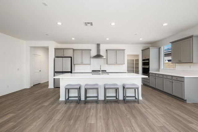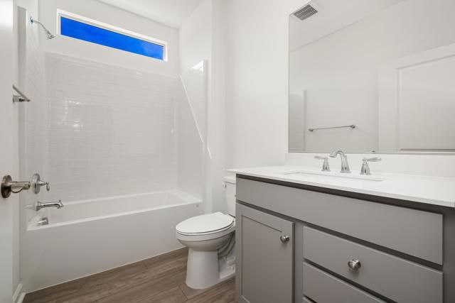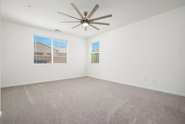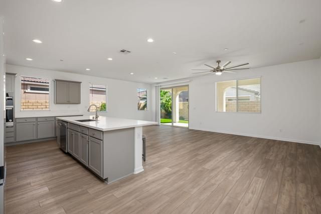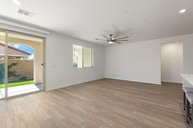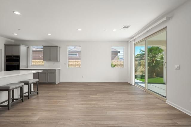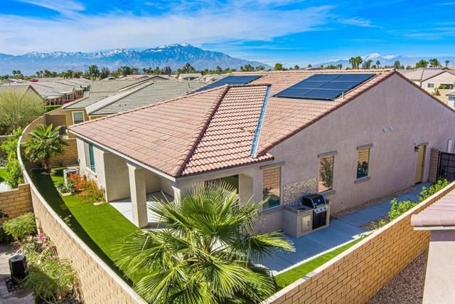 Welcome to refined desert living in this beautifully crafted newer construction residence, located in the attractive Domani Palm Desert, perfectly positioned within a sought-after 55+ community. Thoughtfully designed for both comfort and style, this impressive home offers 3 generously sized bedrooms and 2 contemporary baths, along with the added value of a solar system and cost-efficient IID electric. Step inside to an airy open-concept floor plan highlighted by abundant natural light, recessed lighting, and a designer kitchen featuring stainless steel appliances, quartz countertops, a gas cooktop, expansive pantry, sleek gray cabinetry, and an oversized center island with seating--ideal for effortless entertaining and everyday living. The elegant primary suite serves as a private retreat with a spa-inspired en-suite bath, dual vanities, a glass-enclosed shower, and an expansive walk-in closet, while the secondary bedrooms offer flexibility for guests, hobbies, or a home office. Outdoors, enjoy your own private backyard sanctuary with a covered patio, low-maintenance landscaping, and a built-in BBQ area--perfect for relaxing or hosting gatherings. Located in a peaceful, amenity-rich active adult community near shopping, dining, and recreation, this exceptional home blends modern luxury with the lifestyle today's 55+ buyers are seeking.Home has Solar which is owned.