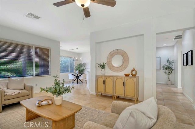 Situated in the heart of Sun City Palm Desert — one of the desert’s most celebrated, resort-style 55+ communities — this beautifully refreshed two-bedroom, two-bath Barbados model offers an inviting blend of comfort, style, and effortless living. A semi-private courtyard with upgraded paver hardscape sets the tone for what’s inside: warm, polished spaces filled with natural light. The home's bright and move-in ready feel is apparent thanks to fresh paint throughout, along with brand-new bedroom carpeting. The open layout is both manageable and functional, with a cheerful living area accented by travertine tile and a newly refined, neutral palette that complements the home’s desert-inspired charm. The spacious owner’s suite overlooks lush plantings and the tranquil backyard, and features an oversized walk-in closet, dual-sink vanity, walk-in shower, and private commode. The guest bedroom offers front-courtyard views and is ideally positioned near the full guest bath. Step outside to a peaceful retreat designed for year-round enjoyment: a covered patio with a dedicated gas line for grilling or a future fire feature is the perfect backdrop for morning coffee or relaxed evenings under the stars. Mature fruit trees add shade, beauty, and seasonal color, creating a truly serene outdoor experience. More than a home, this residence has been thoughtfully cared for and is ready to welcome its next chapter. Three clubhouses, two 18-hole golf courses, an 18-hole putting course, dining venues, pools and spas, a 200-seat theater, softball field, and more than 80 clubs and social groups are all here. Come experience the ease, beauty, and community spirit of Sun City Palm Desert — your well-deserved desert lifestyle awaits.