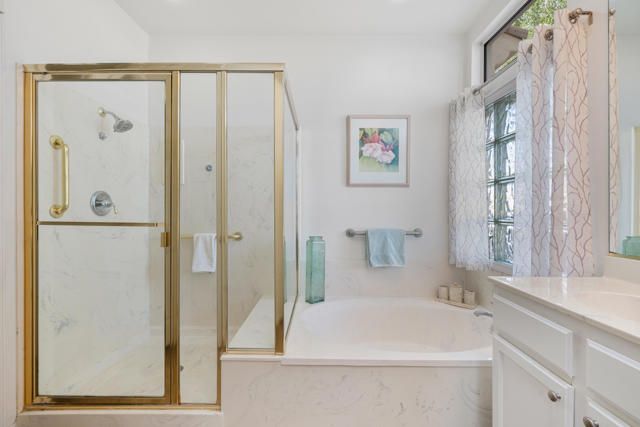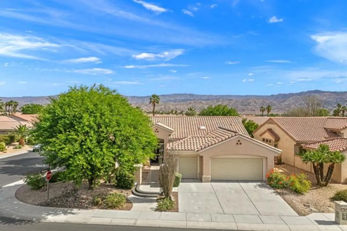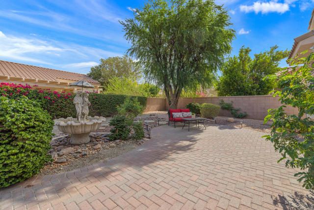 55+ Sun City Palm Desert--The ''Best Bang for your Buck'' in the whole Coachella Valley and beyond. Rarely does an opportunity come along to own one of the most coveted floor plans in this award-winning active lifestyle adult community in the desert. Introducing a truly spectacular Emerald ''Estate'' model home with 3 bedrooms and 3 bathrooms situated on a rare oversized corner lot located close to the main Mountain View Clubhouse. This luxurous home offers unmatched privacy, curb appeal, outdoor living and entertaining potential. You will find premium upgrades featuring a double door entry with custom glass insert, high coffered ceilings, plantation shutters, (4) skylights, wood-like plank tile throughout except guest room, and new HVAC (2025). A gated courtyard leads through double glass doors, opening up to the light and bright main living and dining area, a wall of windows and a sliding door access to the cool north facing backyard. Gather in the heart of the home, the open-concept kitchen and family room that has been transformed with stunning quartz counters, large island offering plenty of workspace perfect for meal prep and entertaining and breakfast bar, white cabinets, double wall ovens, stainless appliances custom farm sink and upgraded faucet. The family room has stylish built-ins and breakfast nook and access to the patio. The master bedroom suite has bay window with a view, bathroom has dual vanity, soaking tub, separate shower, oversized walk-in closet with custom organizing system. The spacious, extended guest suite doubles as an ''attached casita'' with ''french doors'' access to the front courtyard, featuring brand new carpet, closet, and a full bath with tub and shower. The third bedroom is spacious and has an ''en-suite'' half bath that doubles as a guest bath with separate access. The laundry room has washer and dryer, upper cabinets, utility sink, Corian counters and vertical blinds. The extended 2 car plus golf cart garage has overhead storage, storage cabinets. The true highlight of this property is the expansive, private outdoor space taking full advantage of the large corner lot. The backyard is a meticulously maintained oasis with mature desert landscaping and custom pavers, featuring a tranquil water feature, perfect for enjoying a quiet morning coffee or hosting family and neighborhood gatherings.