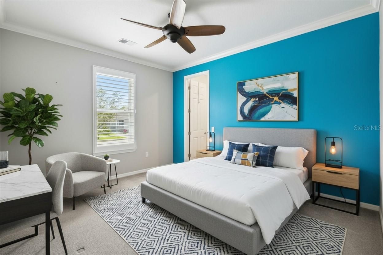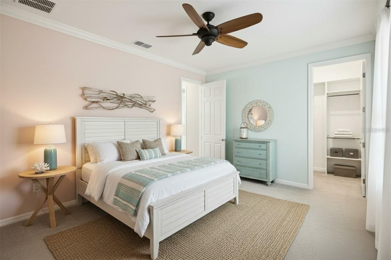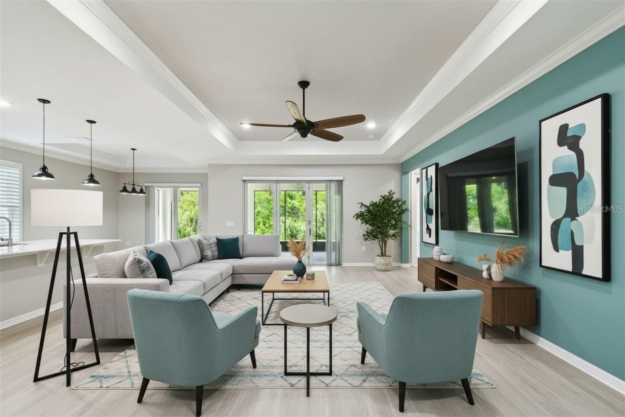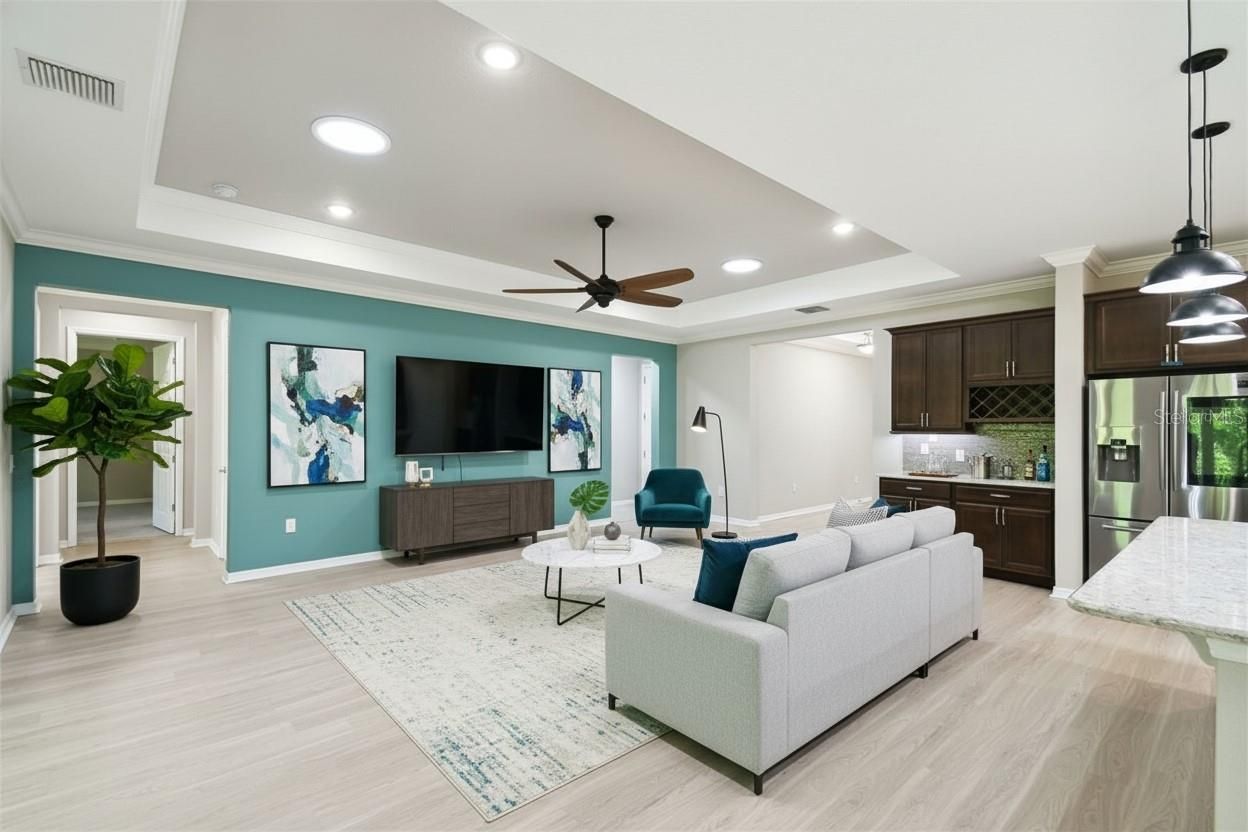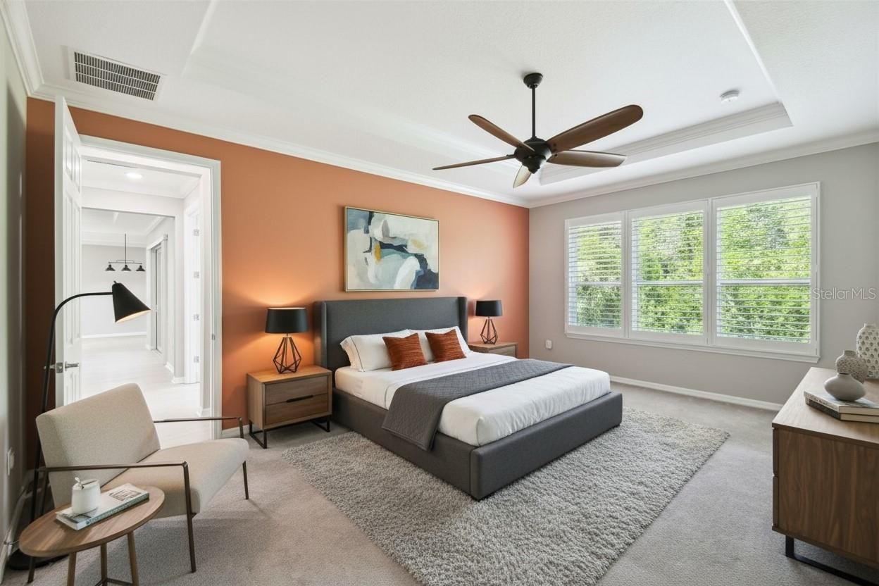 - Ceiling Fan(s), Crown Molding, Kitchen/Family Room Combo, Living/Dining Room, Open Floorplan, Main Level Primary, Solid-Wood Cabinets, Split Bedrooms, Stone Counters, Thermostat, Tray Ceiling(s), Walk-In Closet(s), Window Treatments