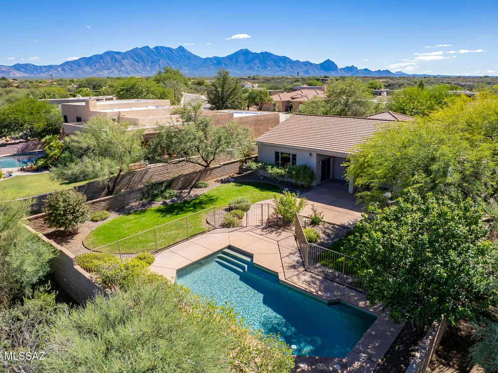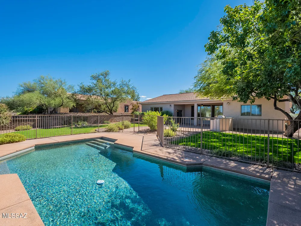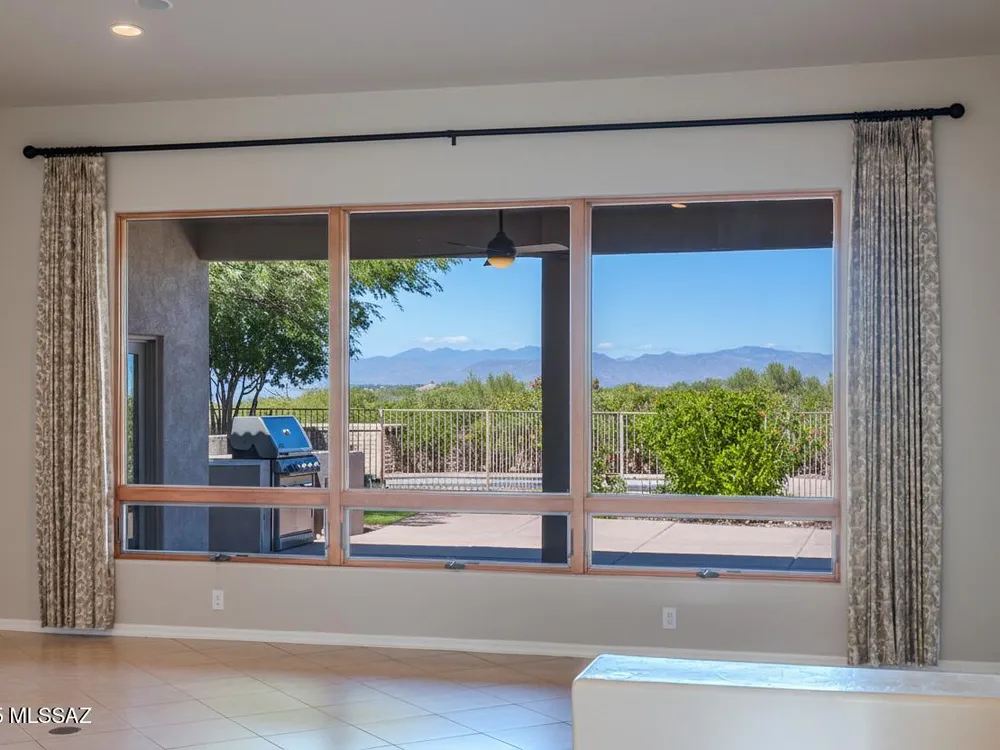 Stunning MOUNTAIN VIEWS create a breathtaking backdrop to this desert oasis! The sparkling pool and lush backyard invite family and friends to play and swim with plenty of room for lawn games and a play structure! The north-facing orientation provides welcoming shade throughout the day, complemented by real grass, mature trees, and a built-in BBQ--creating an ideal space for gatherings. The extended covered patio offers ample space for guests to relax and stargaze, while natural desert barriers ensure privacy on your generous lot. Enter through the shady front courtyard into a spacious living room boasting a wall of windows that showcase your backyard paradise and mountain vistas. Filled with natural light, this room is the heart of the home and is sure to bring the family together for