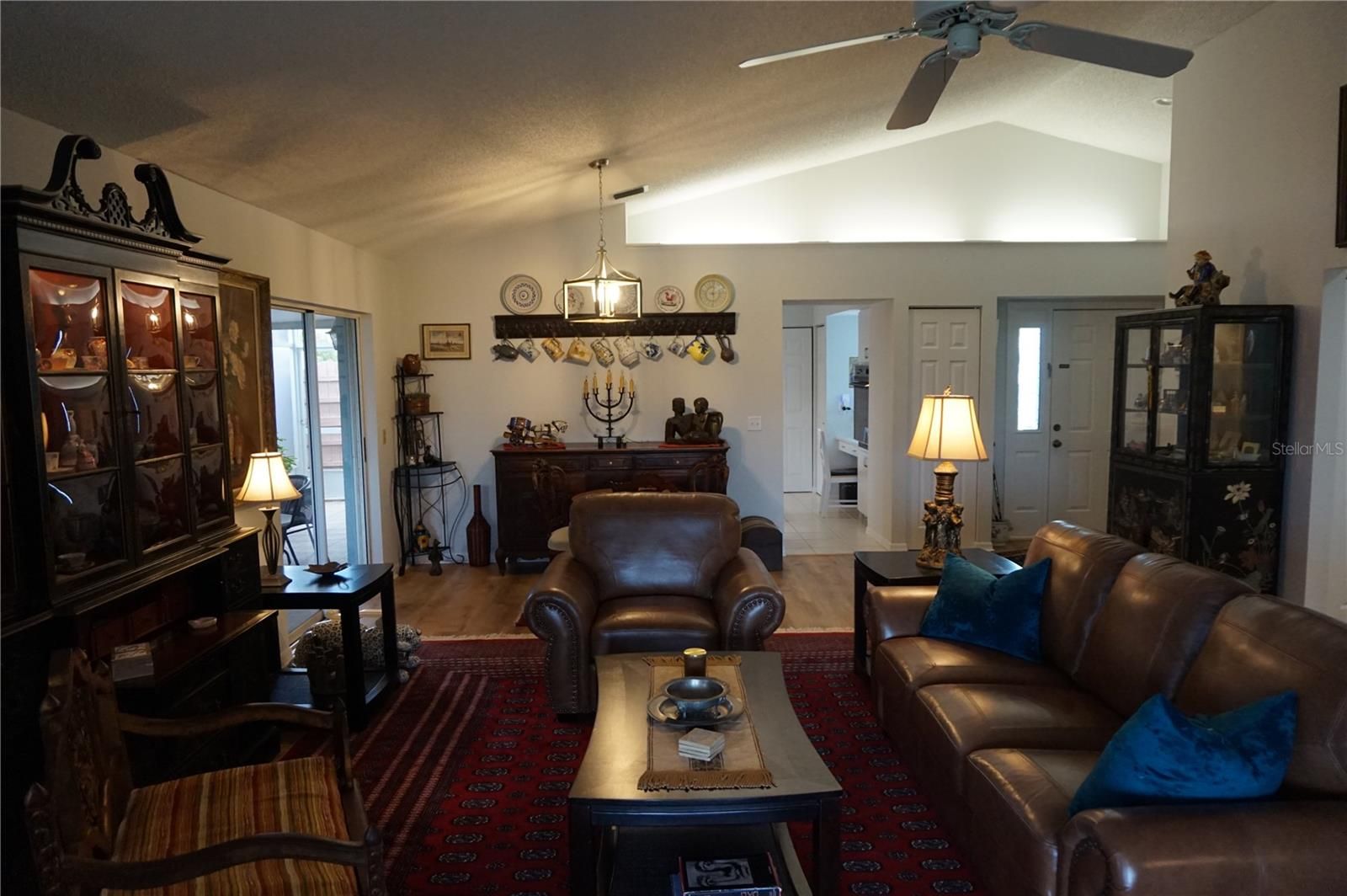- Cathedral Ceiling(s), Ceiling Fan(s), Living/Dining Room, Thermostat, Window Treatments