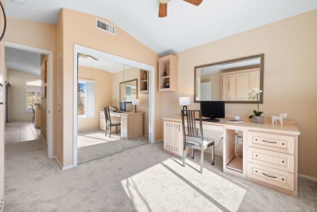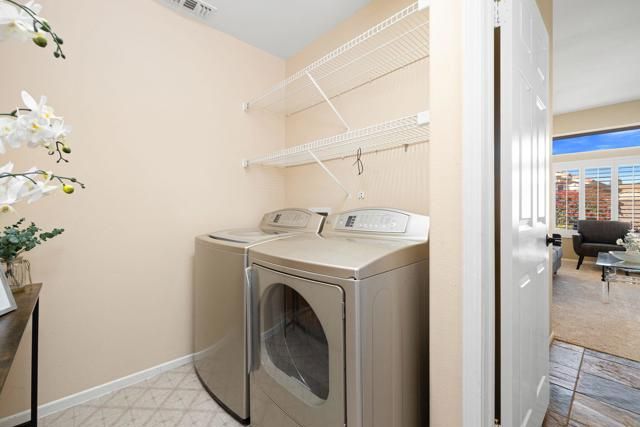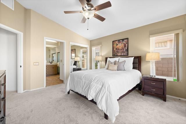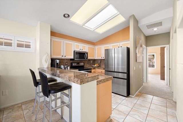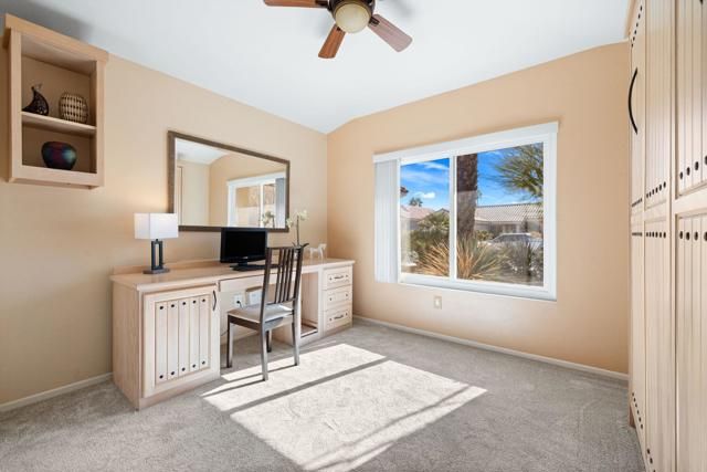 Located in the highly desirable 55+ community of Sun City Palm Desert, this Gorham model is one of the most popular among the smaller floor plans. It has plantation shutters, tile floors, and new carpet throughout, with 2 bedrooms, and 2 bathrooms. The kitchen has stainless steel appliances, an eating bar, a skylight, and it is open to the dining area and the living room. The master suite is roomy with a sliding glass door out to the covered patio. The bathroom has a double vanity, a walk-in shower, and dual closets. The guest bedroom is very cozy, on the opposite side of the home, and is adjacent to the 2nd full bathroom. There is a dedicated laundry room inside, which includes the washer and dryer. The 2 car garage has lots of cabinets, and a tankless hot water heater. The backyard patio is lovely, with a cover across the whole sitting area, perfect for entertaining. The lush desert lansdcaping makes for easy maintenance, or for a perfect lock-and-go home. This is a great home at a great price. SUN CITY PALM DESERT IS ALL ABOUT LIFESTYLE!! It has many clubs, activities, amenities, and low HOA dues. Play at 2 championship 18-hole golf courses and practice facilities, pickle ball, tennis, softball, bocci ball, an 18-hole miniature golf course, an honor library, arts and crafts, a ballroom for special entertainment, and 4 saltwater pools kept at 87 degrees with hot tubs. Enjoy 2 great restaurants, a martini/coffee bar, and even a post office. There is a newly renovated classy indoor/outdoor bar with fire tables to enjoy the awesome views and our beautiful desert weather..