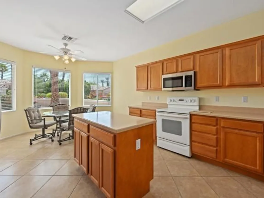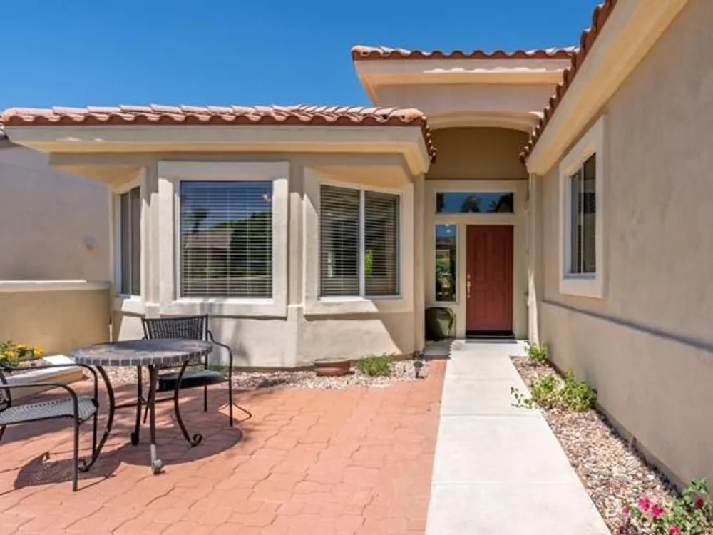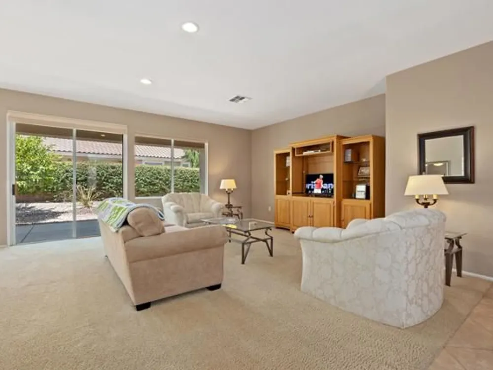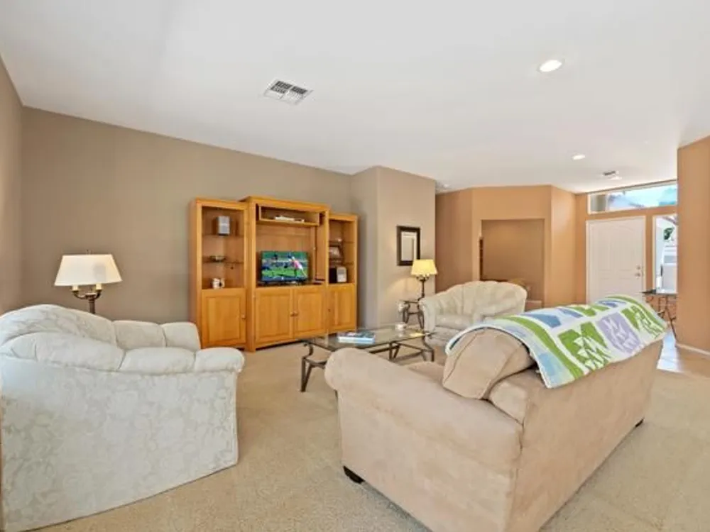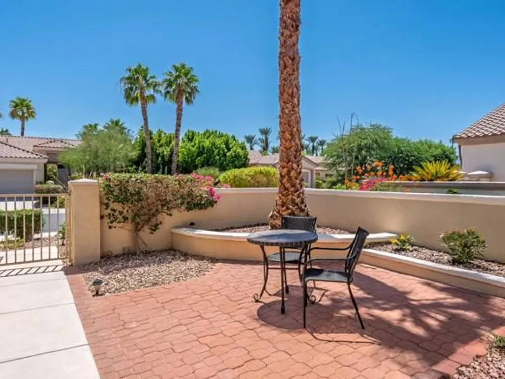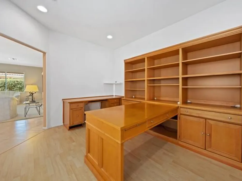 Sun City Palm Desert - St. Croix. Ideally located just down the street from the Lakeview Clubhouse, this sought-after St. Croix floor plan offers comfort, versatility, and style. The home features 2 bedrooms, 2 bathrooms, a spacious den, a bonus/hobby room, and a 3-car garage. The north-facing backyard showcases low-maintenance desert landscaping, including citrus, and an extended patio perfect for outdoor living. A gated south-facing courtyard with paver patio enhances curb appeal while offering a welcoming entry. Inside, the home is clean and ready for your personal touch. Diagonally laid tile flows through much of the home, while the open great room features recessed lighting and direct access to the patio. The kitchen is well-equipped with corian counters, a breakfast bar, center island, pull-out shelving, and maple cabinetry that also extends into the bathrooms. The spacious den sits just off the great room, with the bonus/hobby room beyond--ideal for crafts, fitness, or office space. The primary suite offers laminate wood flooring, patio access, a large walk-in closet with mirrored doors, and an en-suite bath with dual sinks and a stall shower with textured glass doors. The guest bathroom includes a tub/shower combo with cultured marble surfaces, and the guest bedroom features mirrored wardrobe doors. Additional highlights include a laundry room with cabinetry and utility sink, plus a 3-car garage with built-in storage.