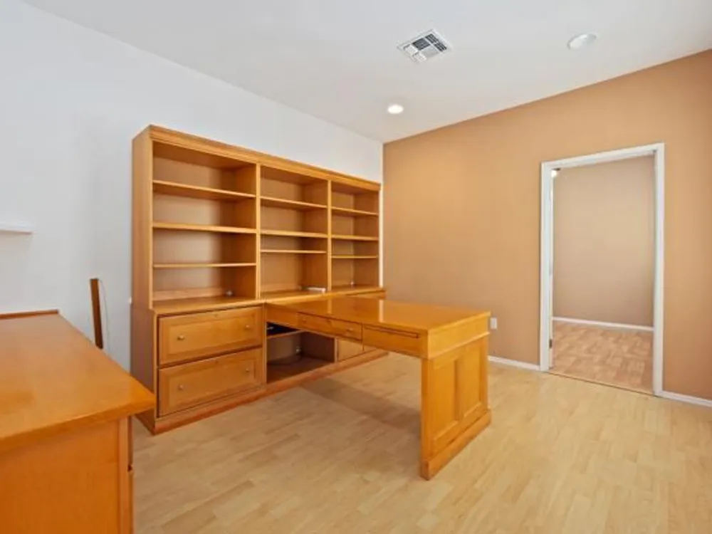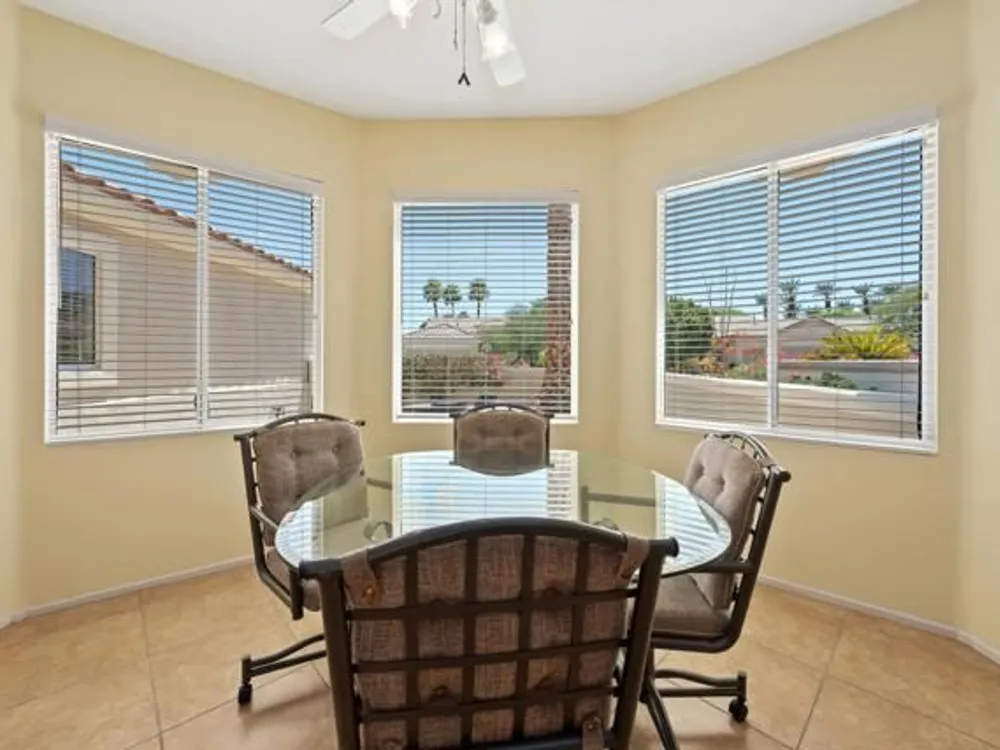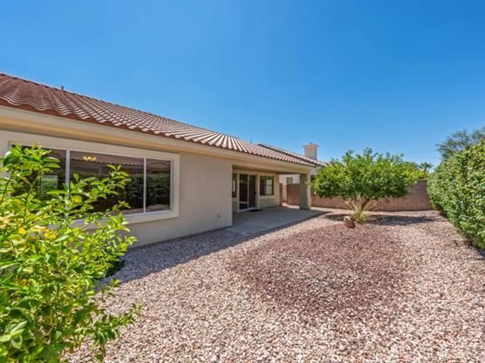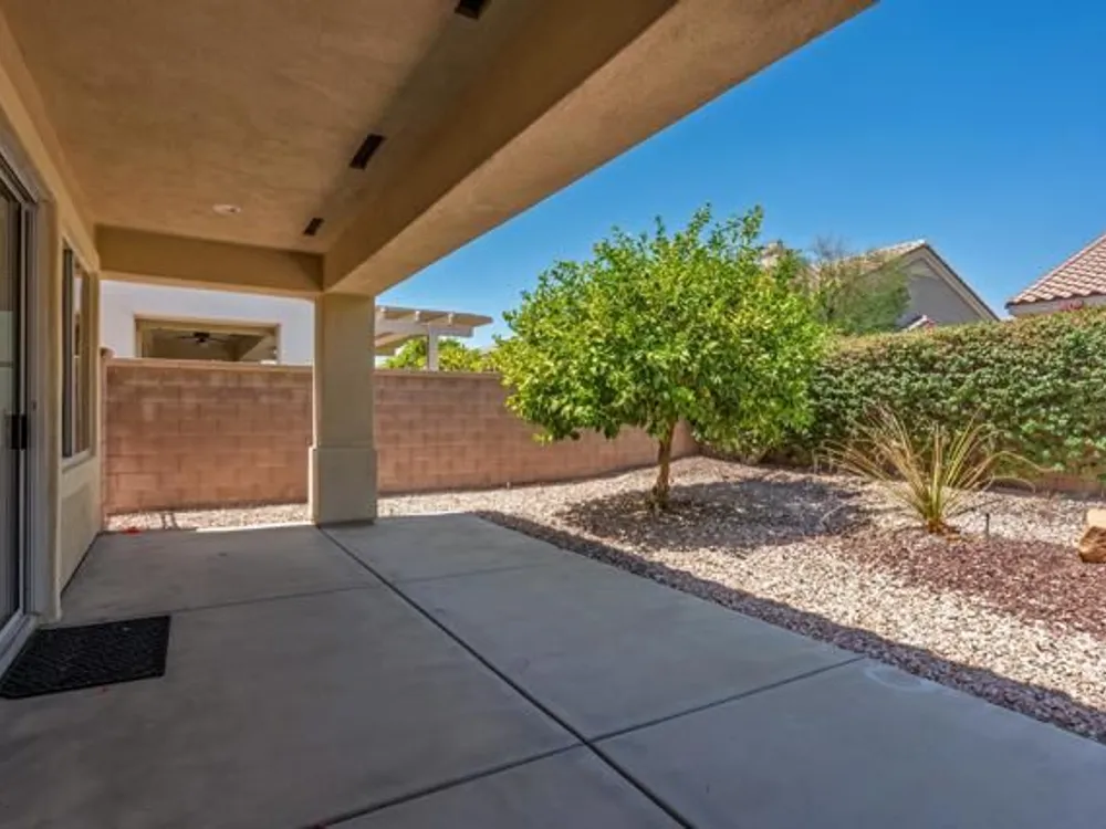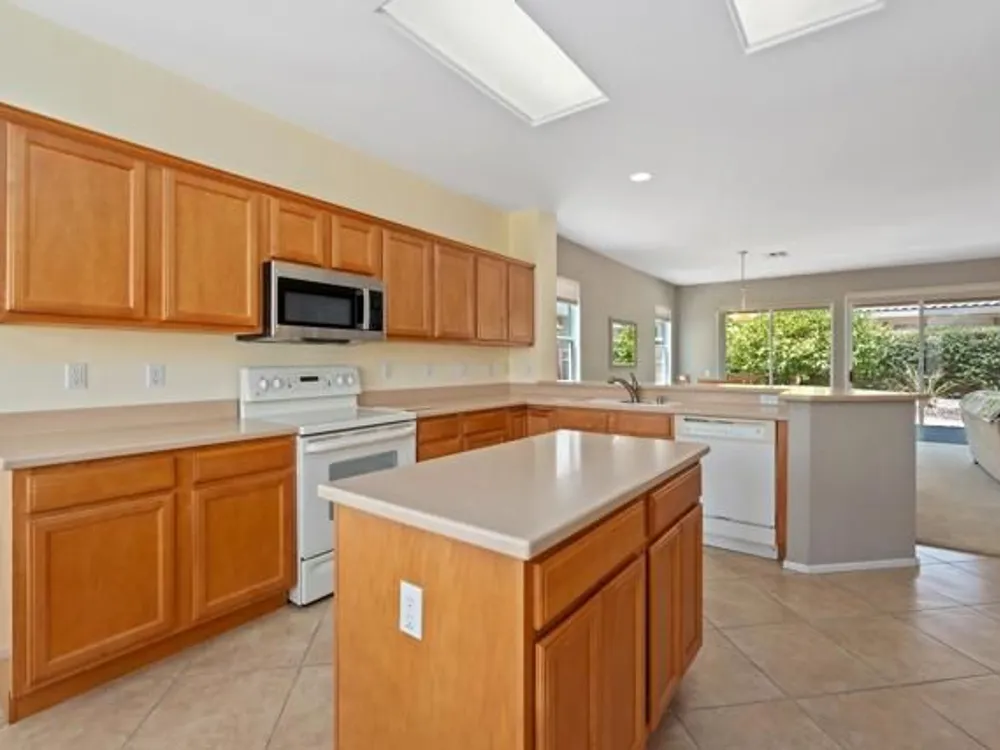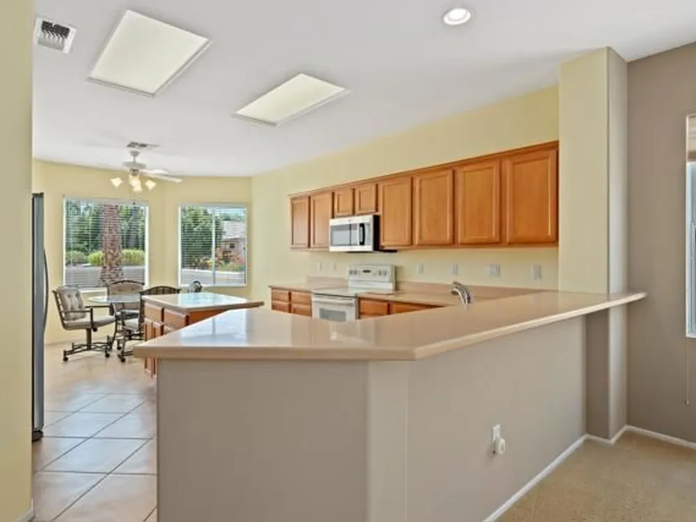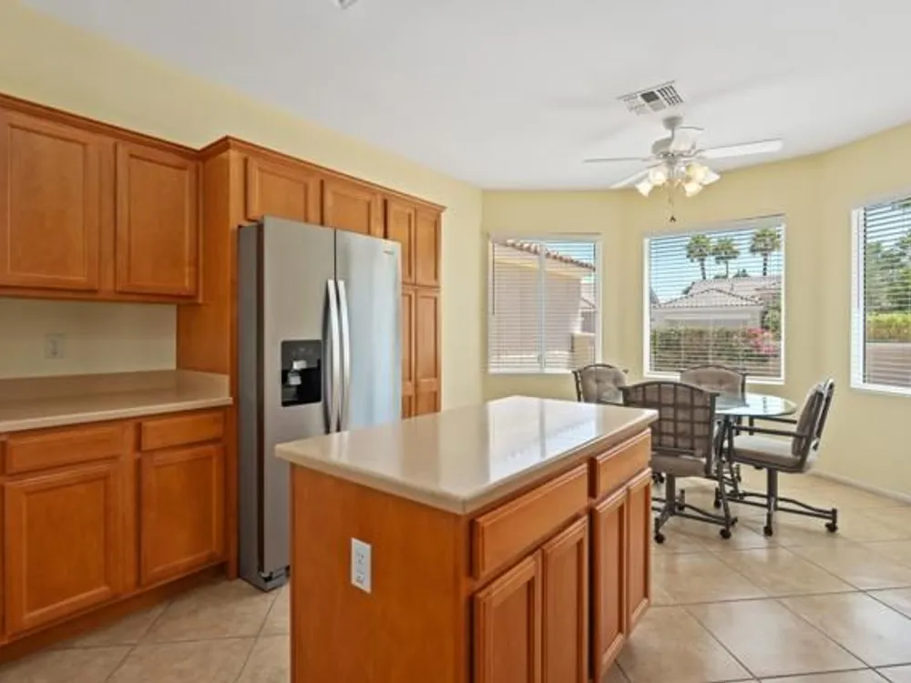 Sun City Palm Desert - St. Croix. Ideally located just down the street from the Lakeview Clubhouse, this sought-after St. Croix floor plan offers comfort, versatility, and style. The home features 2 bedrooms, 2 bathrooms, a spacious den, a bonus/hobby room, and a 3-car garage. The north-facing backyard showcases low-maintenance desert landscaping, including citrus, and an extended patio perfect for outdoor living. A gated south-facing courtyard with paver patio enhances curb appeal while offering a welcoming entry. Inside, the home is clean and ready for your personal touch. Diagonally laid tile flows through much of the home, while the open great room features recessed lighting and direct access to the patio. The kitchen is well-equipped with corian counters, a breakfast bar, center island, pull-out shelving, and maple cabinetry that also extends into the bathrooms. The spacious den sits just off the great room, with the bonus/hobby room beyond--ideal for crafts, fitness, or office space. The primary suite offers laminate wood flooring, patio access, a large walk-in closet with mirrored doors, and an en-suite bath with dual sinks and a stall shower with textured glass doors. The guest bathroom includes a tub/shower combo with cultured marble surfaces, and the guest bedroom features mirrored wardrobe doors. Additional highlights include a laundry room with cabinetry and utility sink, plus a 3-car garage with built-in storage.