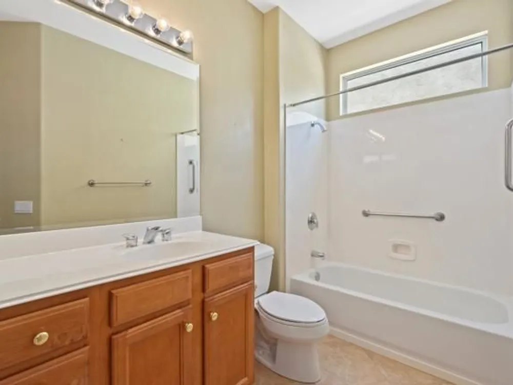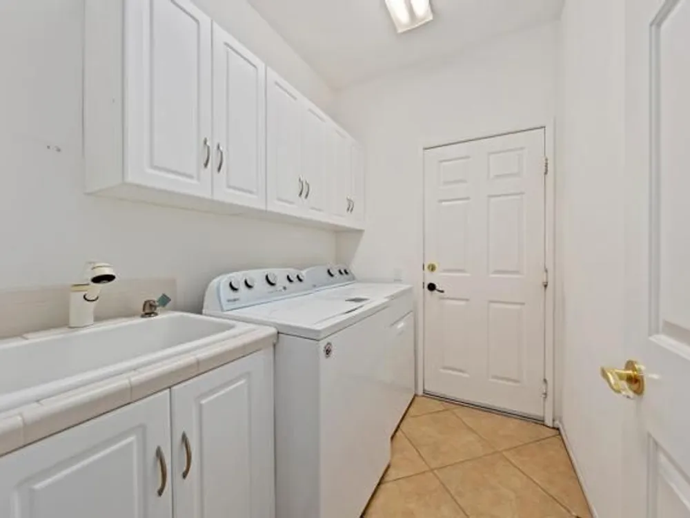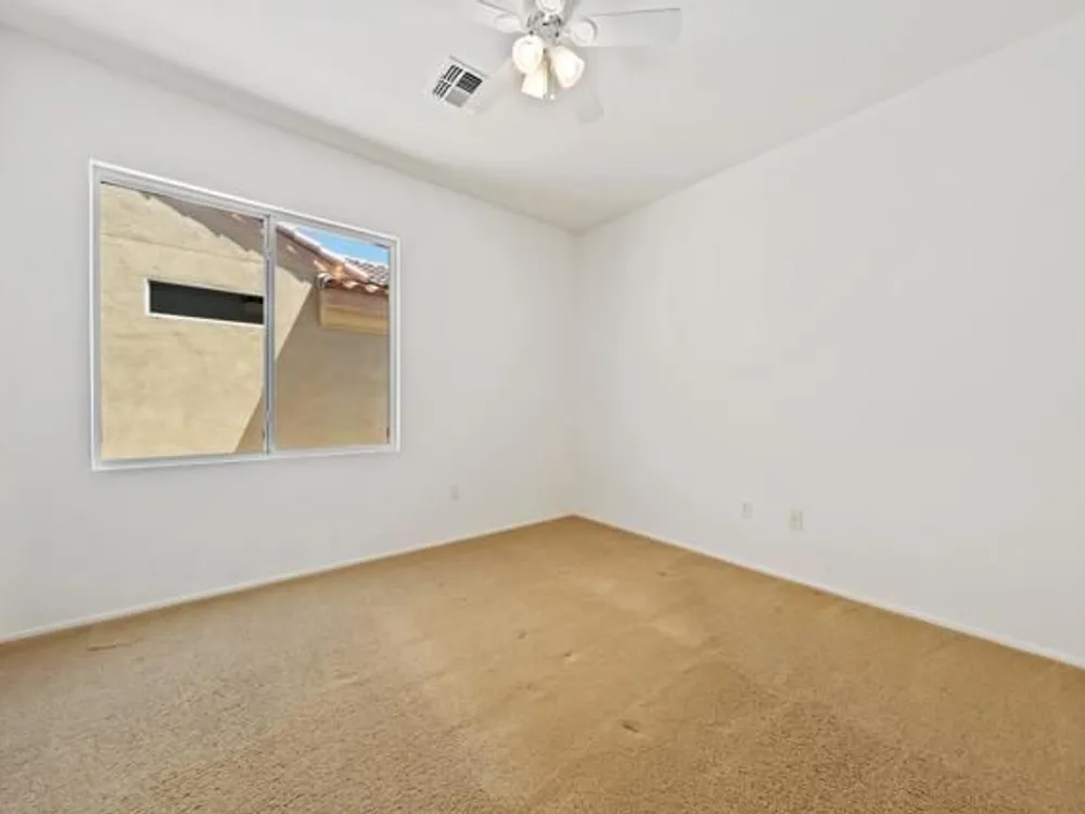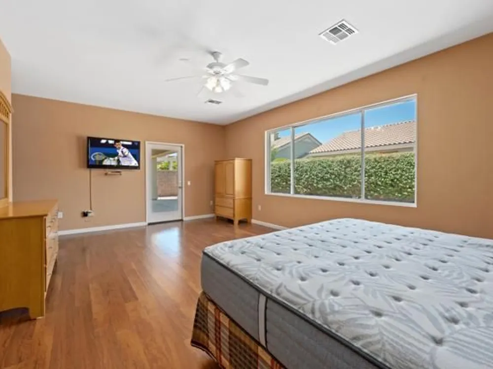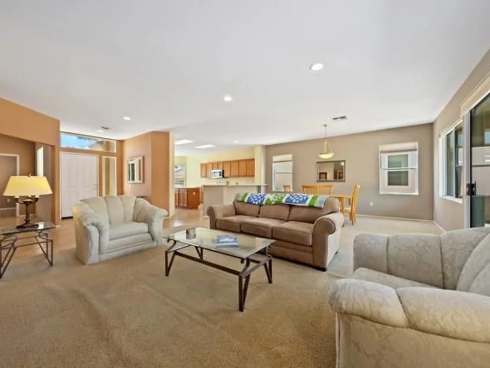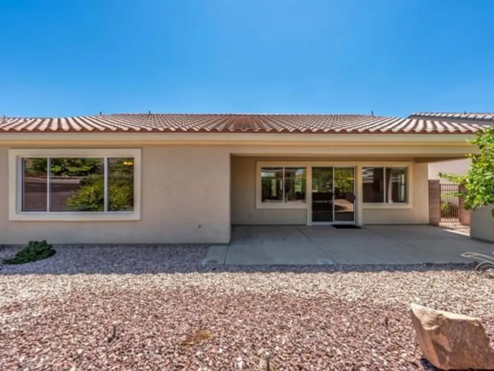 Sun City Palm Desert - St. Croix. Ideally located just down the street from the Lakeview Clubhouse, this sought-after St. Croix floor plan offers comfort, versatility, and style. The home features 2 bedrooms, 2 bathrooms, a spacious den, a bonus/hobby room, and a 3-car garage. The north-facing backyard showcases low-maintenance desert landscaping, including citrus, and an extended patio perfect for outdoor living. A gated south-facing courtyard with paver patio enhances curb appeal while offering a welcoming entry. Inside, the home is clean and ready for your personal touch. Diagonally laid tile flows through much of the home, while the open great room features recessed lighting and direct access to the patio. The kitchen is well-equipped with corian counters, a breakfast bar, center island, pull-out shelving, and maple cabinetry that also extends into the bathrooms. The spacious den sits just off the great room, with the bonus/hobby room beyond--ideal for crafts, fitness, or office space. The primary suite offers laminate wood flooring, patio access, a large walk-in closet with mirrored doors, and an en-suite bath with dual sinks and a stall shower with textured glass doors. The guest bathroom includes a tub/shower combo with cultured marble surfaces, and the guest bedroom features mirrored wardrobe doors. Additional highlights include a laundry room with cabinetry and utility sink, plus a 3-car garage with built-in storage.