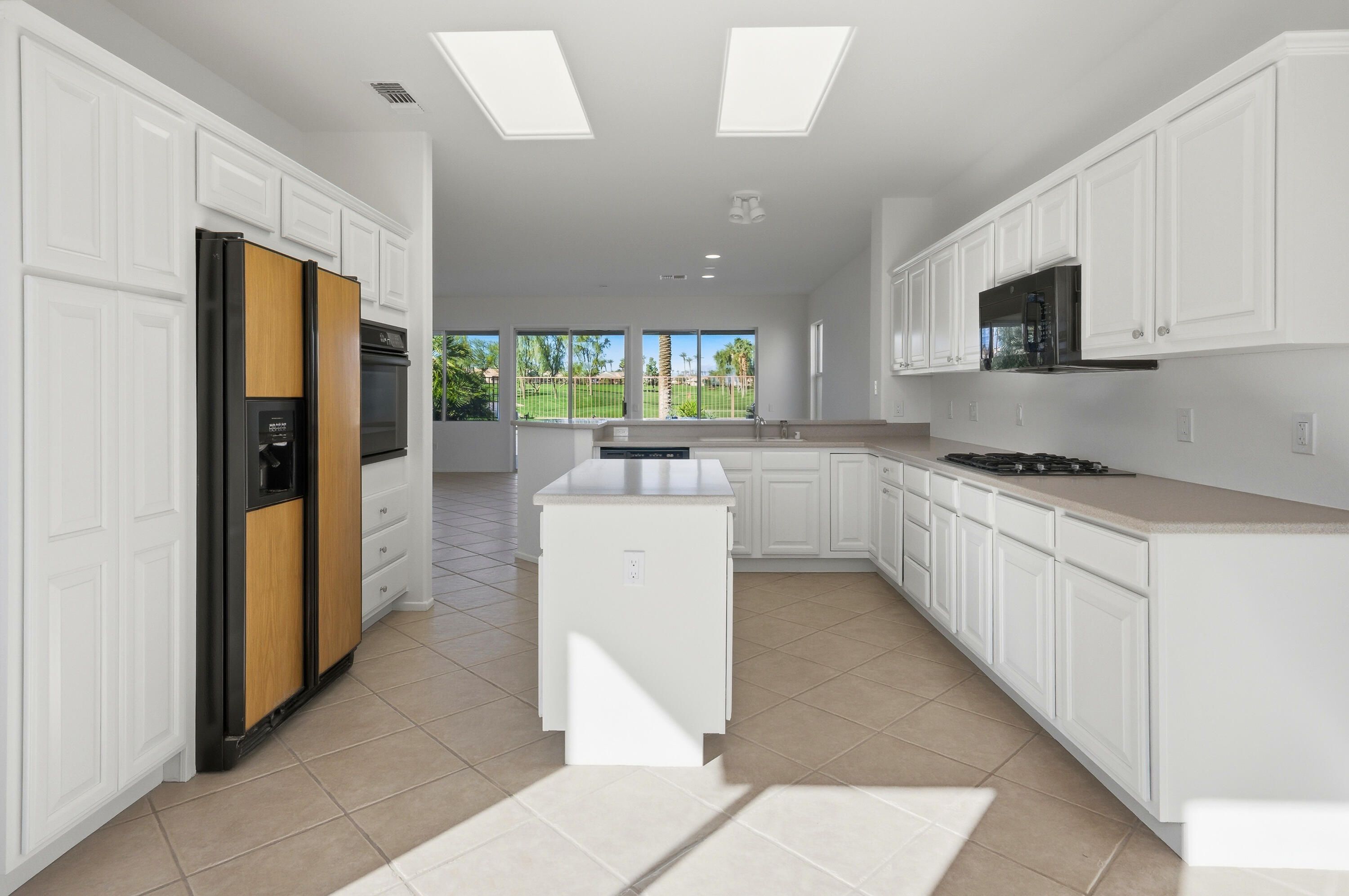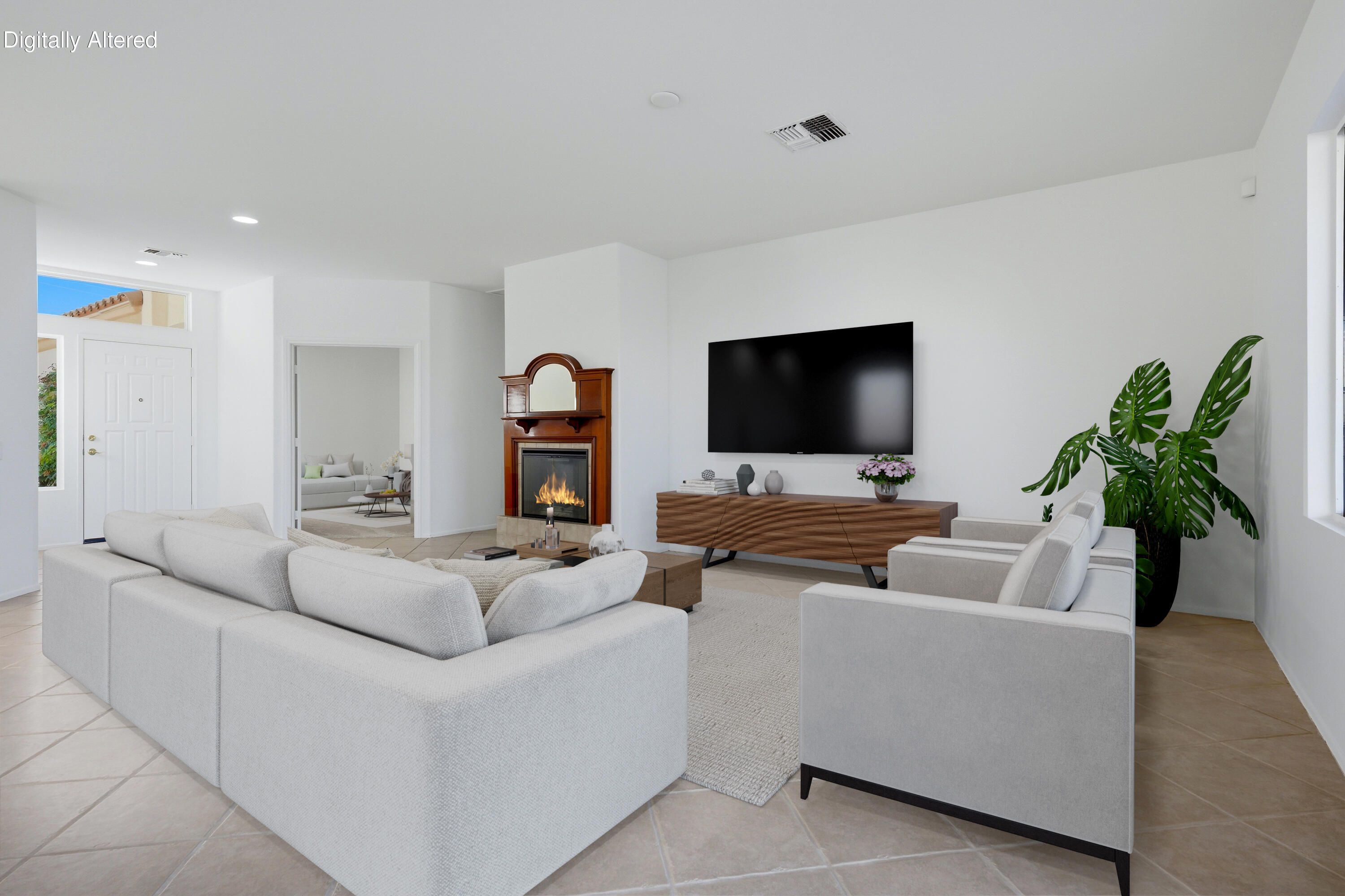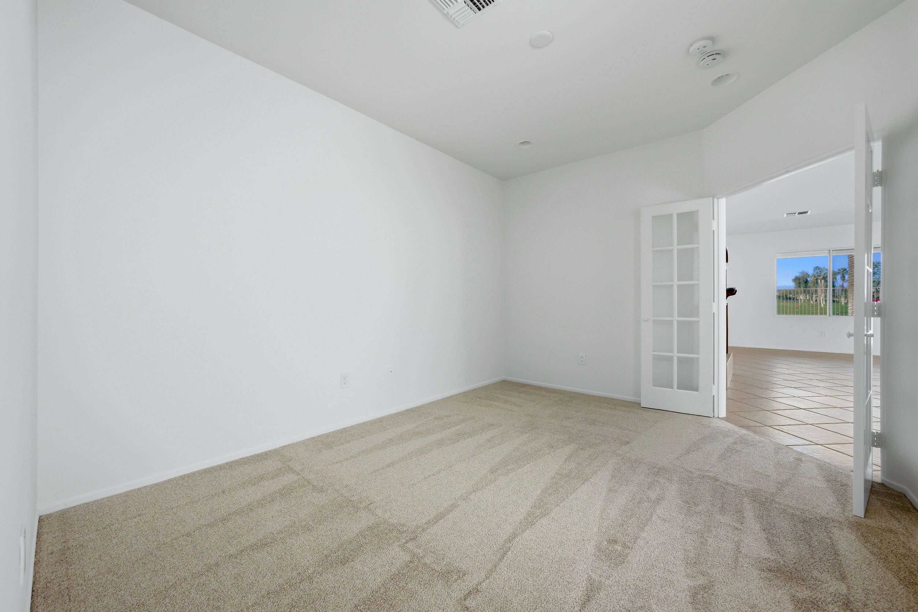 Sun City Palm Desert - St. Croix. Ideally positioned at the end of the 16th fairway, this highly sought-after St. Croix model offers sweeping golf course views and dramatic mountain panoramas, including Mount San Jacinto and Mount San Gorgonio. Sun City's most popular floor plan includes 2 bedrooms, 2 bathrooms, a den, a bonus hobby room, and an extended 2+ golf cart garage. Priced to reflect its outstanding location, views, and solid condition, this home presents a rare opportunity for buyers to add their own updates and finishes over time—creating a personalized retreat without paying a premium for someone else's renovations. The spacious rear yard is built for outdoor living, featuring an extended salt-finished patio, BBQ island, and pool and spa—perfect for relaxing or entertaining while enjoying the exceptional views. A front courtyard and desert landscaping add inviting curb appeal. Inside, the home has been freshly painted and well maintained, with tile flooring throughout the main living areas and newly installed carpet in the bedrooms, den, and hobby room. The kitchen features Corian countertops, a chef's island, breakfast bar, wall oven, and raised-panel maple cabinetry, which continues into the bathrooms. The great room includes an electric fireplace and sliding door that opens to the rear patio. French doors lead to the den, with a pocket door providing access to the hobby room. The primary suite offers patio access and a large walk-in closet with custom built-ins and mirrored doors, while the en suite bath features dual sinks and a stall shower with textured glass. The guest bath includes a shower/tub combination with cultured marble surfaces. Additional highlights include a guest bedroom with mirrored wardrobe doors, a laundry room with utility sink and built-in storage, and an extended 2+ golf cart garage with its own air conditioning and built-in cabinetry. The HVAC system was replaced in 2022.