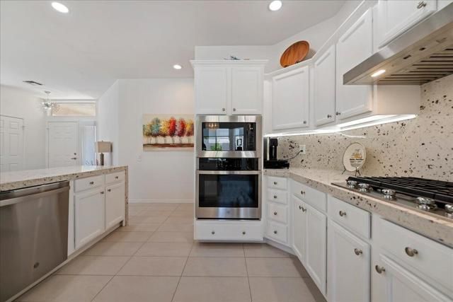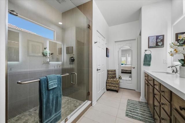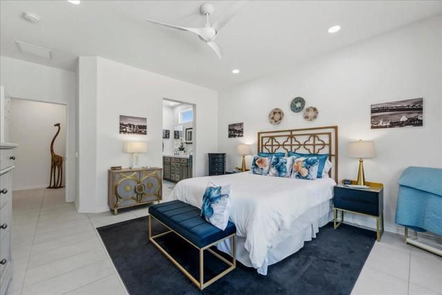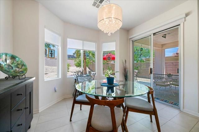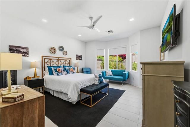 Beautifully reimagined with over $100,000 invested in remodel, this Barbados extended model showcases a seamless open-concept design with a fresh, contemporary aesthetic throughout. Newly painted in neutral DE 'Carrara,' the home offers a warm, cohesive palette complemented by 12' x 24' cream tile flooring laid in a stacked pattern throughout the entire home. Recessed lighting, updated light switches, electrical outlets, classic 6-panel interior doors, and custom window blinds throughout add to the home's polished and modern feel. Window seals have been replaced and repaired throughout, enhancing both efficiency and comfort.Stunning chef's kitchen is the centerpiece, anchored by an impressive 16-foot island with dramatic quartz waterfall edge--perfect for entertaining. Custom cabinetry with soft-close hinges, under-cabinet LED lighting, and a deep, oversized 34' porcelain sink elevate both form and function. High-end appliances include a KitchenAid 5-burner cooktop, commercial-grade range hood, and stainless steel GE Profile built-in wall oven, microwave, refrigerator, and dishwasher. Island seating and adjacent dining area with a bay window create a bright and inviting space overlooking the backyard.Thoughtfully upgraded throughout, the home features contemporary Minka-Aire ceiling fans with remotes, along with full-motion TV mounts with hidden wiring for a clean, streamlined look.The spacious primary suite is a true retreat with bay window for added light. Fully remodeled bathroom is a showstopper, featuring an expanded-size walk-in shower with large-format 12' x 24' floor-to-ceiling tile and an extra-tall frameless glass enclosure with brushed nickel finishes. Dual vanities with white quartz countertops are complemented by LED-lighted mirrors with anti-fog features & three brightness settings, creating a spa-like experience. A generous walk-in closet completes the suite.The guest bath is beautifully updated with a new bathtub, 12' x 24' tile extending to the ceiling, LED-lighted mirror & Kohler toilet.The laundry room features new full-size stackable LG Washer & Dryer - Smart Wi-Fi-enabled.Oversized, extra-wide lot on desirable north-facing orientation has new irrigation with smart control, lemon & lime trees, Trumpet vines and roses.This thoughtfully upgraded home blends modern elegance, quality craftsmanship and everyday comfort offering the very best of resort style living in one of the desert's most desirable active adult communities