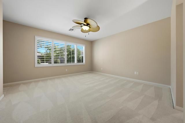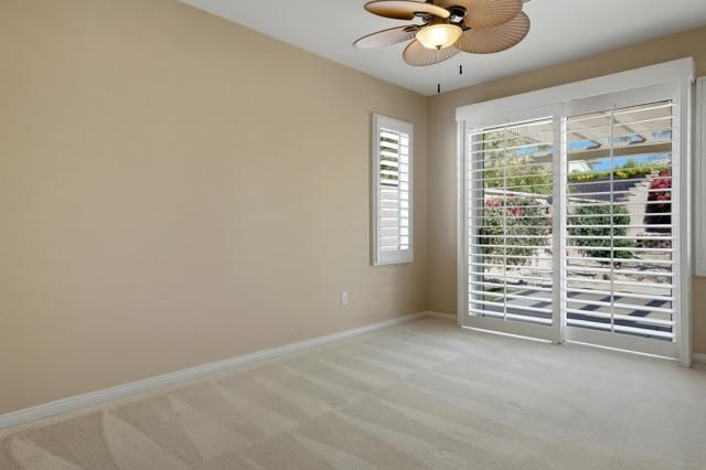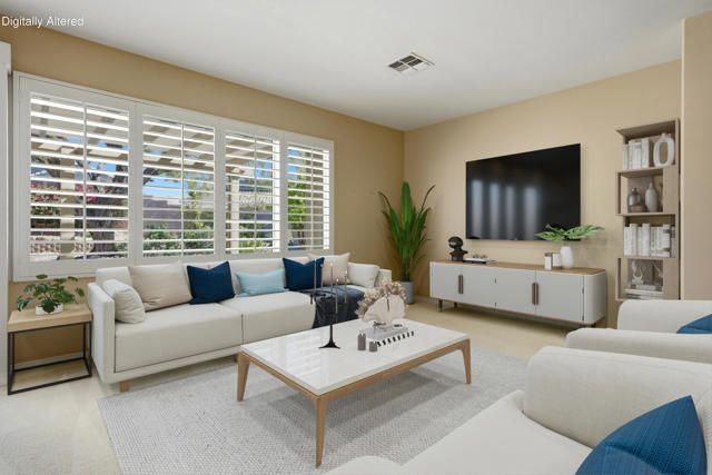 Sun City Palm Desert - St. Maarten. Located in the peaceful northern section of Sun City, a short distance to the Lakeview Recreation Center, this popular greatroom floorplan offers 2 bedrooms, 2 bathrooms, and a den. The spacious north-facing rear yard features a covered extended patio with an alumawood cover, lush landscaping including citrus, and peekaboo mountain views--perfect for relaxing or entertaining. Inside, plantation shutters are found throughout, adding both style and functionality. The spacious greatroom has a slider to the rear patio. A den sits just off the greatroom, ideal for a home office or hobby space. The kitchen features maple cabinetry, Corian countertops, a breakfast bar, and charming recipe windows. The primary suite includes a media nook, a large walk-in closet, and an ensuite bath with dual sinks and a glass-enclosed stall shower. The guest bedroom also offers a walk-in closet, while the guest bath includes a shower/tub. Laundry is conveniently located inside the home. The 2 car garage provides room for ample storage.