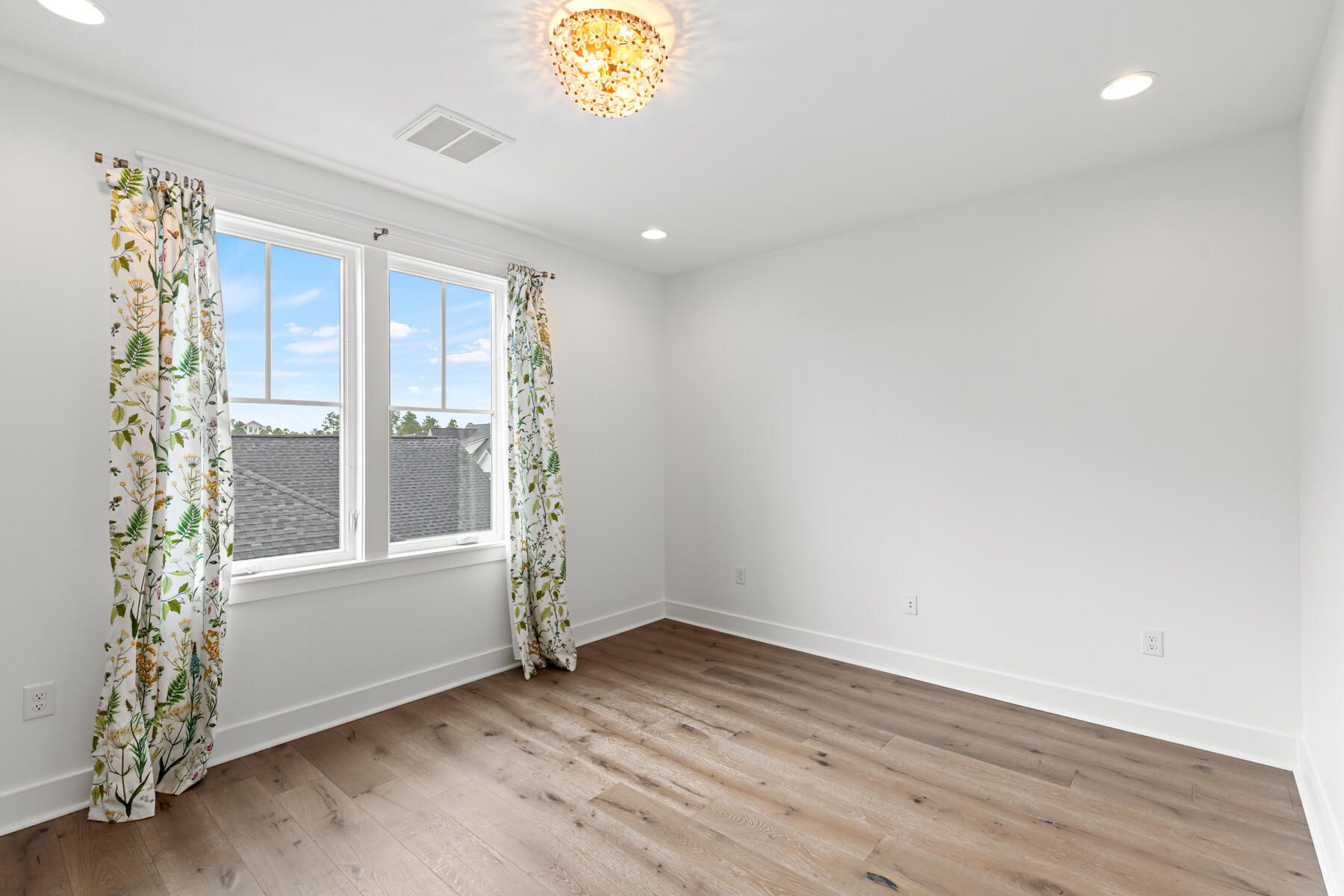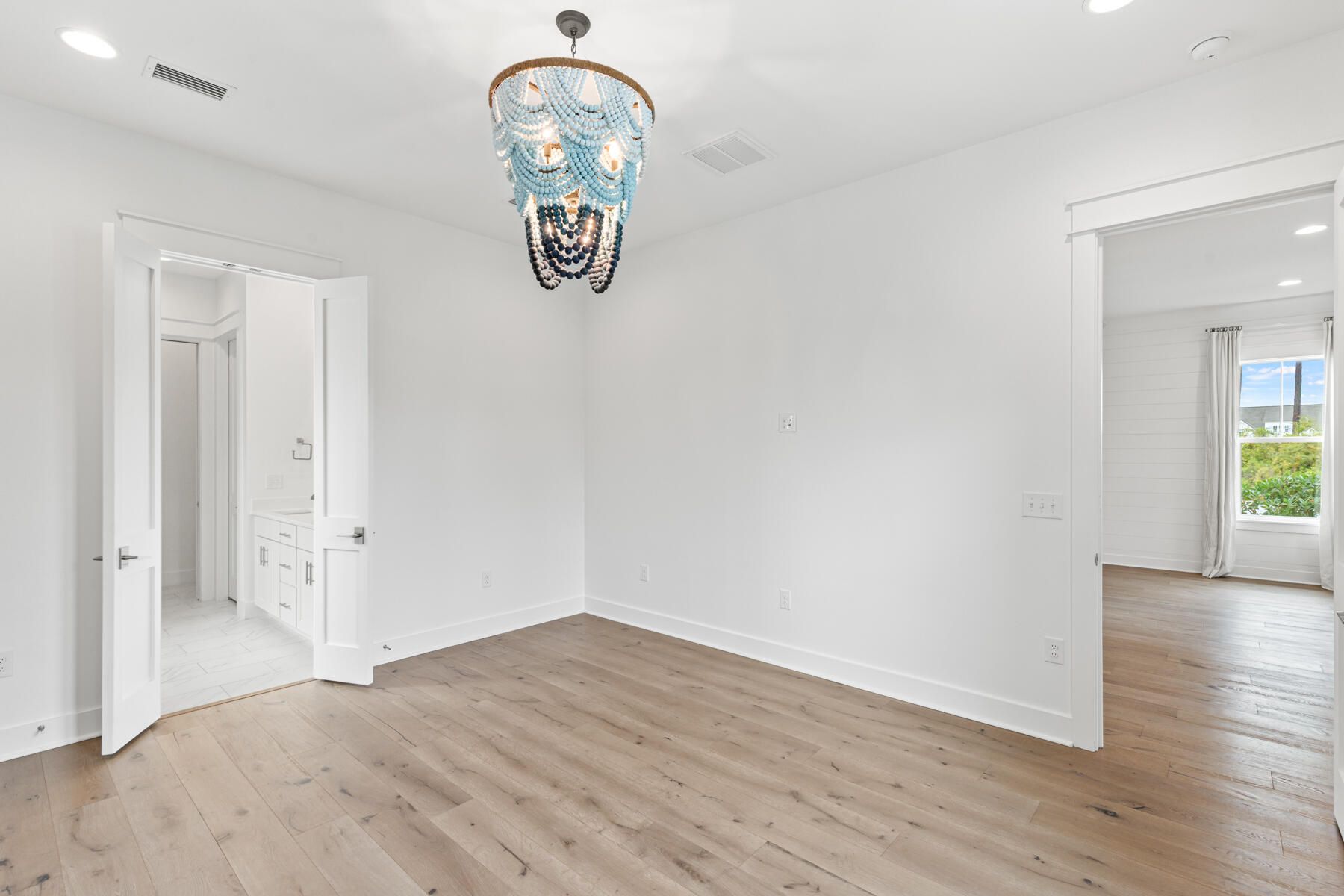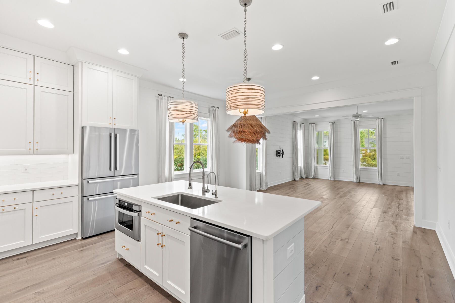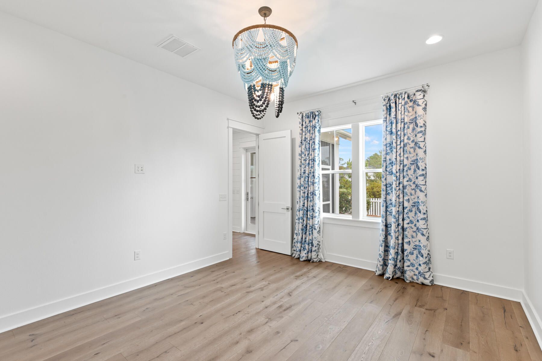Beautifully appointed home in Watersound Origins, ideally located adjacent to a park and offering a private, fenced backyard. The interior has just been freshly repainted and showcases 10-foot ceilings on the first level, engineered white oak floors throughout, and quartz countertops in every space. Thoughtful design details include wallpaper and shiplap wall accents, along with designer lighting, drapery, and high-end finishes that elevate the home's style. The first floor features two bedrooms, each with its own en-suite bath, plus a convenient powder room—perfect for guests or single-level living. Upstairs, two additional bedrooms and a bath provide flexible living space. A two-car garage with a newly finished epoxy floor completes the home. This move-in-ready residence blends refined design with everyday comfort in one of the area's most desirable communities.
