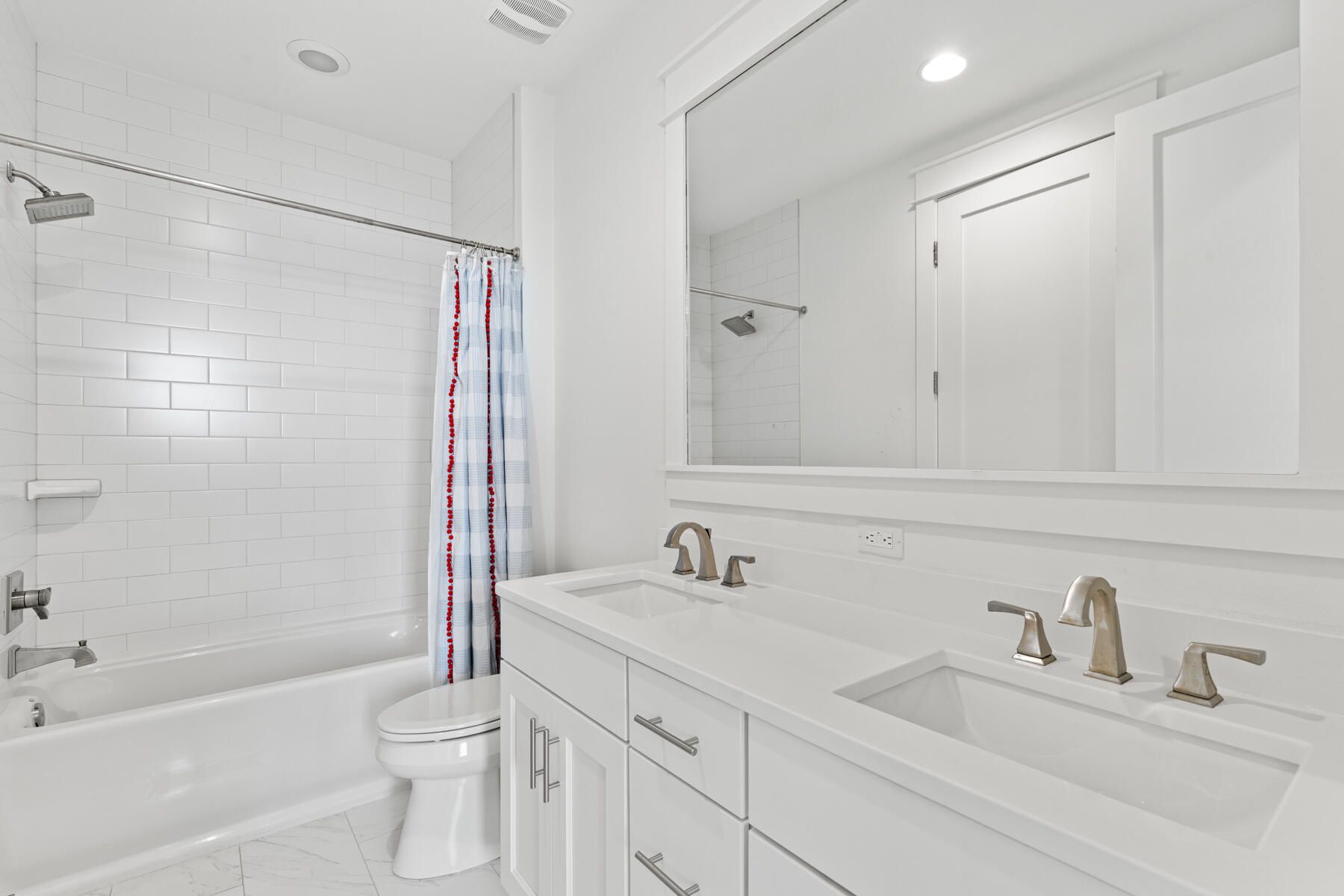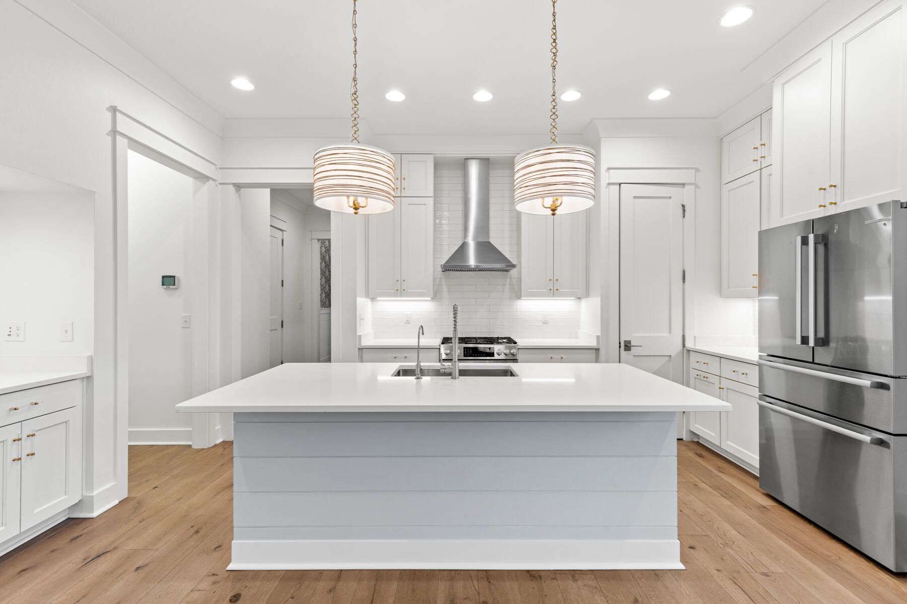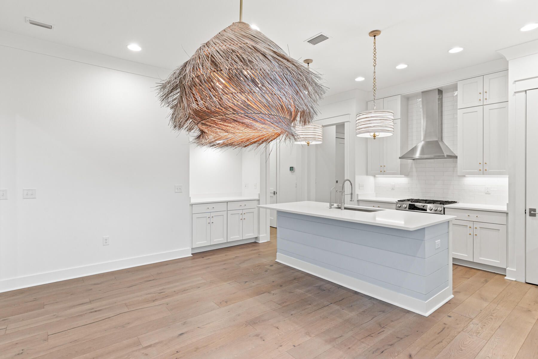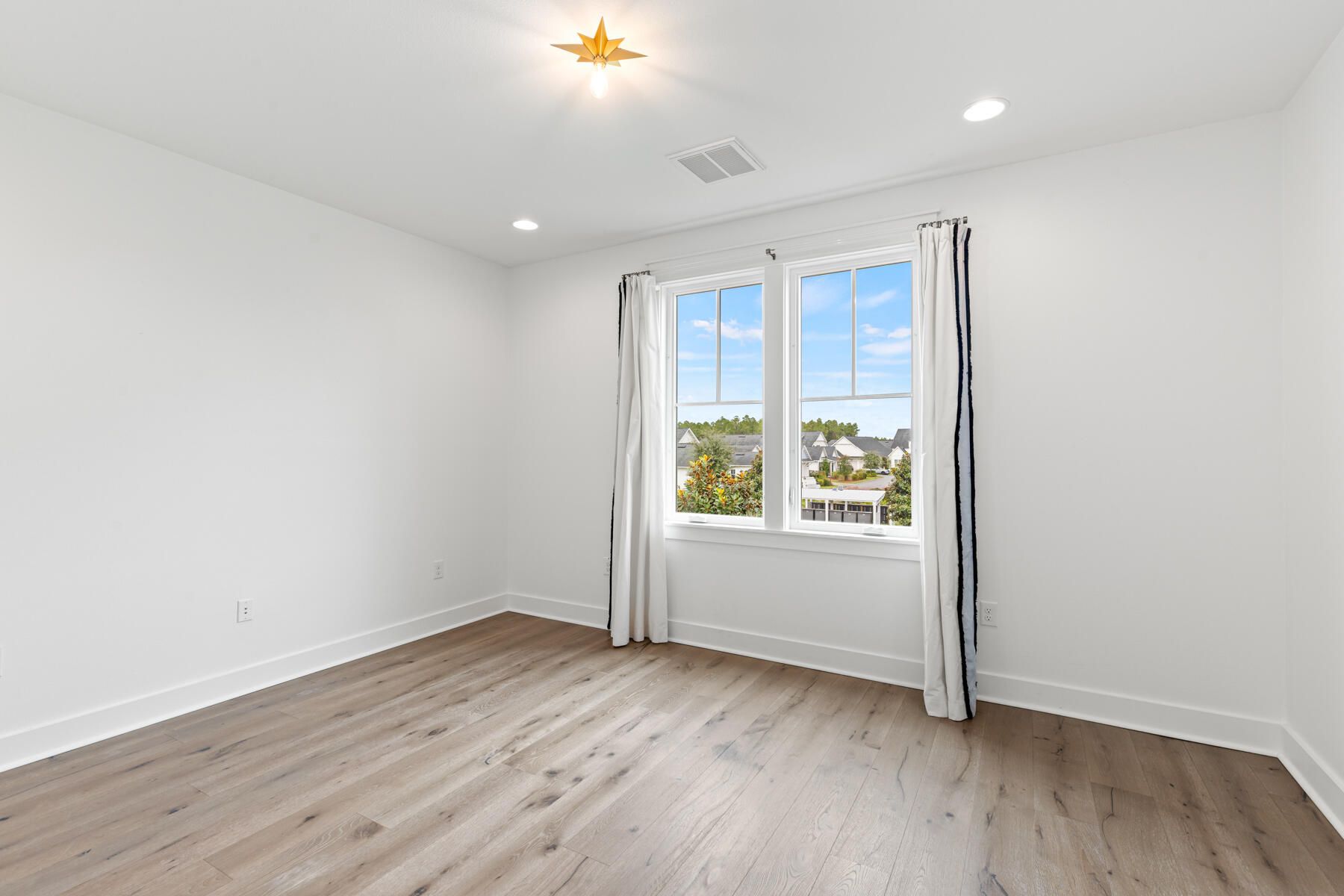 Beautifully appointed home in Watersound Origins, ideally located adjacent to a park and offering a private, fenced backyard. The interior has just been freshly repainted and showcases 10-foot ceilings on the first level, engineered white oak floors throughout, and quartz countertops in every space. Thoughtful design details include wallpaper and shiplap wall accents, along with designer lighting, drapery, and high-end finishes that elevate the home's style. The first floor features two bedrooms, each with its own en-suite bath, plus a convenient powder room—perfect for guests or single-level living. Upstairs, two additional bedrooms and a bath provide flexible living space. A two-car garage with a newly finished epoxy floor completes the home. This move-in-ready residence blends refined design with everyday comfort in one of the area's most desirable communities.
