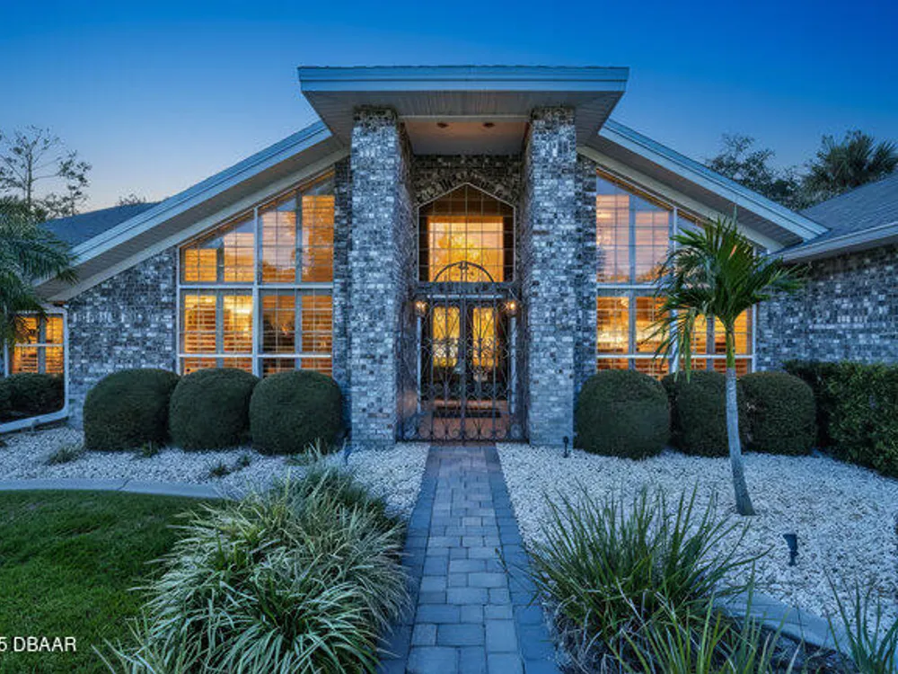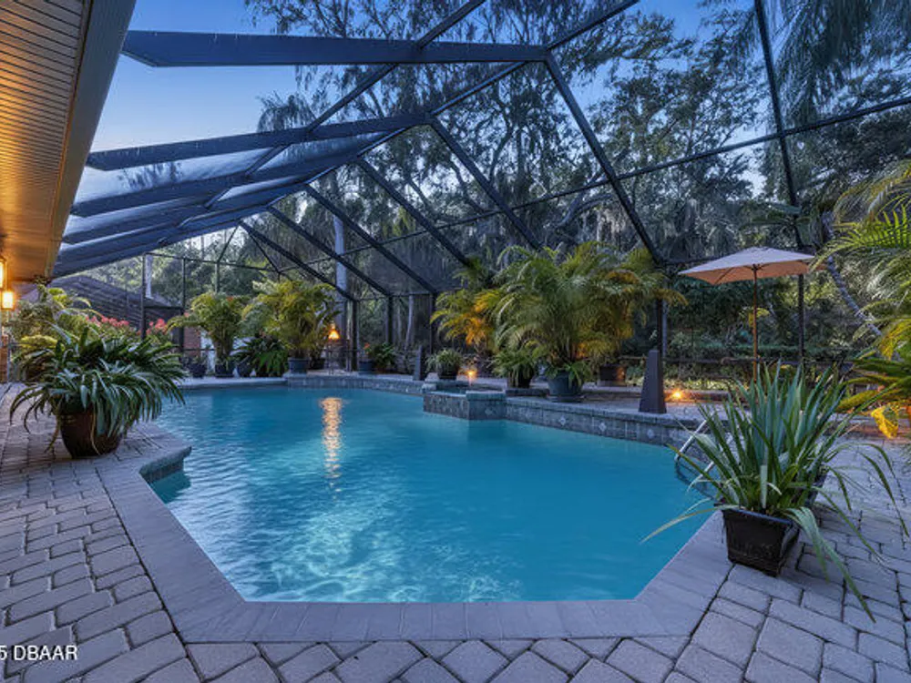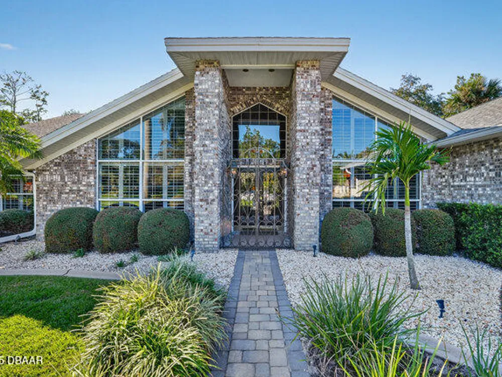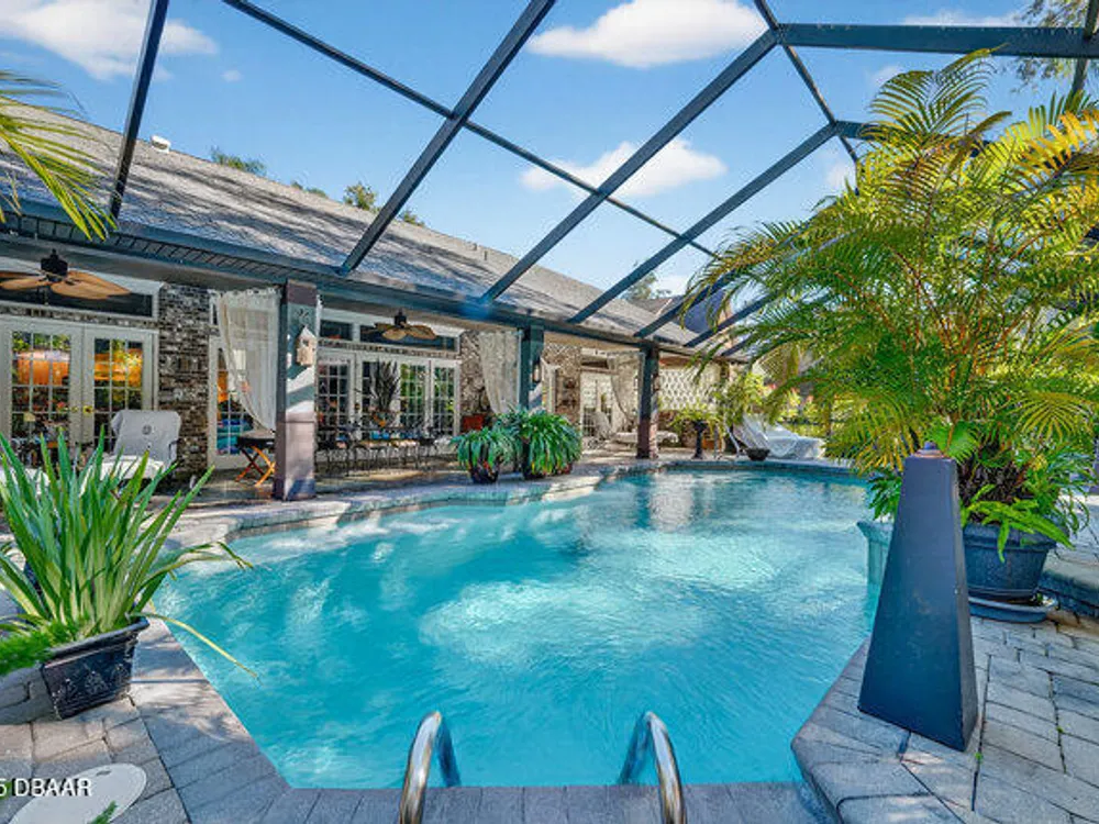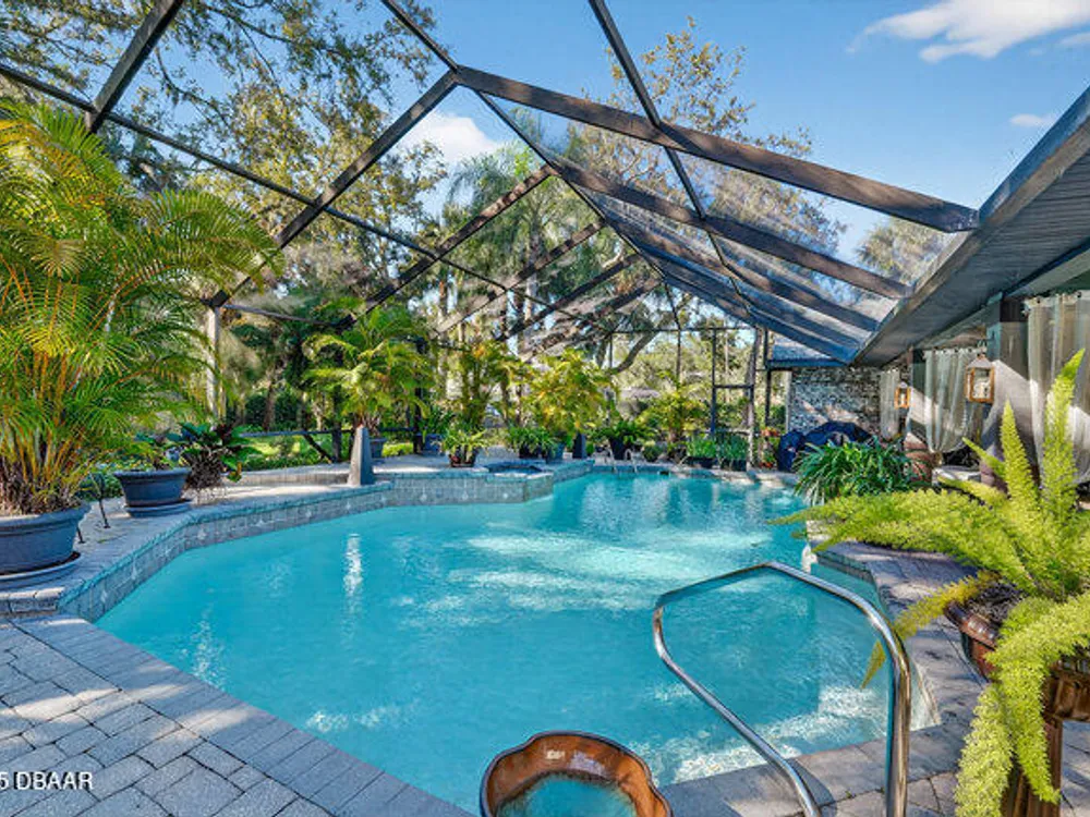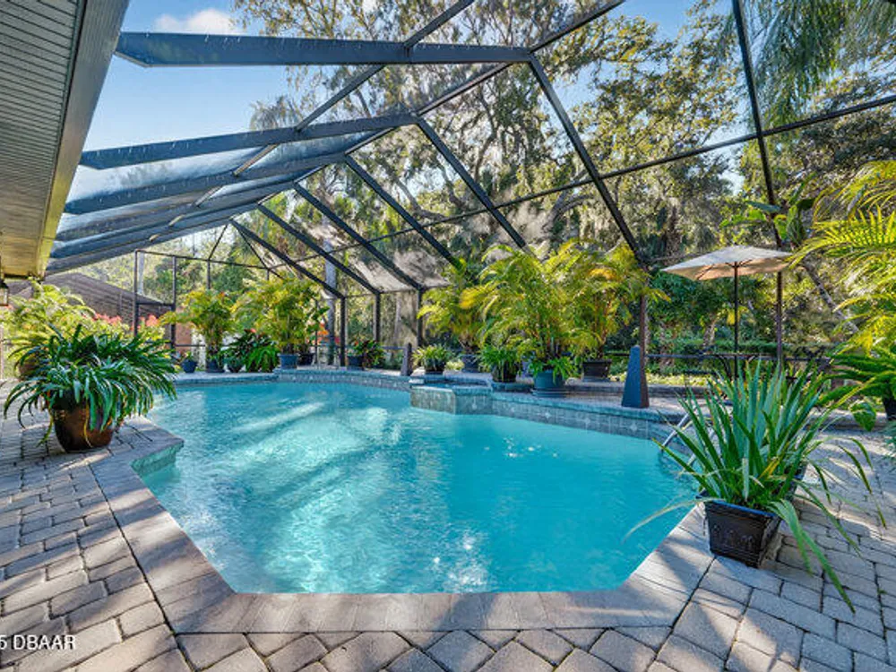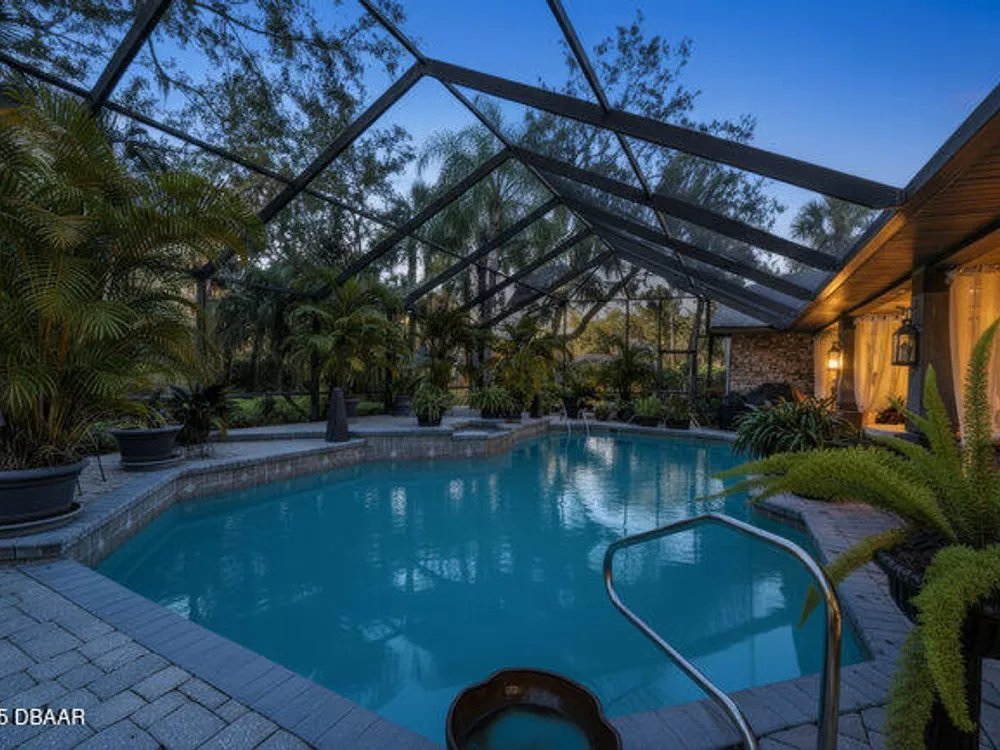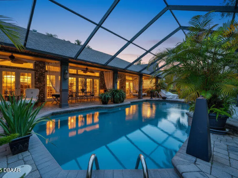 Designed for those who love both elegance and privacy, this impressive estate in gated Breakaway Trails sits on just under three‑quarters of an acre, backing up to a tranquil nature preserve. This 4‑bedroom, 3‑bath home blends timeless craftsmanship with resort‑style outdoor living. Step inside to find soaring 14‑foot ceilings, rich wood floors, and custom millwork throughout. The formal living room features a double‑sided fireplace shared with the family room, creating a warm and inviting ambiance. Luxe wall treatments and plantation shutters enhance the refined design. The owner's suite offers French door access to the lanai, a spa‑inspired bath with marble floors, dual vanities, and a California walk‑in closet. Three additional well‑sized guest bedrooms provide comfortable accommodations, along with a stylish guest bath that includes convenient pool access. The open kitchen centers around an island and cheerful breakfast nook, seamlessly connecting to the family room with three sets of French doors leading to the covered lanai. Outdoors, a resortstyle pool and paver deck set the stage for entertaining, while beyond the pool, the lush parklike backyard borders the preserve of your own private retreat. A climatecontrolled threecar garage and circular driveway complete the estate, offering ample space for guests and gatherings. Experience luxury, privacy, and natural beauty all in one of Ormond Beach's premier gated communities.