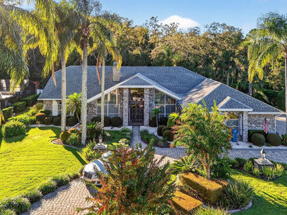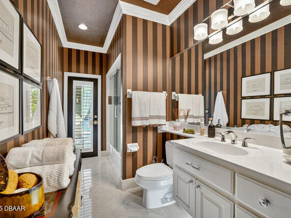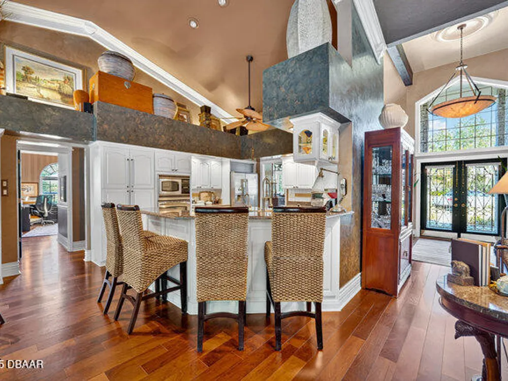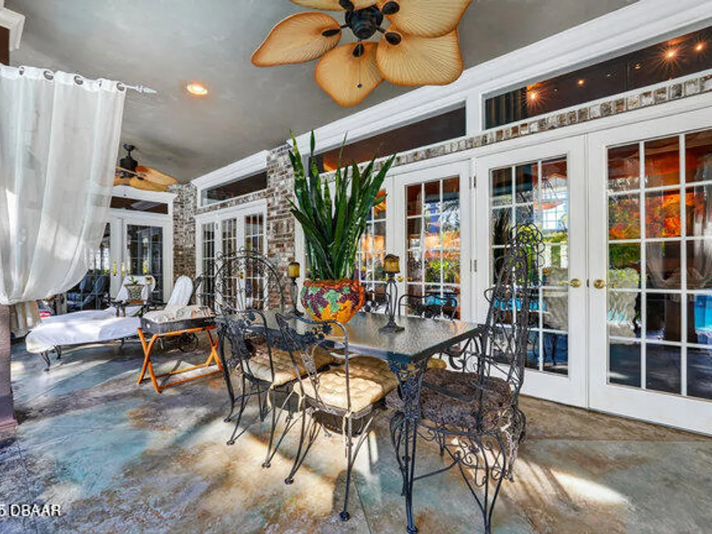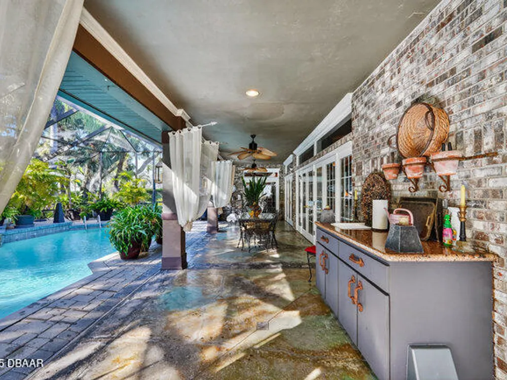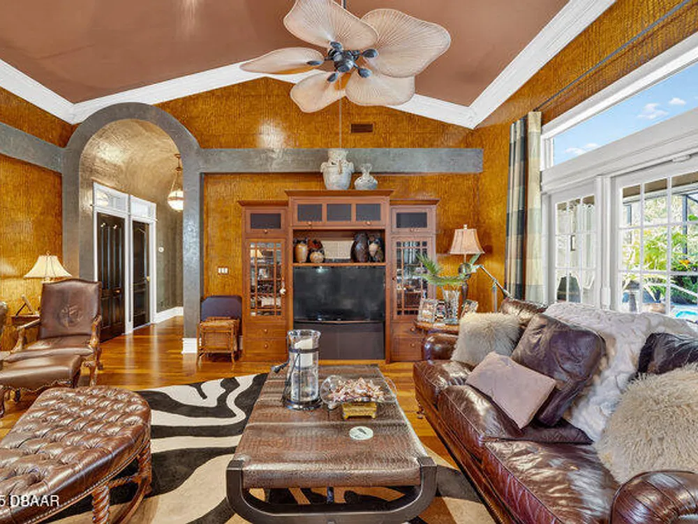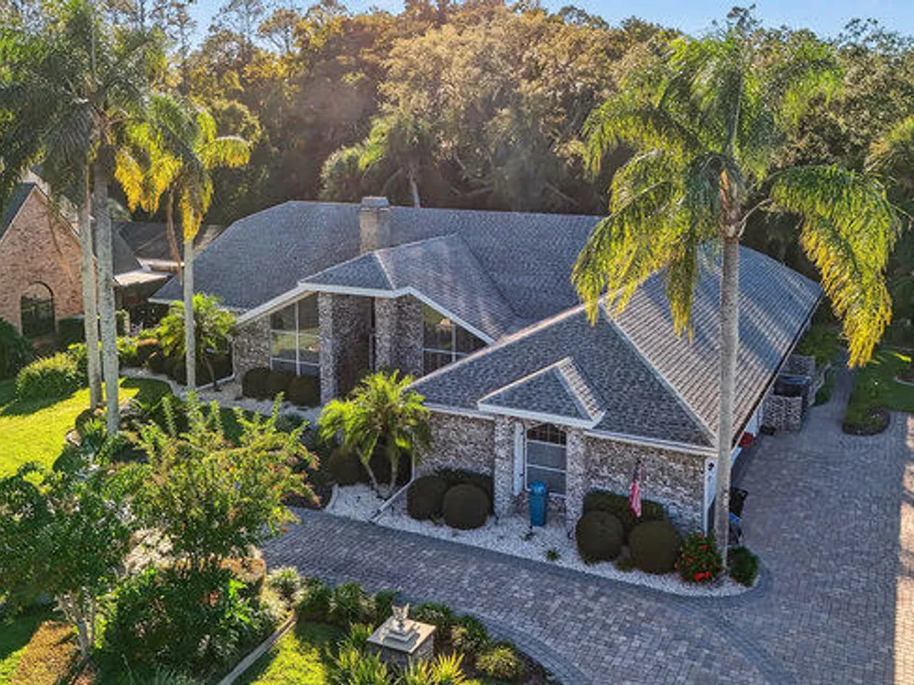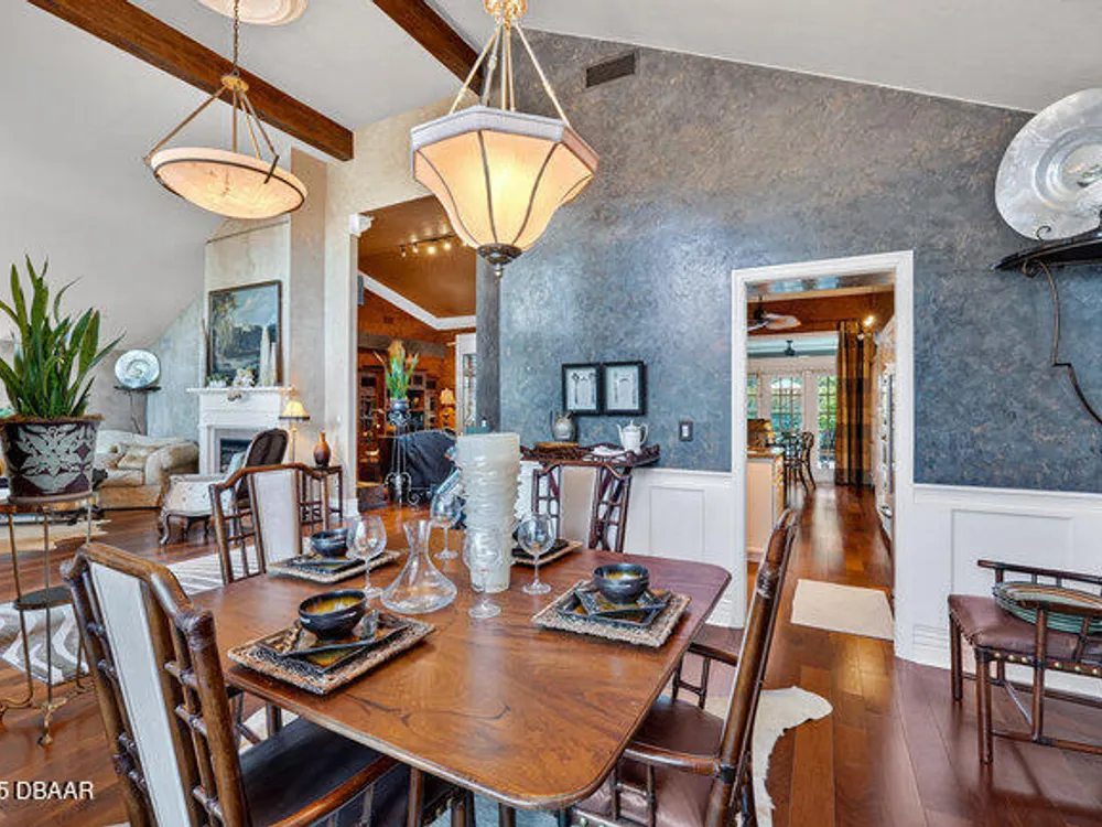 Designed for those who love both elegance and privacy, this impressive estate in gated Breakaway Trails sits on just under three‑quarters of an acre, backing up to a tranquil nature preserve. This 4‑bedroom, 3‑bath home blends timeless craftsmanship with resort‑style outdoor living. Step inside to find soaring 14‑foot ceilings, rich wood floors, and custom millwork throughout. The formal living room features a double‑sided fireplace shared with the family room, creating a warm and inviting ambiance. Luxe wall treatments and plantation shutters enhance the refined design. The owner's suite offers French door access to the lanai, a spa‑inspired bath with marble floors, dual vanities, and a California walk‑in closet. Three additional well‑sized guest bedrooms provide comfortable accommodations, along with a stylish guest bath that includes convenient pool access. The open kitchen centers around an island and cheerful breakfast nook, seamlessly connecting to the family room with three sets of French doors leading to the covered lanai. Outdoors, a resortstyle pool and paver deck set the stage for entertaining, while beyond the pool, the lush parklike backyard borders the preserve of your own private retreat. A climatecontrolled threecar garage and circular driveway complete the estate, offering ample space for guests and gatherings. Experience luxury, privacy, and natural beauty all in one of Ormond Beach's premier gated communities.