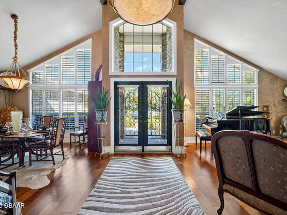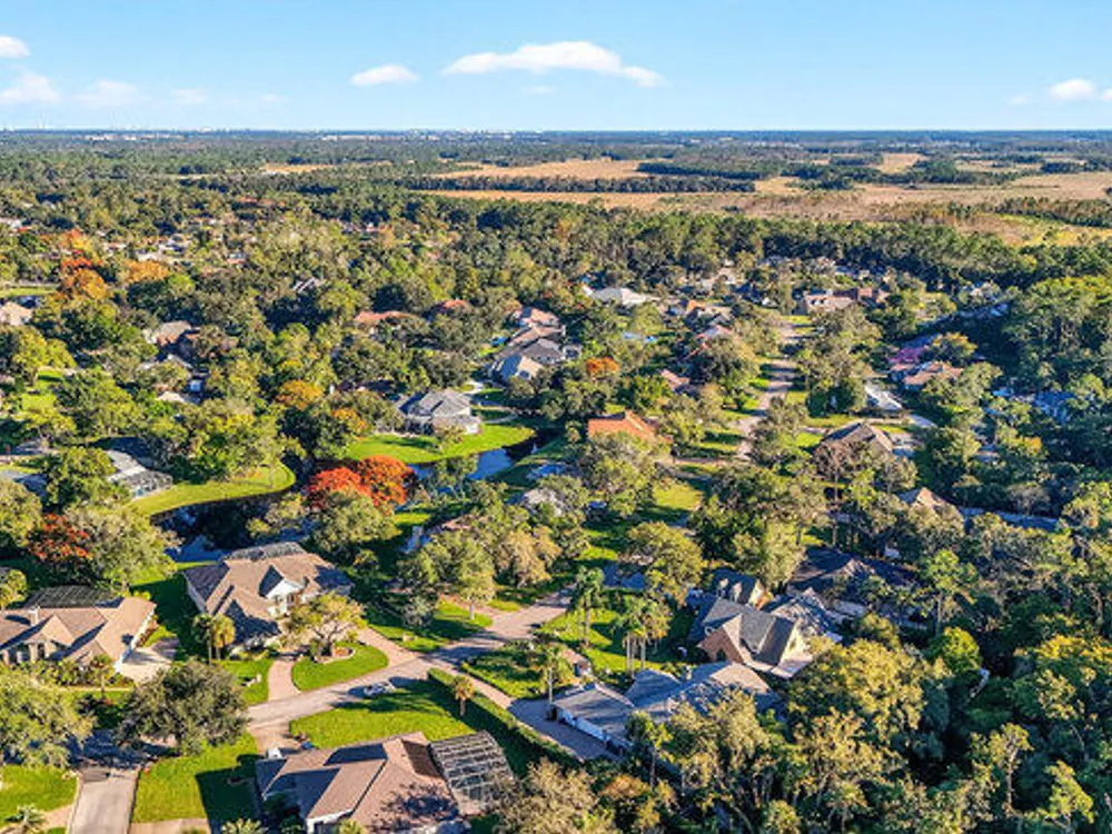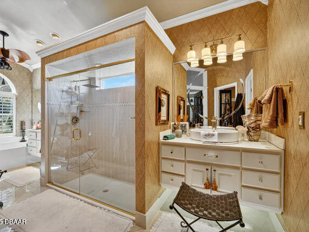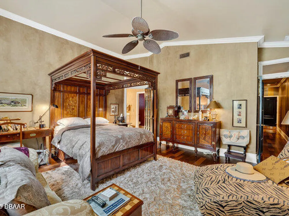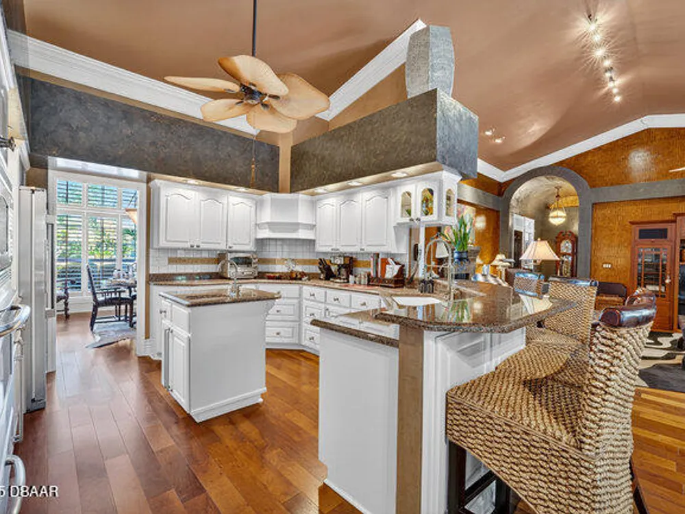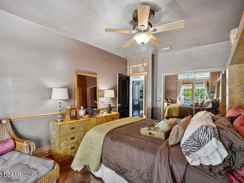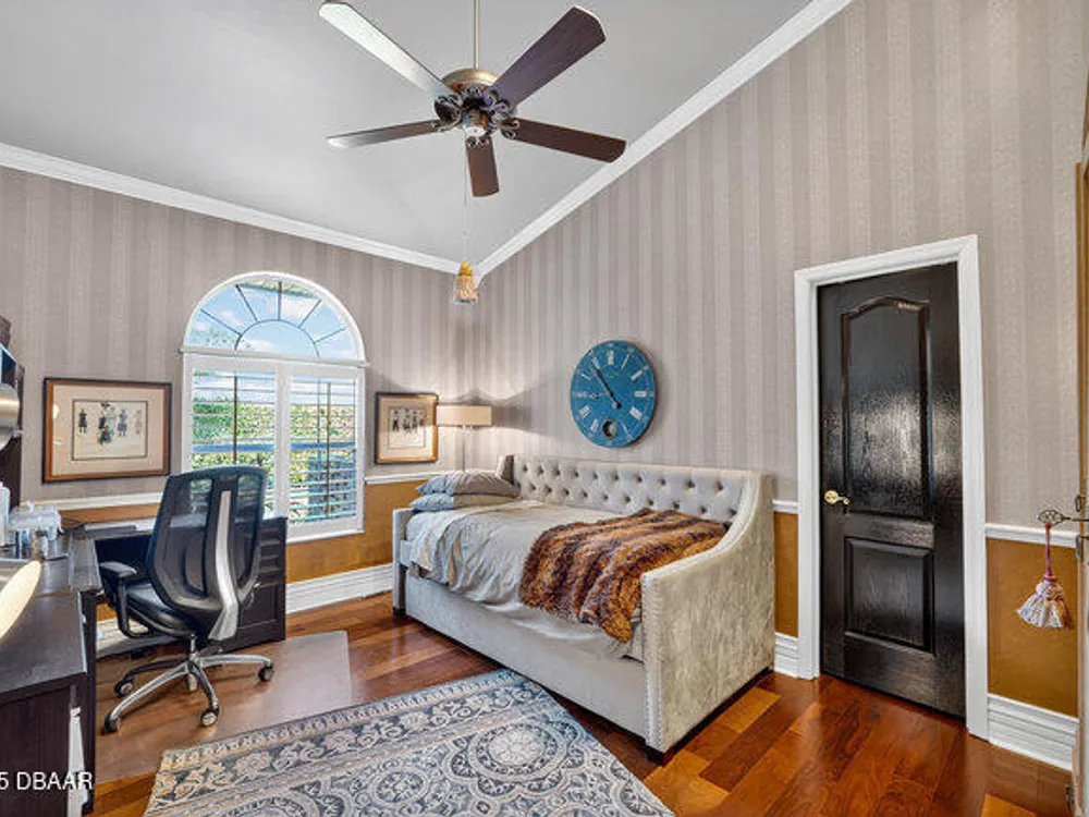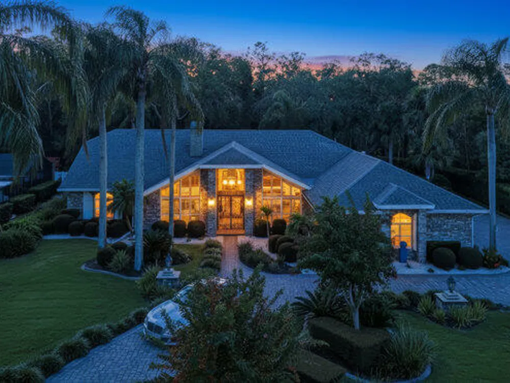 Designed for those who love both elegance and privacy, this impressive estate in gated Breakaway Trails sits on just under three‑quarters of an acre, backing up to a tranquil nature preserve. This 4‑bedroom, 3‑bath home blends timeless craftsmanship with resort‑style outdoor living. Step inside to find soaring 14‑foot ceilings, rich wood floors, and custom millwork throughout. The formal living room features a double‑sided fireplace shared with the family room, creating a warm and inviting ambiance. Luxe wall treatments and plantation shutters enhance the refined design. The owner's suite offers French door access to the lanai, a spa‑inspired bath with marble floors, dual vanities, and a California walk‑in closet. Three additional well‑sized guest bedrooms provide comfortable accommodations, along with a stylish guest bath that includes convenient pool access. The open kitchen centers around an island and cheerful breakfast nook, seamlessly connecting to the family room with three sets of French doors leading to the covered lanai. Outdoors, a resortstyle pool and paver deck set the stage for entertaining, while beyond the pool, the lush parklike backyard borders the preserve of your own private retreat. A climatecontrolled threecar garage and circular driveway complete the estate, offering ample space for guests and gatherings. Experience luxury, privacy, and natural beauty all in one of Ormond Beach's premier gated communities.