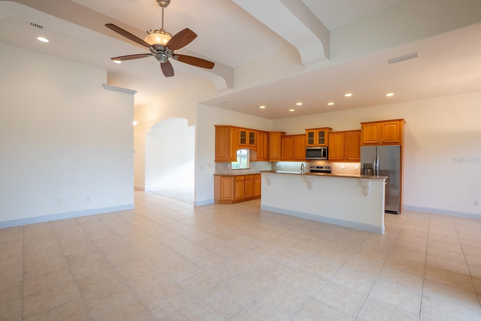 - Ceiling Fan(s), Eat-in Kitchen, High Ceilings, Kitchen/Family Room Combo, Living/Dining Room, Open Floorplan, Main Level Primary, Solid Surface Counters, Thermostat, Vaulted Ceiling(s), Walk-In Closet(s)