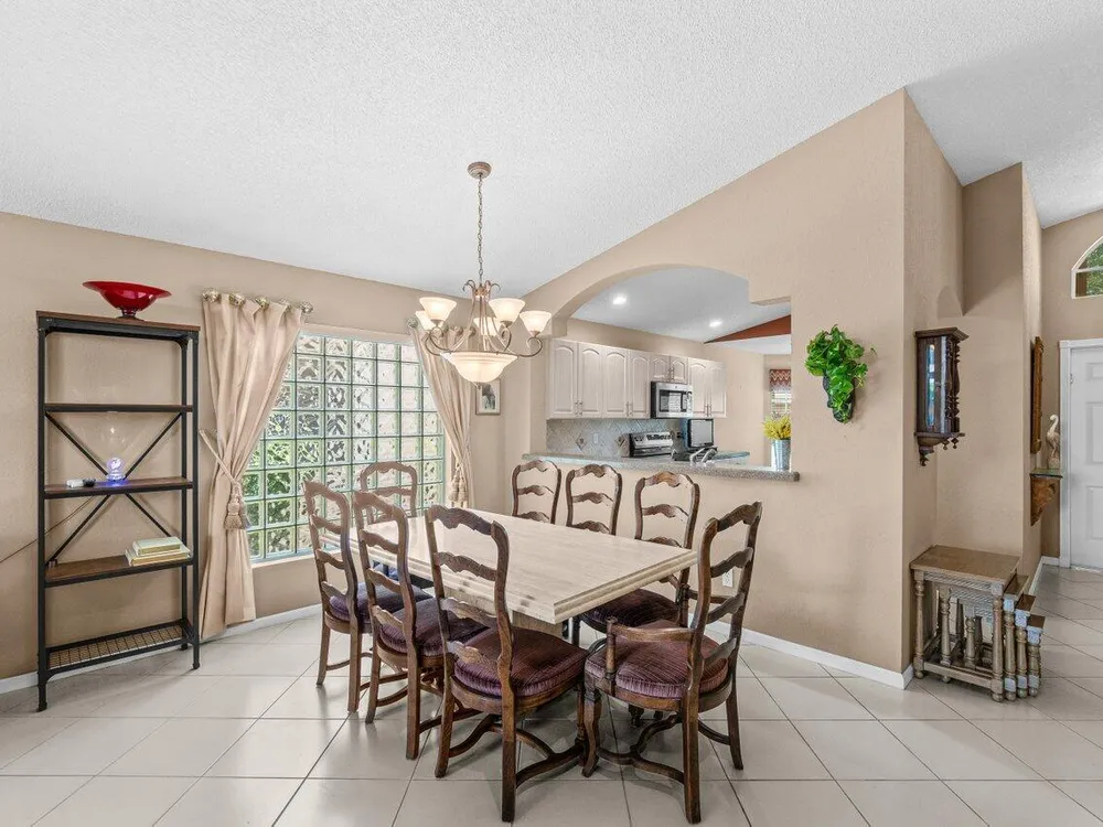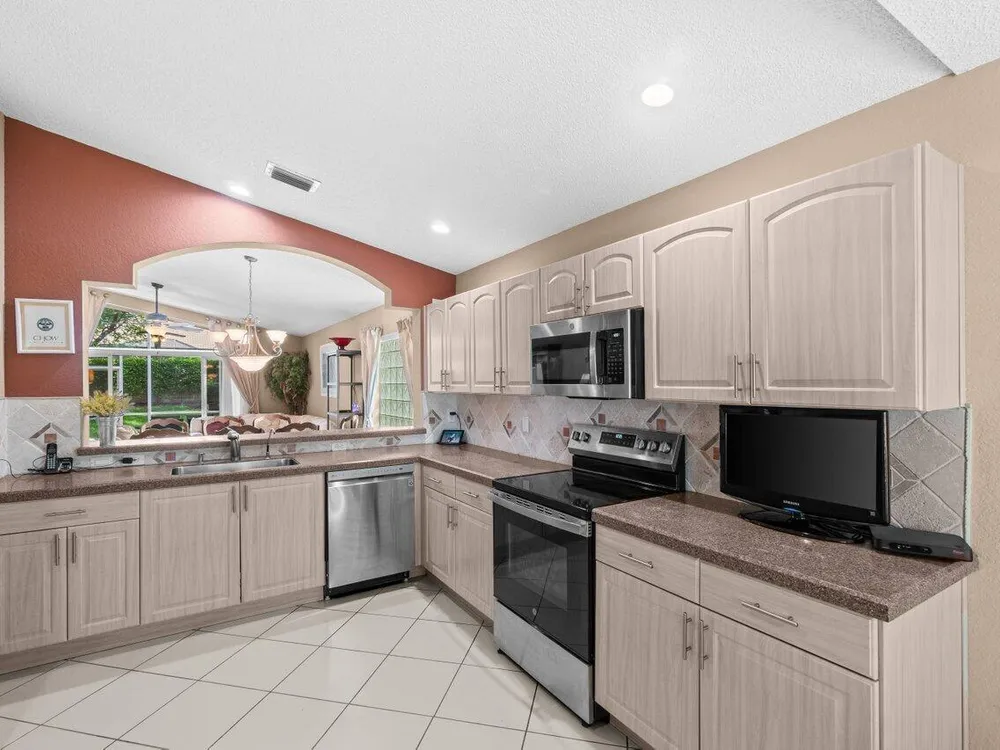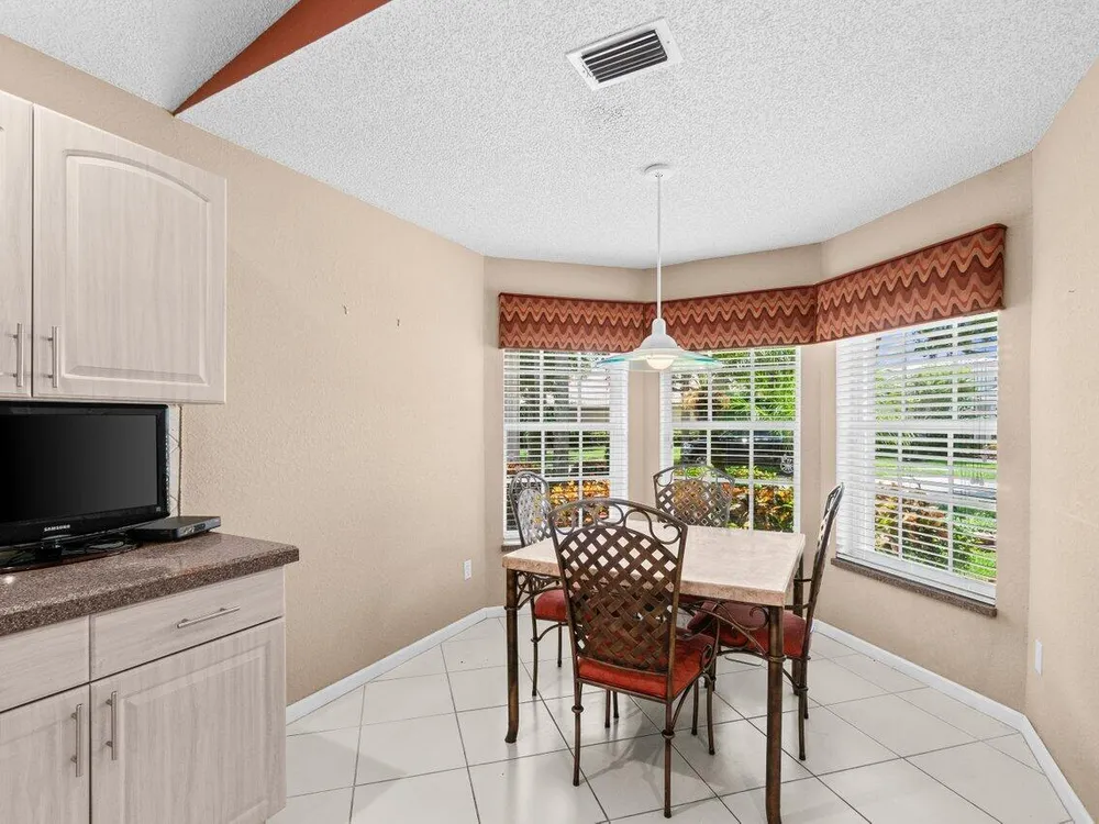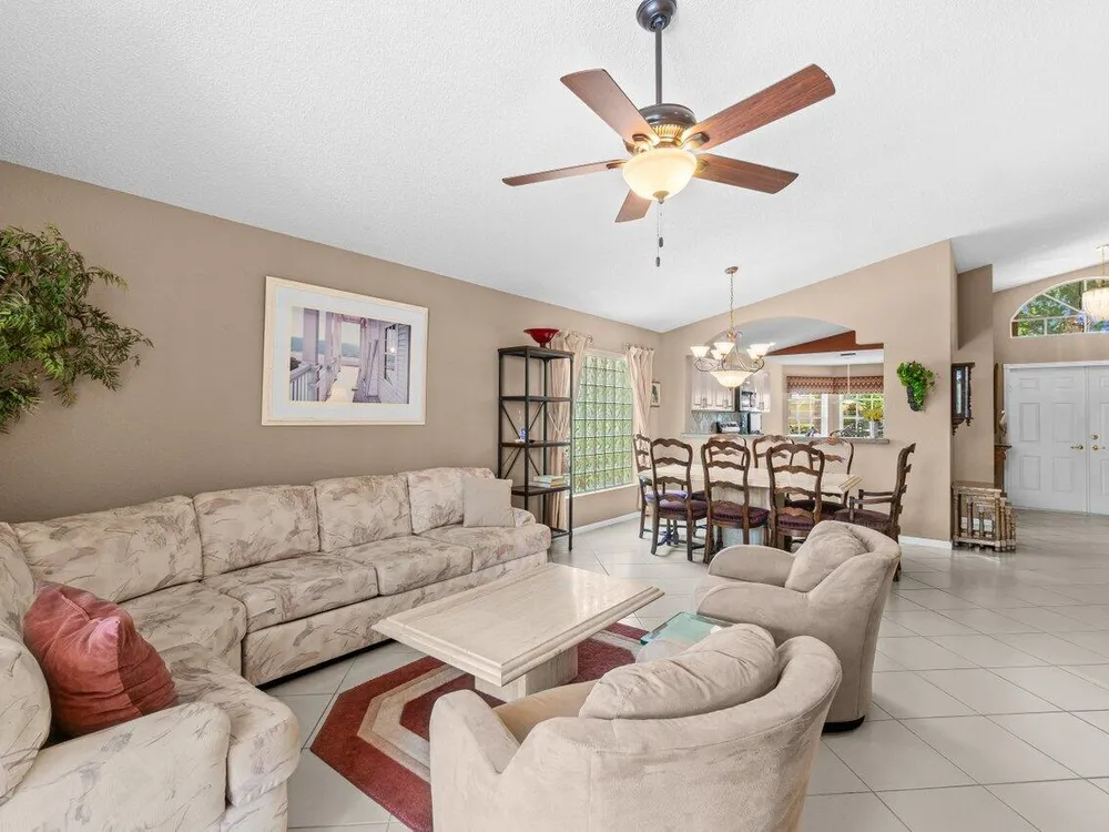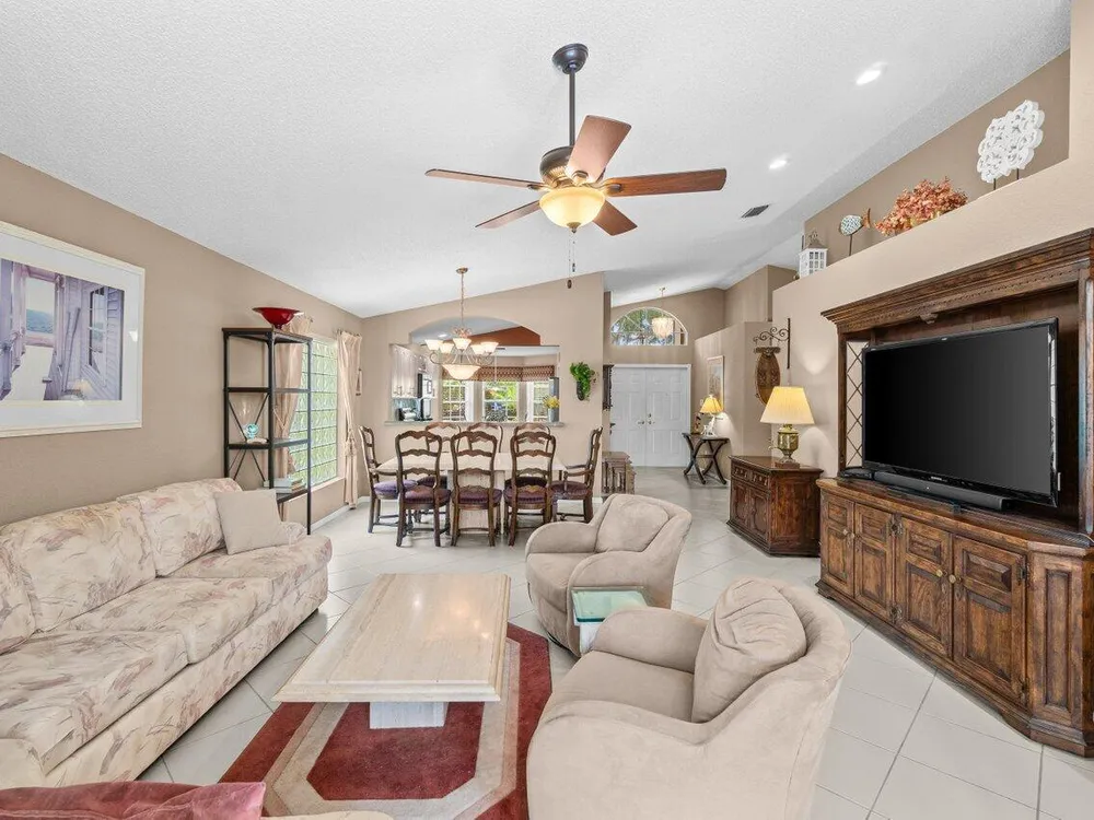 Beautifully updated 3 bedroom 2 bathroom home located in the highly sought-after active adult community of Valencia Lakes. This residence offers stunning curb appeal with professional landscaping and a 2-car garage. Step through the covered entry and double doors into a bright, open layout filled with natural light. The eat-in kitchen features charming bay windows, while the spacious living area with high ceilings flows seamlessly to a screened-in patio--perfect for outdoor entertaining. Enjoy peaceful garden views with no rear neighbors. The home boasts tile flooring throughout with wood-like laminate in the bedrooms, updated bathrooms, and an indoor laundry room with full-sized washer and dryer. The primary suite is a true retreat with a walk-in closet and an en-suite bath featuring