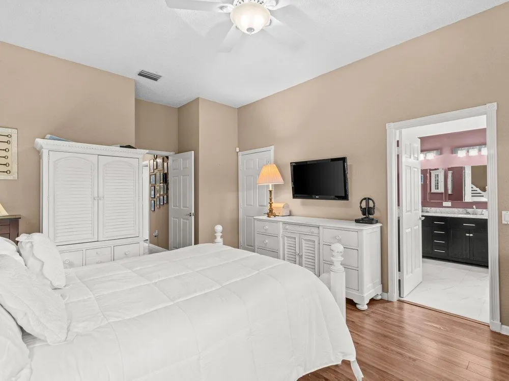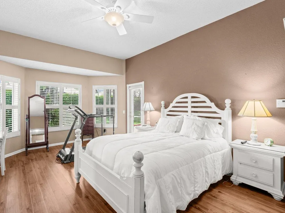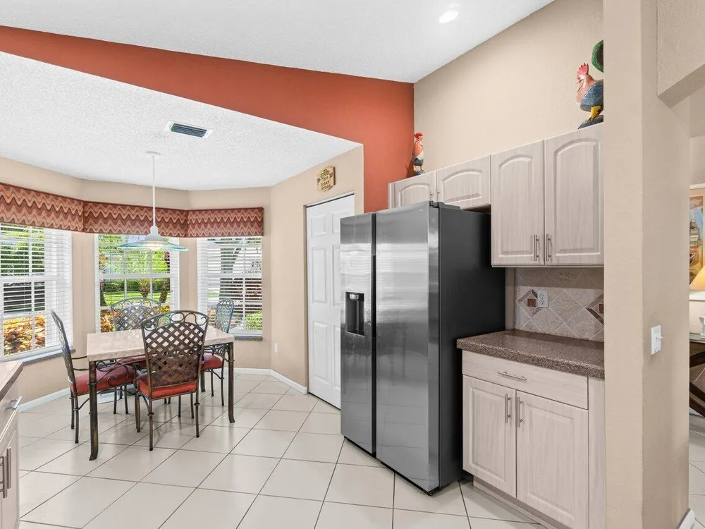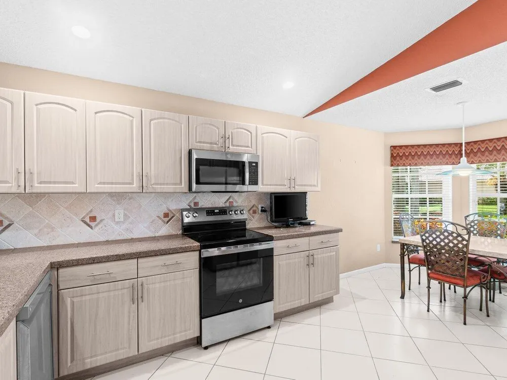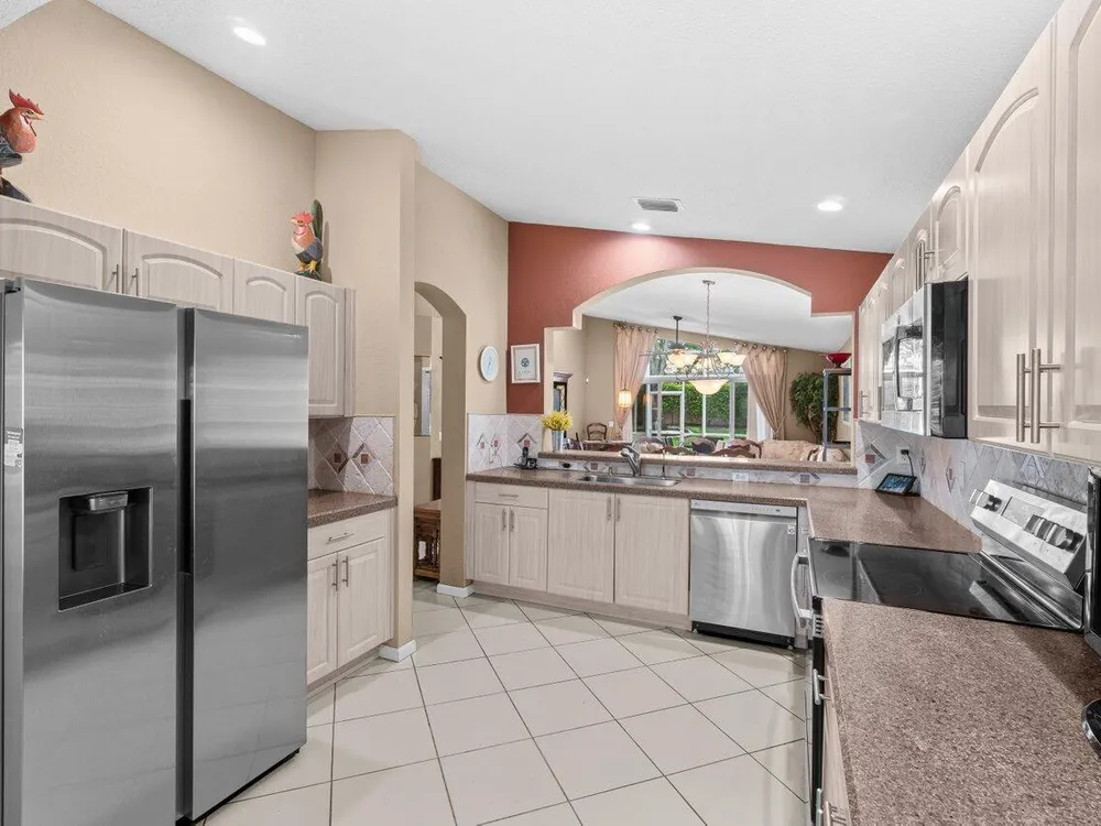 Beautifully updated 3 bedroom 2 bathroom home located in the highly sought-after active adult community of Valencia Lakes. This residence offers stunning curb appeal with professional landscaping and a 2-car garage. Step through the covered entry and double doors into a bright, open layout filled with natural light. The eat-in kitchen features charming bay windows, while the spacious living area with high ceilings flows seamlessly to a screened-in patio--perfect for outdoor entertaining. Enjoy peaceful garden views with no rear neighbors. The home boasts tile flooring throughout with wood-like laminate in the bedrooms, updated bathrooms, and an indoor laundry room with full-sized washer and dryer. The primary suite is a true retreat with a walk-in closet and an en-suite bath featuring