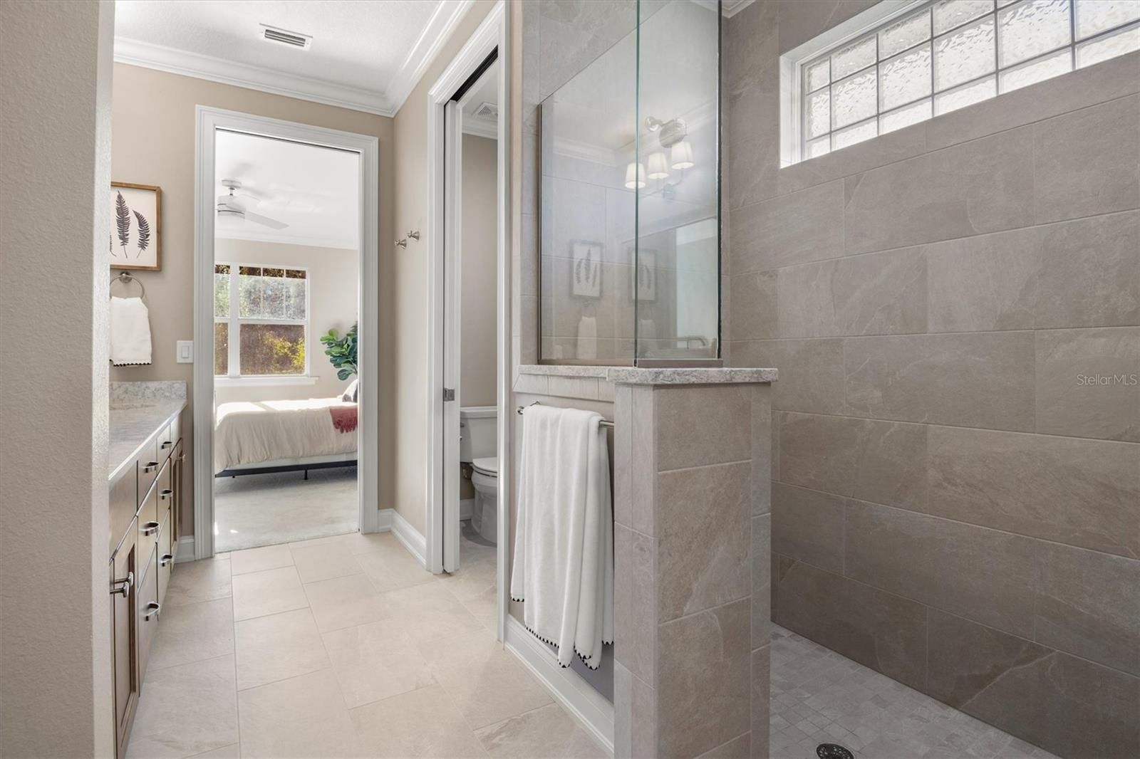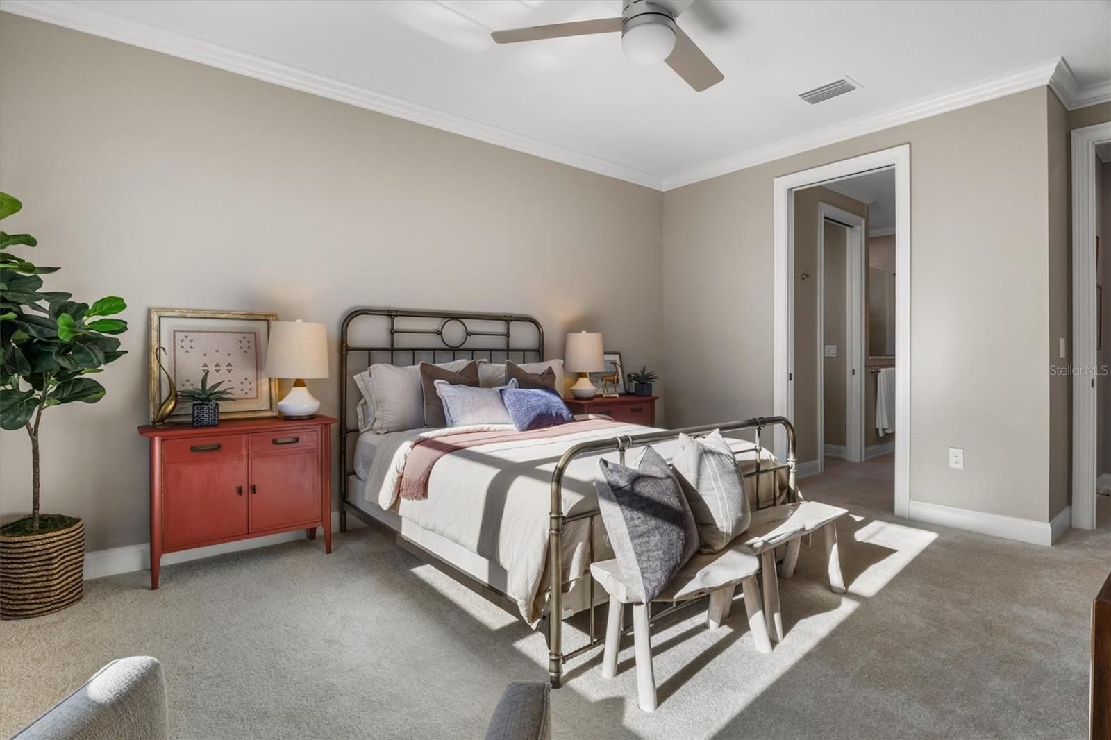 - Cathedral Ceiling(s), Ceiling Fan(s), Crown Molding, Eat-in Kitchen, High Ceilings, Living/Dining Room, Open Floorplan, Main Level Primary, Solid-Wood Cabinets, Split Bedrooms, Stone Counters, Thermostat, Walk-In Closet(s)