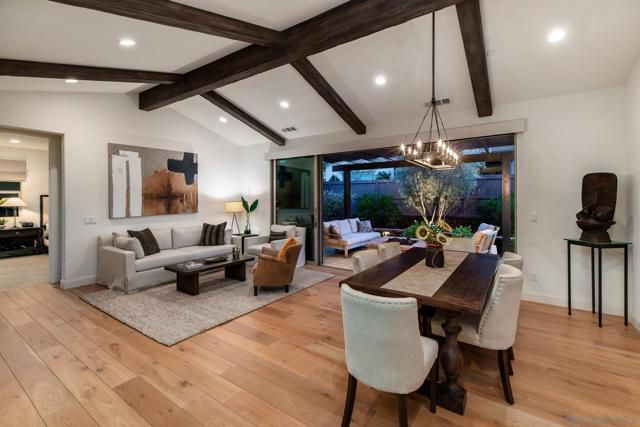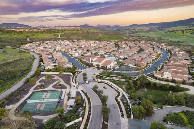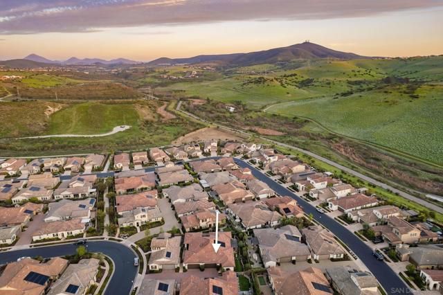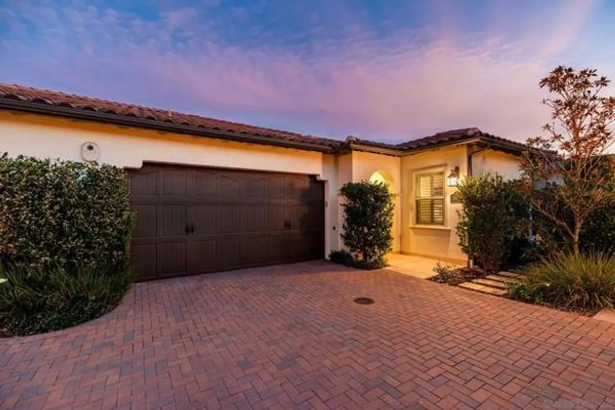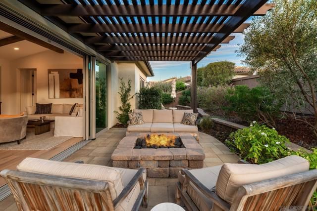 Set within the gated 55+ community of Auberge at Del Sur, this "Cottage" residence blends thoughtful design with relaxed indoor/outdoor living in a neighborhood known for its active & welcoming atmosphere. The home features an open layout where vaulted ceilings & exposed wood beams create warmth & architectural character. A wall of custom built-ins grounds the living room, while expansive sliding doors draw the eye outward to a private backyard retreat centered around a fire pit & surrounded by mature landscaping. The connection between inside & out is effortless making it ideal for everyday living & quiet evenings. The kitchen sits at the heart of the home, designed for both function & flow, featuring a large island, quartz countertops, generous cabinetry, walk-in pantry, & connected laundry room with built-in storage. Positioned for privacy, the primary suite feels serene & tucked away, complete with custom built-ins, direct backyard access, & a spacious bath with soaking tub & walk-in closet. The secondary bedroom serves as the ideal guest room & the optional 3rd bedroom overlooking the lush backyard is the perfect home office with ample built-in storage. Additional features include hardwood flooring, custom window treatments, solar panel system, electric vehicle charging, solar tube skylights, & Culligan water softener system. Residents of Auberge at Del Sur enjoy resort-style amenities including a pool & spa, gym, pickleball courts, clubhouse, dog park, & a full calendar of social activities that foster a connected & engaged community.
