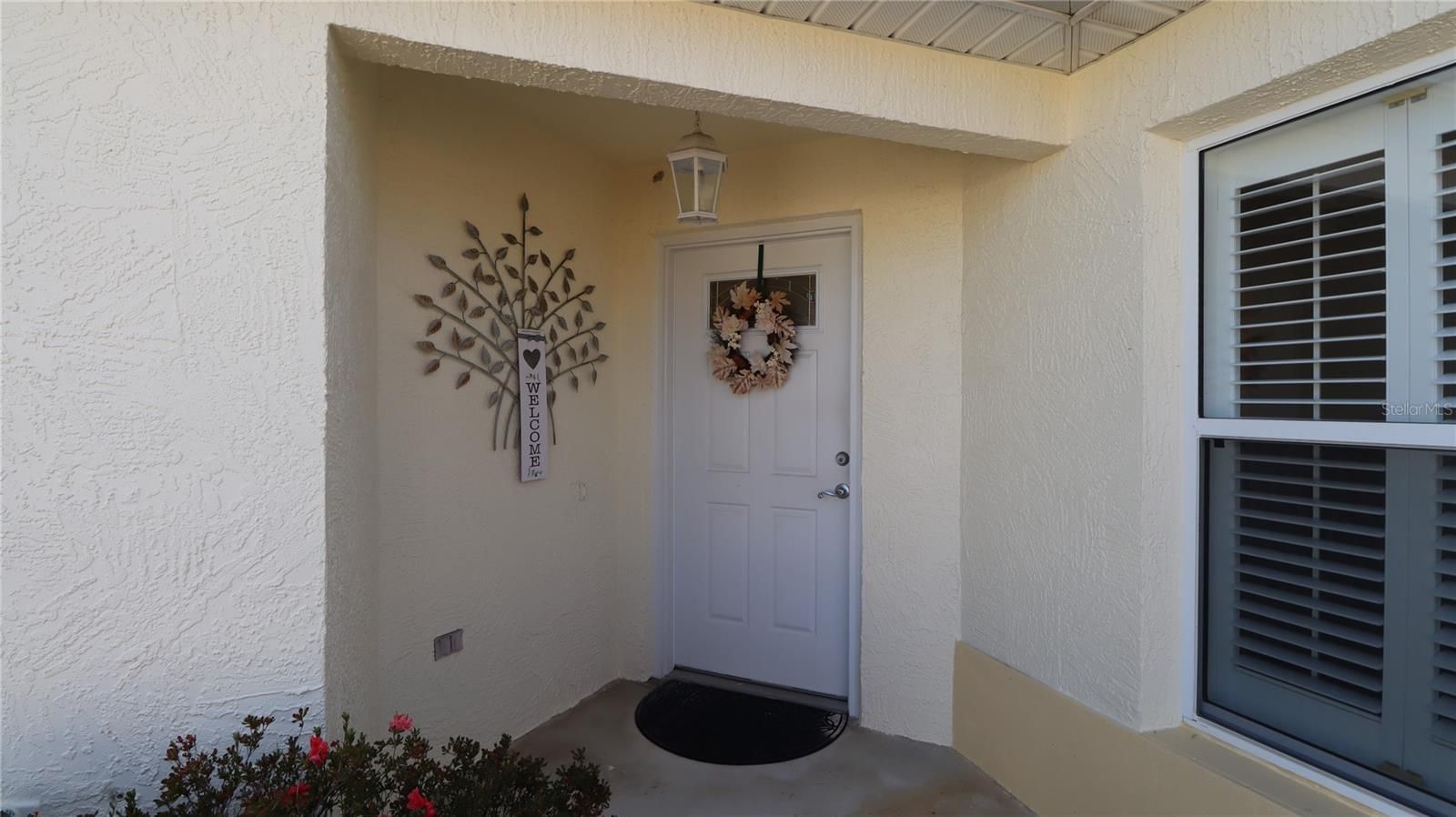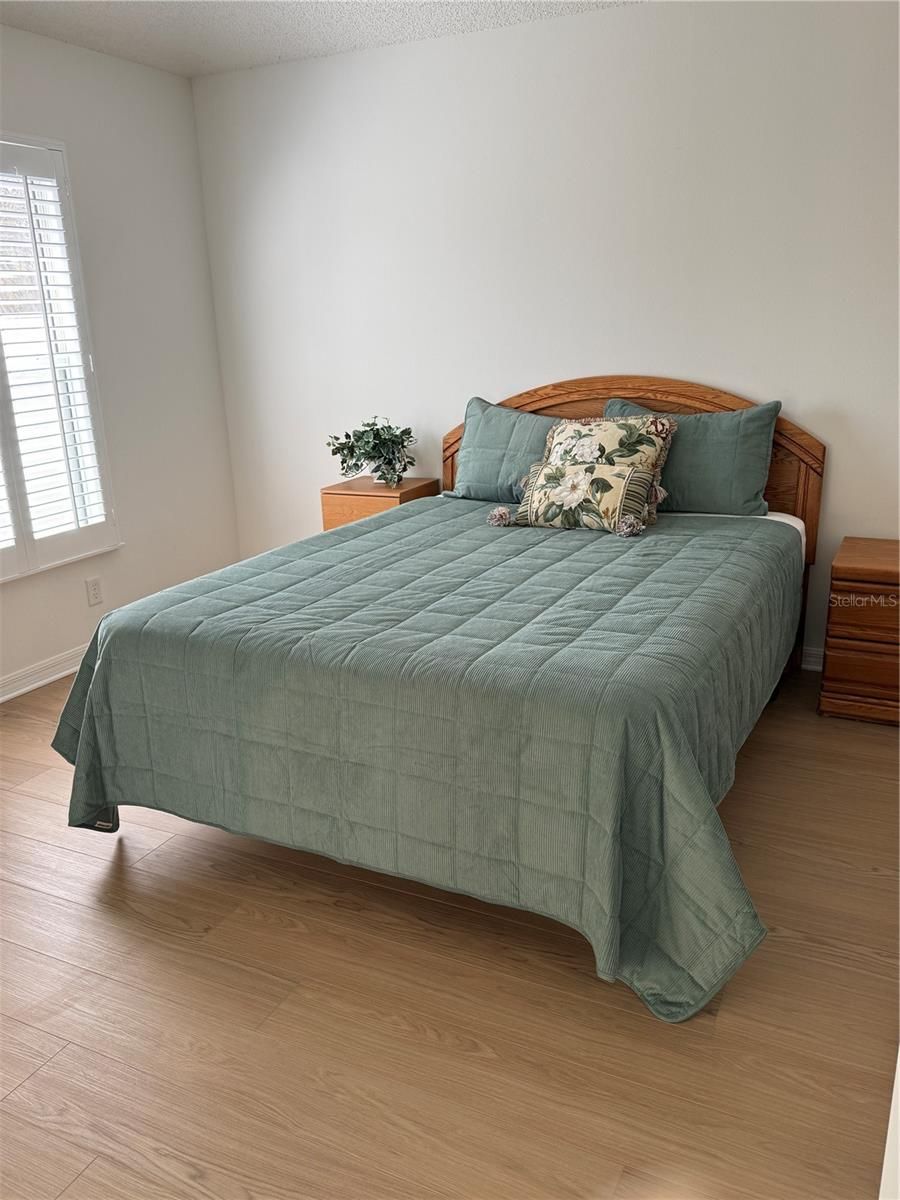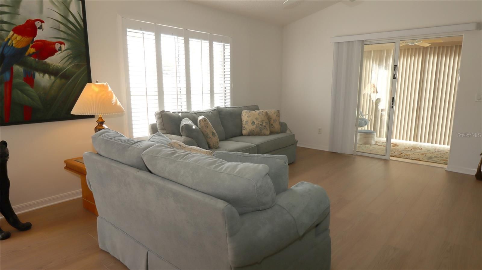 SELLER IS MOTIVATED AND PRICE HAS BEEN REDUCED. Back on the market and better than ever! Buyer had to back out because of health issues. This lovely block and stucco Beauregard courtyard Villa is located in a highly sought after Village of Virginia Trace in the Still Water Villas. You are just blocks from Sumter Landing town square. The is an all block and stucco neighborhood. It is a 2/2 with an enclosed lanai and a nice courtyard out back. The flooring is all luxury vinyl planking except the bathrooms which are tiled. Plantation shutters provide a nice look to the windows and all of the slats on the vinyl verticals have been replaced. Some furniture is included in this home and it's ready to move right in. As you enter the home you see the kitchen with gleaming laminate counter tops. The refrigerator is 2024 and the other appliances are original. The range is gas. There is a tidy pantry in the kitchen. The garage is 1 1/2 and has the washer and dryer. There are pull down stairs for storage and race track flooring and a light. This open concept plan has a nice dining room with a table and 4 chairs. There are table pads and two leaves also there. The living room has a love seat and a sofa and an end table with a lamp. The Parrot picture stays and ducks. The Primary bedroom has a queen bed, two night stands, a corner cabinet and a dresser. The Primary bath has dual sinks and a nice step in shower. which has been completely redone. The large walk-in closet has lots of room. The guest room has room for a queen bed, and has a closet. The guest bathroom has a tub and shower combo and tile flooring. Roof 2023, HVAC 2025 (new) and Hot Water Heater 2025 (just installed). Primary bath shower has just been completedly redone. There is a small bond left on this home $4.057.10, Maint $299.20 Year, Fire $320.71 Year, Bond pmt Year $486.96.