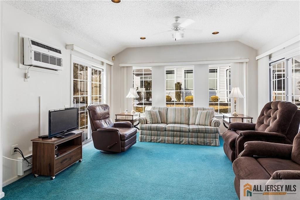 Welcome to this beautifully maintained Ashley II model end-unit ranch in the desirable adult community of Clearbrook. Built in 1993 and offering 1,556 square feet of comfortable living space, this 2-bedroom, 2-full bath home combines thoughtful updates with easy one-level living. A ceramic tile foyer opens to light-filled living and dining rooms featuring high ceilings, recessed lighting and ceiling fan. French doors lead to a four-season sunroom with recessed lighting, two sliders, and access to both bedroomsperfect for relaxing or entertaining year-round. The updated kitchen boasts granite countertops, recessed lighting, and NEW stainless steel appliances including refrigerator, electric stove/oven, microwave, and dishwasher, plus direct access to the two-car garage with opener and cedar closet. The spacious primary suite offers ceiling fan, walk-in closet, sunroom access, and a full bath with added window, shower stall, and granite-topped vanity. A second carpeted bedroom with high ceiling and ceiling fan sits near the full hall bath with tub/shower combination. Laundry includes washer (2022) and dryer. Recent improvements include forced air cooling system (2025), several electric baseboards and thermostats (2025), front door (2025), refreshed landscaping beds (2025), and gutters scheduled for replacement (2026) plus underground sprinkler and alarm systems. Clearbrook offers endless activities and amenities with its 25,000 square foot Clubhouse, 2 outdoor pools, 4 tennis courts, 2 bocce courts, 4 shuffleboard courts, and a Cultural Center for meetings and events.
