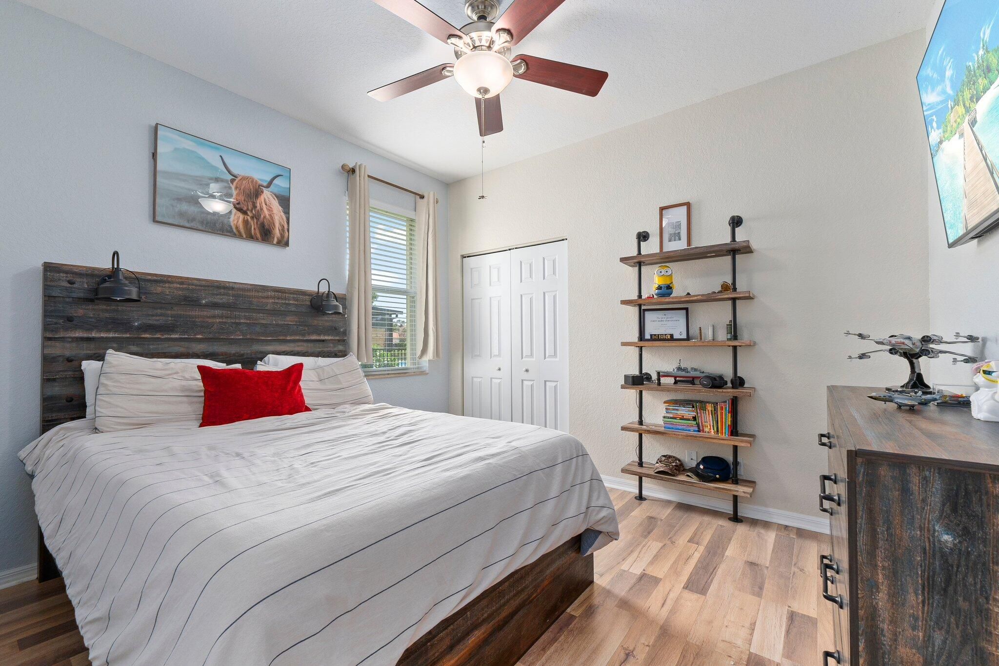 Meticulous 3 bedroom 2 bathroom 2 car garage pool home with lake views in the sought after community of Copperleaf in Palm City. Family orientated neighborhood with ample amenities including playground, clubhouse, pickleball & more! This home boasts a light & bright interior with crown molding, newer AC & water heater, open floor-plan and nice size guest rooms. Updated kitchen with Quartz countertops, Herringbone tile backsplash, oak cabinets, new black stainless steel appliances & large pantry. Spacious primary suite with shiplap accent wall, walk-in closets, dual sinks, soaking tub & frameless shower. Entertain family & friends outside under the covered patio, completely fenced yard offers lake views, paver deck & heated, salt water pool that's perfect for those hot summer days!