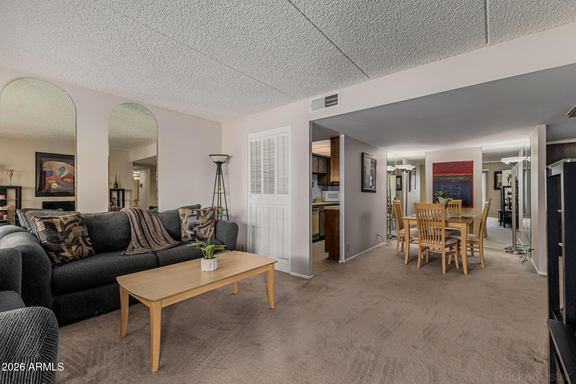 Fantastic opportunity to own this charming condo unit in the guard-gated Scottsdale Shadows! With 2 beds & 2 baths, it tastefully blends comfort and convenience. Discover a seamlessly flowing living & dining room paired with tons of natural light! Designed paint creates an inviting vibe, complemented by tile & soft carpet t/out. The kitchen boasts built-in appliances and flat-panel cabinetry for ample storage. The large main bedroom has a full bathroom for added ease. Sliding doors open to the balcony, where you can relax after a busy day! The unit also comes with a detached 1-car garage. Enjoy the resort-style amenities like pools, golf course, tennis courts, fitness rooms, & a clubhouse. Also includes underground parking & convenient HOA-covered services. Great location! Make this yours!