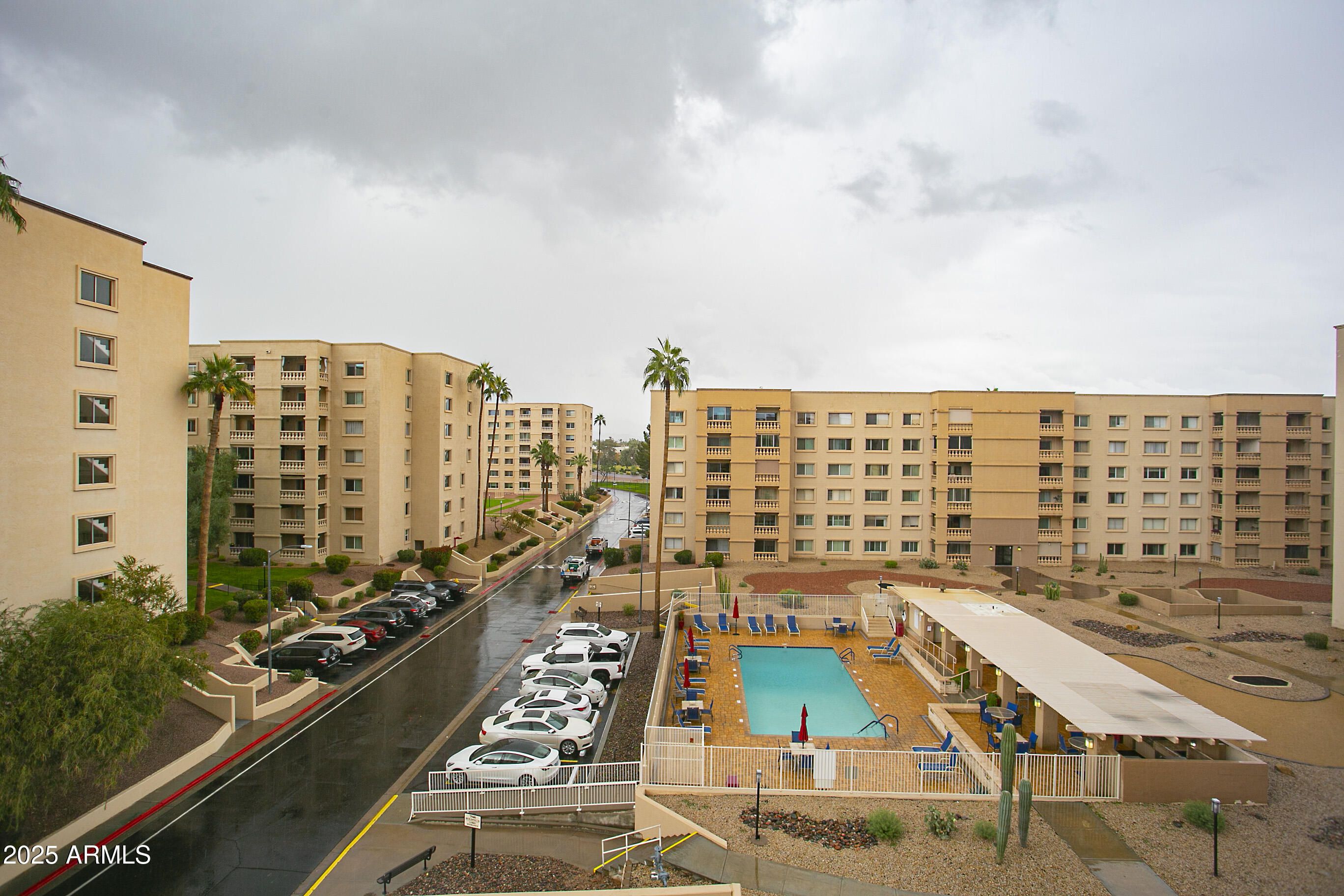 Overlooking a sparkling pool, this stylish 2-bedroom, end unit condo in the heart of Scottsdale offers an open-living floor plan. The remodeled modern kitchen features ample cabinetry, decorative tile backsplash, stainless-steel farm sink, granite counters and stainless appliances. Enjoy a seamless flow into the bright living area and walk-out patio. Flexible guest suite with dual access can serve as a bedroom or office/den. The primary suite includes a spacious walk-in closet and step-in shower. Newer windows/patio slider, newer A/C, additional storage closet and assigned garage space conveniently located in the same building. Scottsdale Shadows offers 24/7 guarded entry, 9-hole golf, tennis, clubhouse, 3 pools, ceramic/paint/woodshop rooms + more!