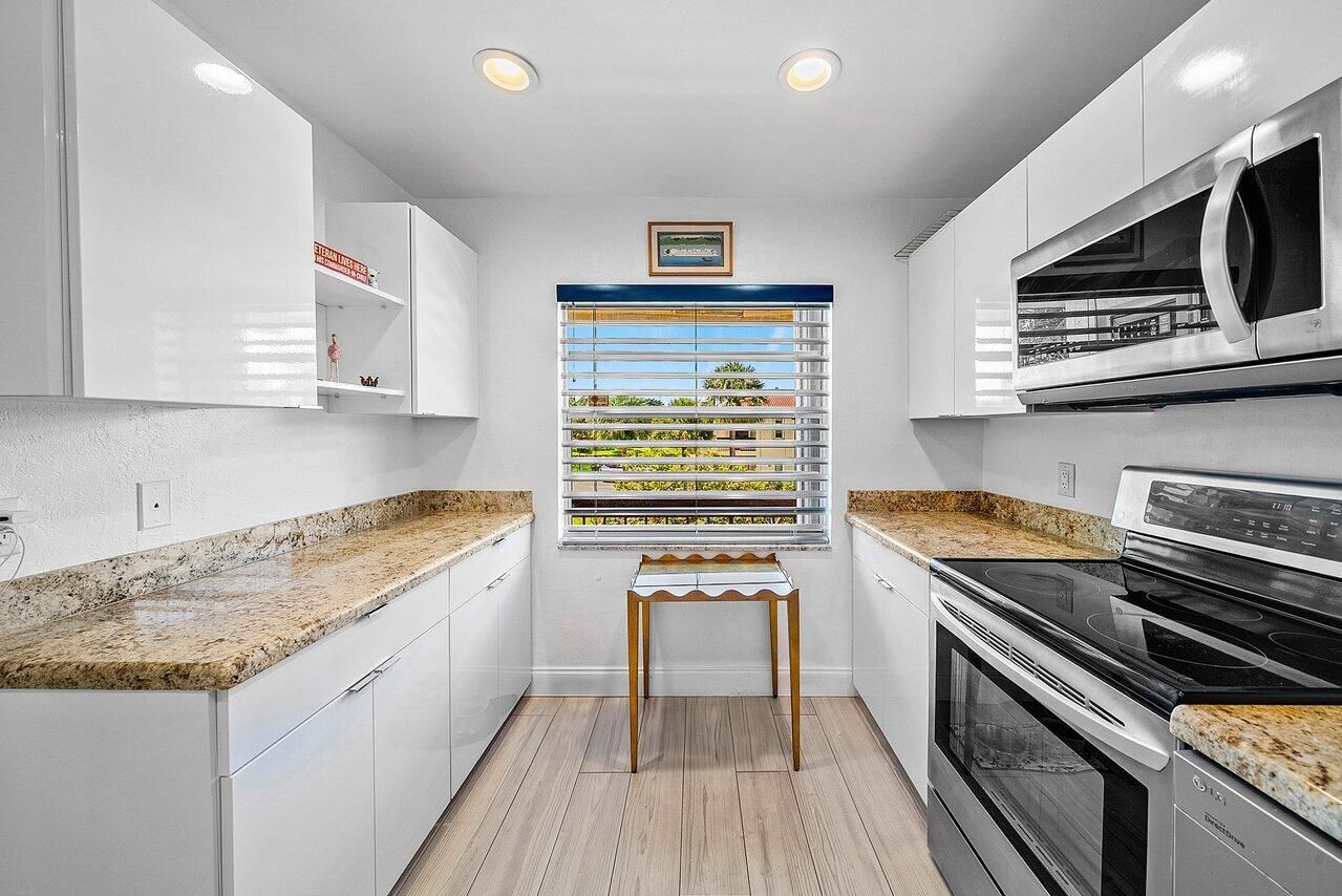 Enjoy beautiful golf course views from this bright and airy second-floor corner residence overlooking the third hole of the Boca Lago Golf Course. With 1,411 square feet of thoughtfully designed living space, this home effortlessly blends comfort, style, and serenity. The updated kitchen showcases sleek white cabinetry, granite countertops, and stainless steel appliances. The open-concept layout flows seamlessly from the dining area into the spacious living room, creating an inviting setting for both everyday living and entertaining. An enclosed porch extends the living space—perfect for a home office, reading nook, or simply unwinding while taking in the tranquil golf course views. The primary suite offers a large walk-in closet, an updated vanity with granite countertops, and a modern walk-in shower. The second bedroom features a custom built-in daybed and is conveniently situated near the renovated guest bathroom, which also includes a brand-new washer and dryer. Throughout the home, you'll find extraordinary closet space, providing ample storage and effortless organization in every room. The Greens of Boca Lago has it's own club house and pool. Residents also have the option of joining the Boca Lago Country Club. A standout private club featuring a beautifully maintained golf course that is both playable and challenging for golfers of all levels. The club offers its members a wide array of amenities, including multiple dining venues, a state-of-the-art fitness center, tennis facilities, and a vibrant social calendar filled with events and activities year-round. The Greens of Boca Lago requires prospective buyers to have a minimum credit score of 700.