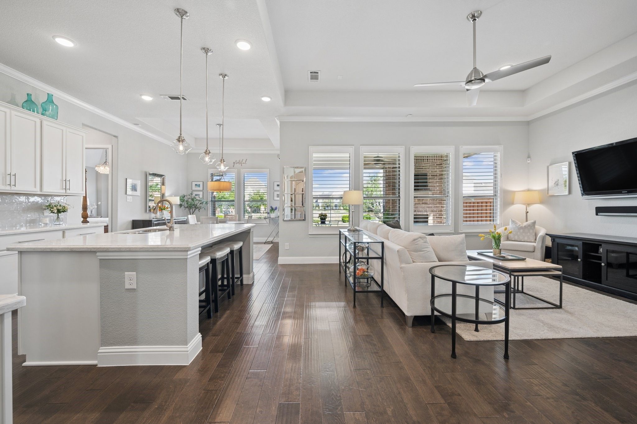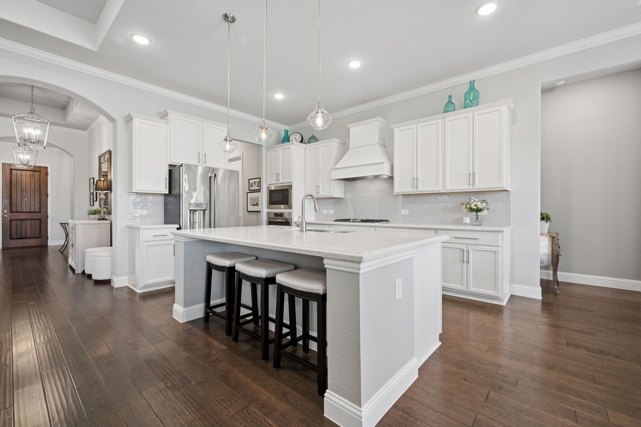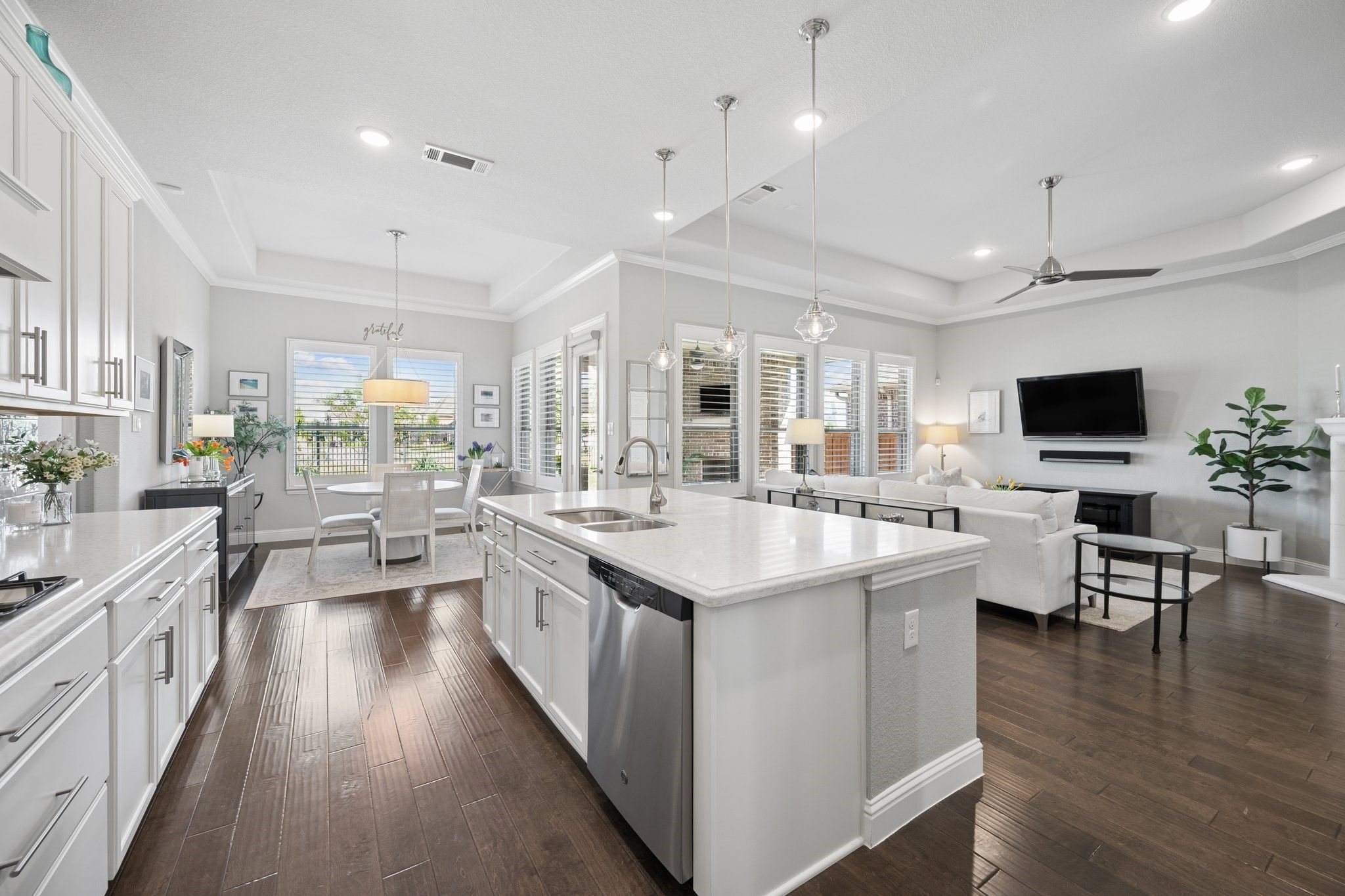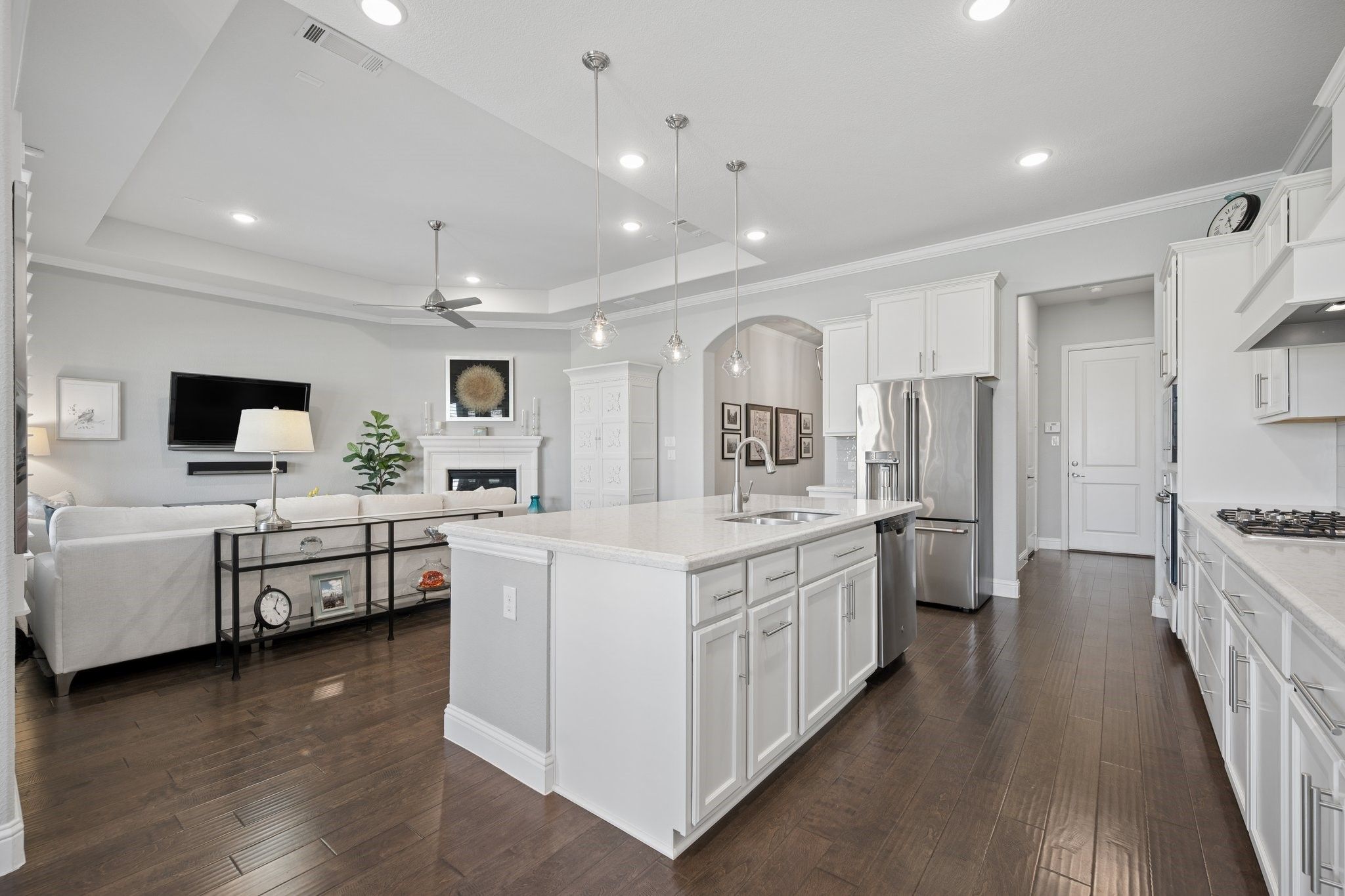 Absolutely Stunning 3-bedroom, 2.5-bath single-story home with an Oversized 3-Car Tandem Garage, on a Premium Greenbelt Lot in the Waterford Point Village of The Tribute Lakeside Golf & Resort Community! Step inside to a bright, airy extended entry featuring elegant tray ceilings, rich engineered hardwood floors, and stunning designer features that continue throughout the home creating an elevated and cohesive aesthetic. The expansive living room is filled with natural light and serene greenbelt views, anchored by a stone fireplace, and flows seamlessly into the kitchen and dining area creating an ideal space for effortless entertaining. The kitchen features crisp white cabinetry, sleek quartz countertops, stainless steel appliances, a 5-burner gas cooktop and a large walk-in pantry. Featuring a split-bedroom layout, the home has two spacious front bedrooms with a full bath and a private owner’s retreat at the back. This luxurious retreat features a stunning chandelier, bay windows, and an ensuite complete with dual vanities, quartz countertops, an oversized walk-in shower, and a large walk-in closet with direct access to the laundry room. Step outside and unwind in your own backyard oasis where a large covered patio, cozy outdoor fireplace, and peaceful greenbelt views create the perfect backdrop for relaxing or entertaining. Additional upgrades include plantation shutters, crown molding, pre wired for sound in the living room, back patio, & primary bath, and epoxy garage floors in the oversized 3 car garage. Ideally located within walking distance to Waterford Point’s private clubhouse featuring a state-of-the-art fitness center and resort-style infinity pool overlooking the lake, the new marina, sand volleyball, pickleball courts, and the Lakeside pool. Residents also enjoy access to a children’s splash pad, playgrounds, dog parks, a kayak launch, two award-winning golf courses, and over 13 miles of scenic hike and bike trails. This home is an absolute MUST SEE!