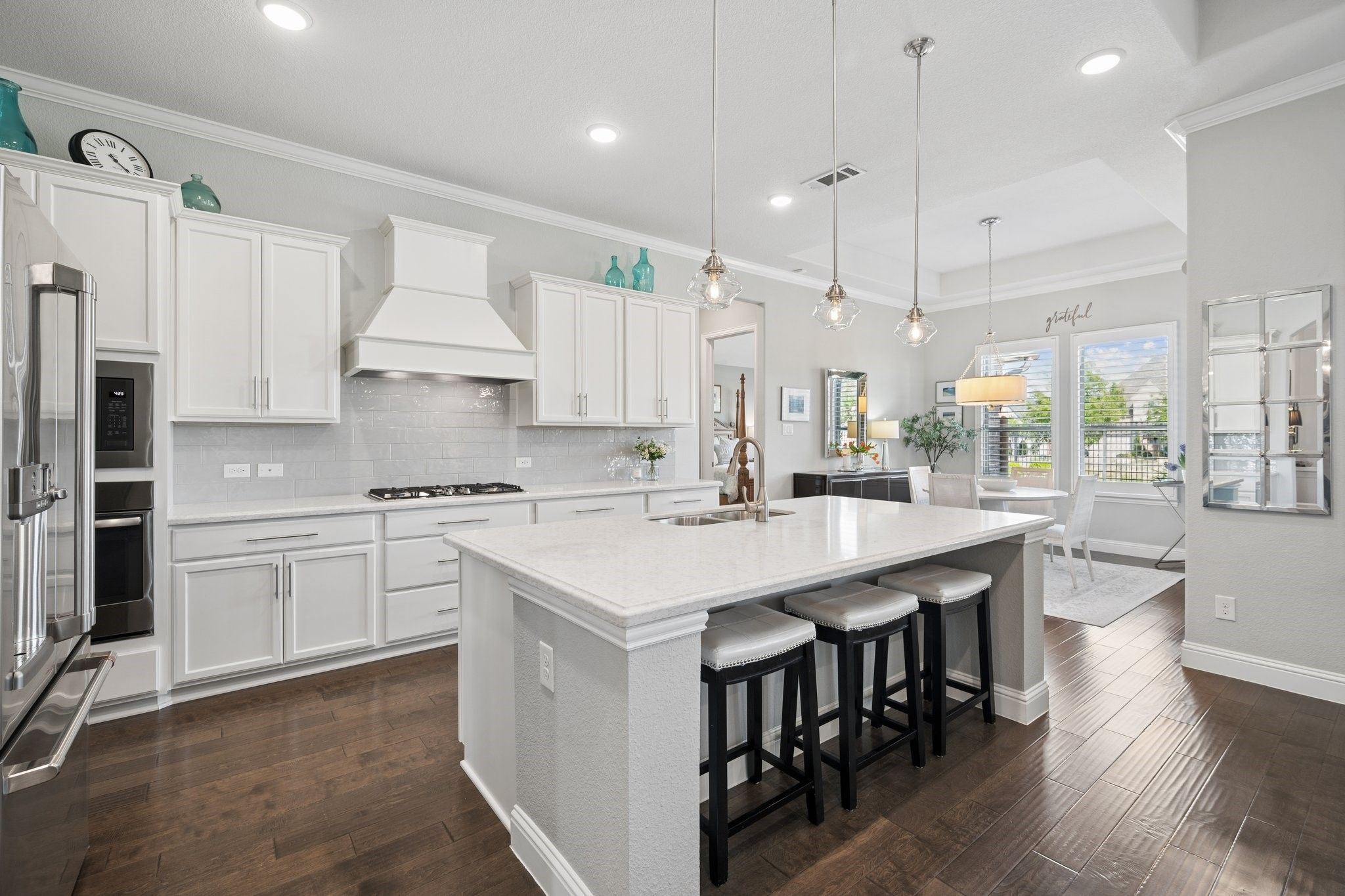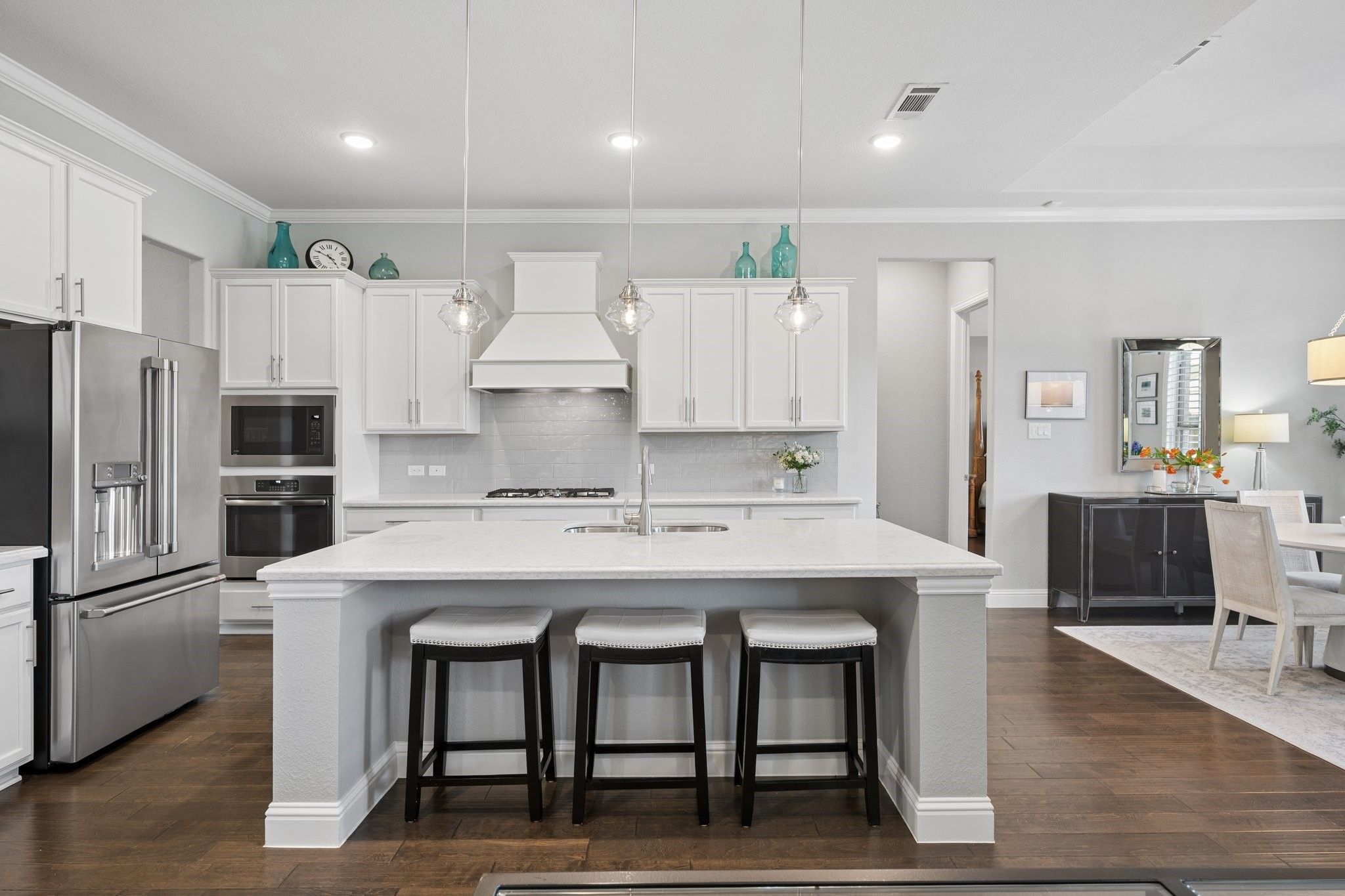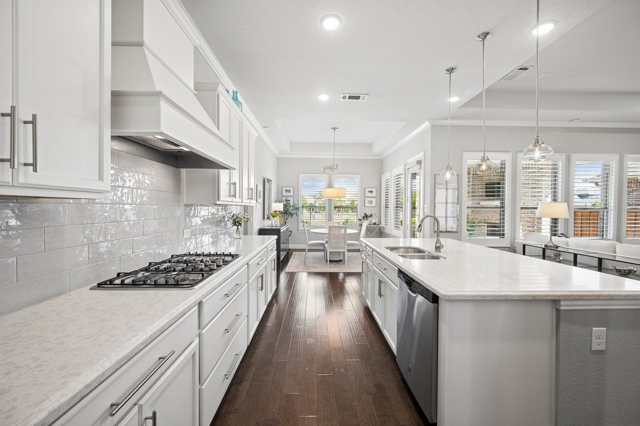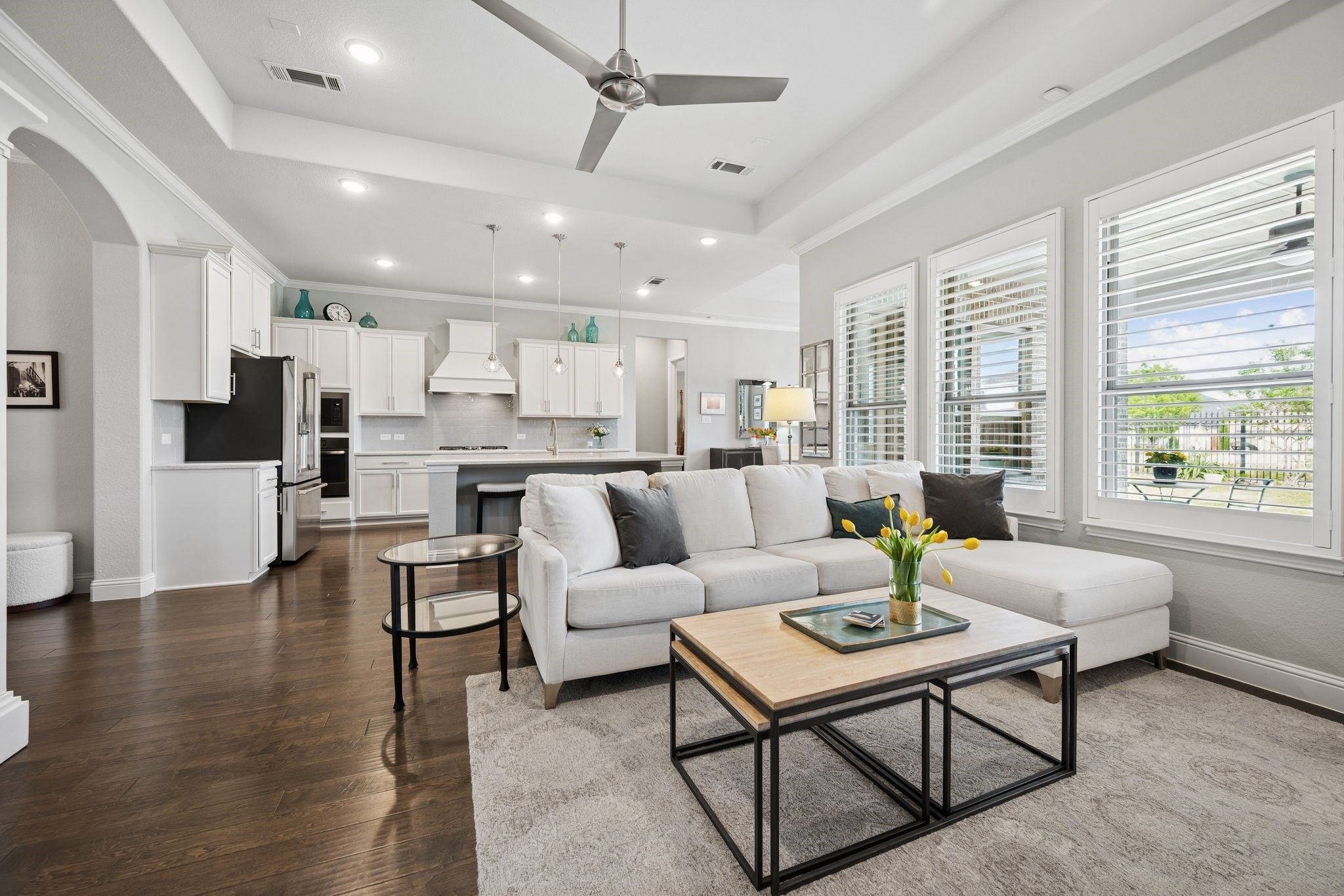 Absolutely Stunning 3-bedroom, 2.5-bath single-story home with an Oversized 3-Car Tandem Garage, on a Premium Greenbelt Lot in the Waterford Point Village of The Tribute Lakeside Golf & Resort Community! Step inside to a bright, airy extended entry featuring elegant tray ceilings, rich engineered hardwood floors, and stunning designer features that continue throughout the home creating an elevated and cohesive aesthetic. The expansive living room is filled with natural light and serene greenbelt views, anchored by a stone fireplace, and flows seamlessly into the kitchen and dining area creating an ideal space for effortless entertaining. The kitchen features crisp white cabinetry, sleek quartz countertops, stainless steel appliances, a 5-burner gas cooktop and a large walk-in pantry. Featuring a split-bedroom layout, the home has two spacious front bedrooms with a full bath and a private owner’s retreat at the back. This luxurious retreat features a stunning chandelier, bay windows, and an ensuite complete with dual vanities, quartz countertops, an oversized walk-in shower, and a large walk-in closet with direct access to the laundry room. Step outside and unwind in your own backyard oasis where a large covered patio, cozy outdoor fireplace, and peaceful greenbelt views create the perfect backdrop for relaxing or entertaining. Additional upgrades include plantation shutters, crown molding, pre wired for sound in the living room, back patio, & primary bath, and epoxy garage floors in the oversized 3 car garage. Ideally located within walking distance to Waterford Point’s private clubhouse featuring a state-of-the-art fitness center and resort-style infinity pool overlooking the lake, the new marina, sand volleyball, pickleball courts, and the Lakeside pool. Residents also enjoy access to a children’s splash pad, playgrounds, dog parks, a kayak launch, two award-winning golf courses, and over 13 miles of scenic hike and bike trails. This home is an absolute MUST SEE!