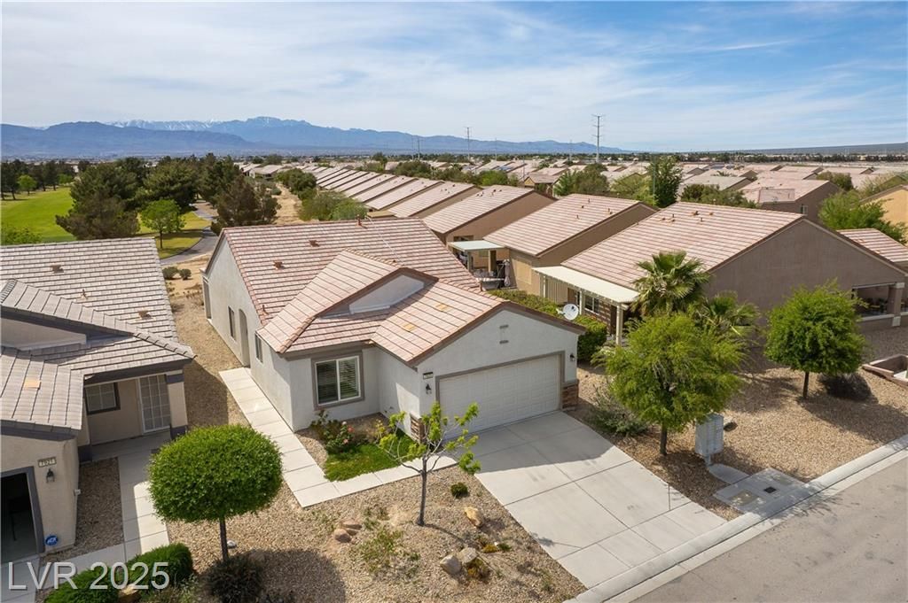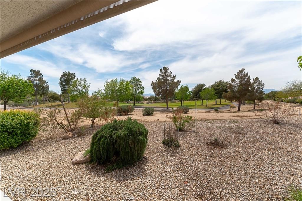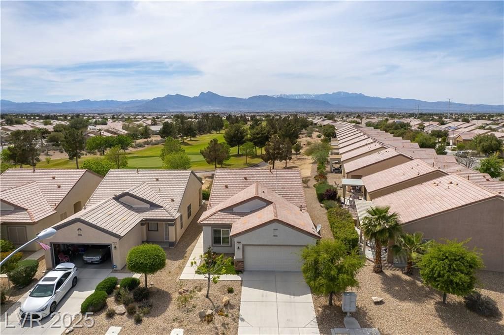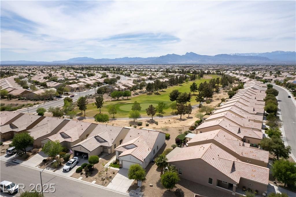 Discover resort-style 55+ living in Sun City Aliante! This open-concept home sits on the 7th green, offering breathtaking, unobstructed golf fairway and Mt. Charleston views from the living room, primary suite, and covered patio with crank-down shades. Enjoy tranquil wildlife watching—quail, roadrunners, and bunnies abound! The spacious primary suite features a large walk-in closet and a relaxing walk-in tub/shower. Natural light flows throughout the home, enhancing its inviting atmosphere. Additional features include epoxy garage flooring, leased Sun Run solar for energy efficiency, and the convenience of a mailbox right out front. Seller is offering an $1,850 flooring allowance, allowing you to customize the space to your taste. Experience an amenity-rich, active lifestyle in a highly desirable community. Don’t miss this opportunity—schedule your showing today!