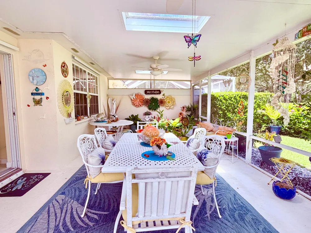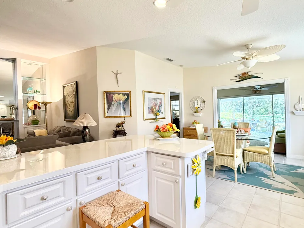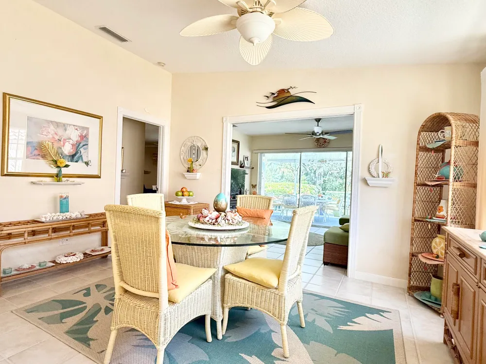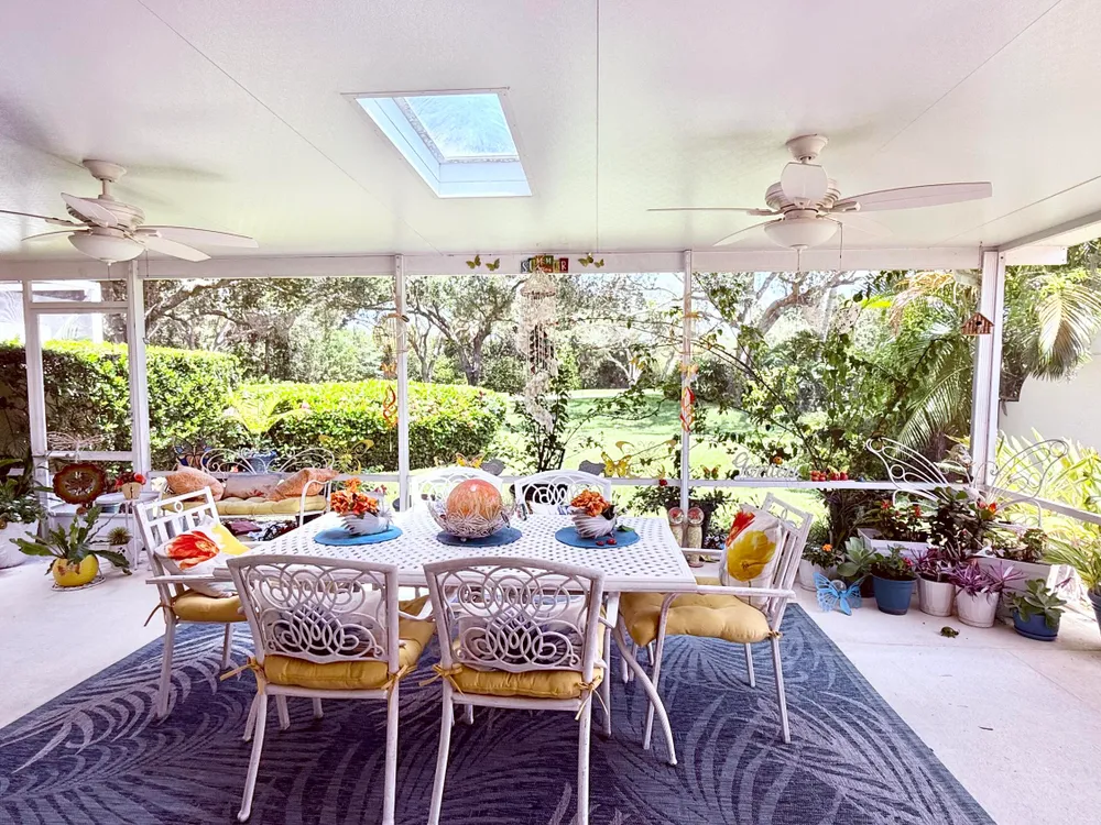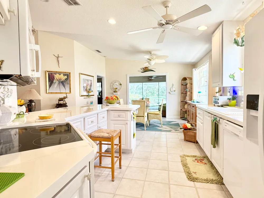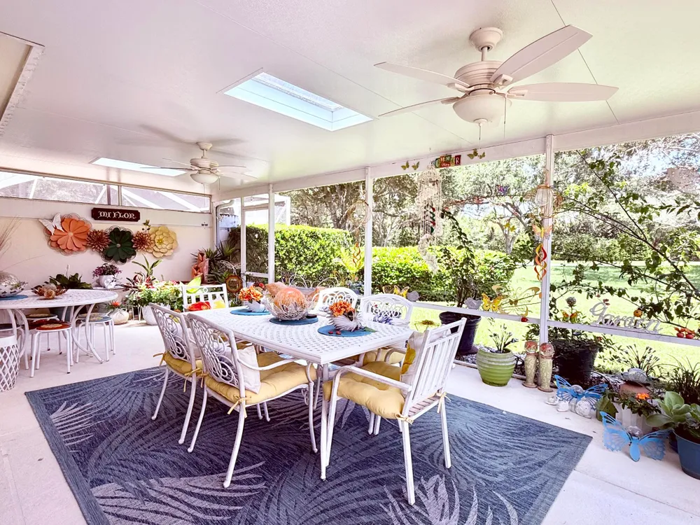 Sought-after Expanded Regent model featuring 3 bedrooms, 2 bathrooms, plus a versatile den with sliders leading to the covered patio and an additional bonus - The roof was replaced in 2019!! The open layout boasts vaulted ceilings in the great room, built in entertainment center and ceramic tile flooring throughout (wood flooring in principal bedroom) The principal suite offers an en-suite bath with double sinks, a large walk-in shower, and walk-in closet. Two guest bedrooms share a full bath with a tub/shower combo. Additional features include a laundry room with utility sink, central vacuum, and security system. Enjoy the covered, 30X15 screened patio with skylight and tranquil garden views in a very quiet location.