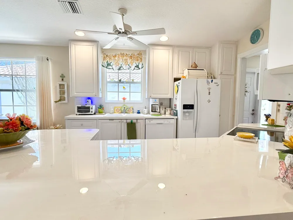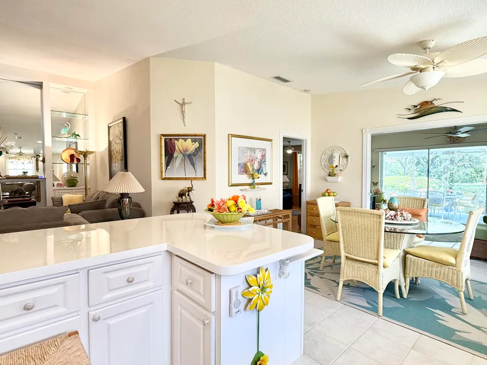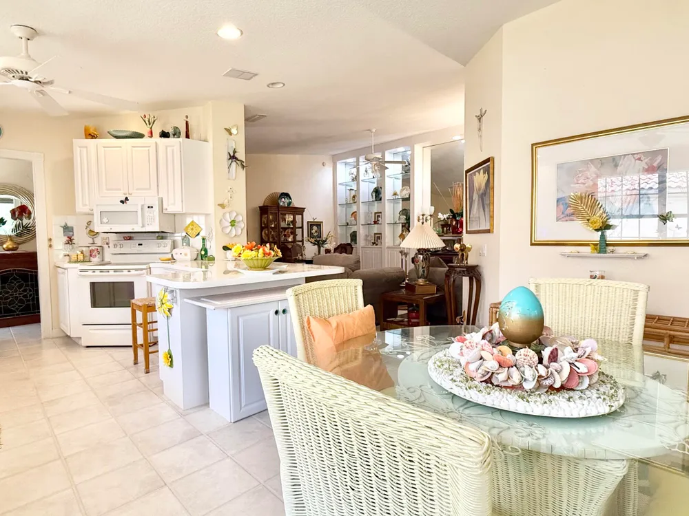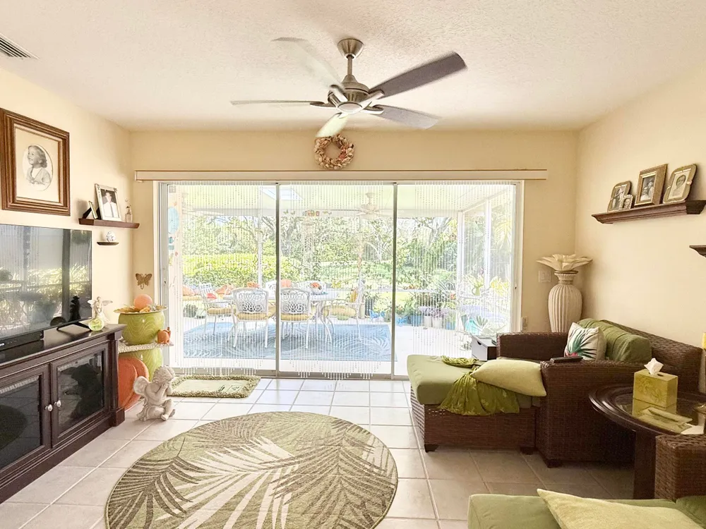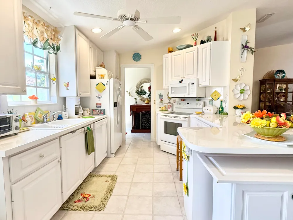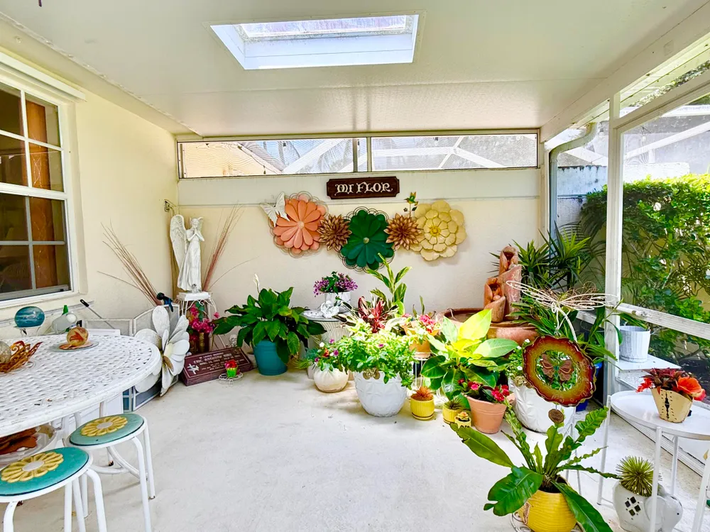 Sought-after Expanded Regent model featuring 3 bedrooms, 2 bathrooms, plus a versatile den with sliders leading to the covered patio and an additional bonus - The roof was replaced in 2019!! The open layout boasts vaulted ceilings in the great room, built in entertainment center and ceramic tile flooring throughout (wood flooring in principal bedroom) The principal suite offers an en-suite bath with double sinks, a large walk-in shower, and walk-in closet. Two guest bedrooms share a full bath with a tub/shower combo. Additional features include a laundry room with utility sink, central vacuum, and security system. Enjoy the covered, 30X15 screened patio with skylight and tranquil garden views in a very quiet location.