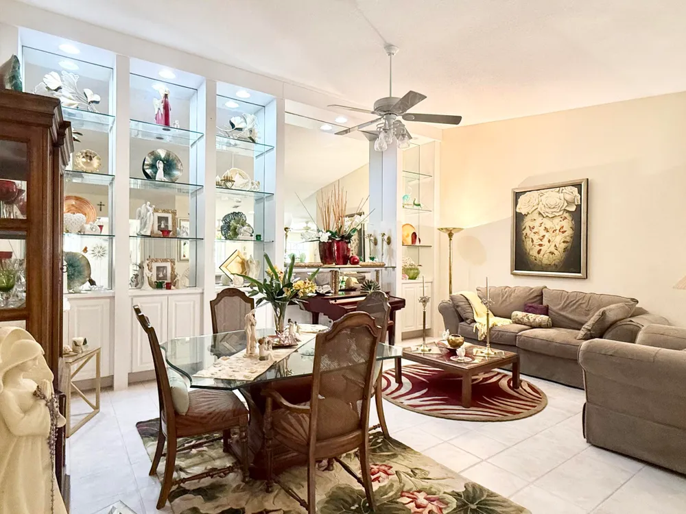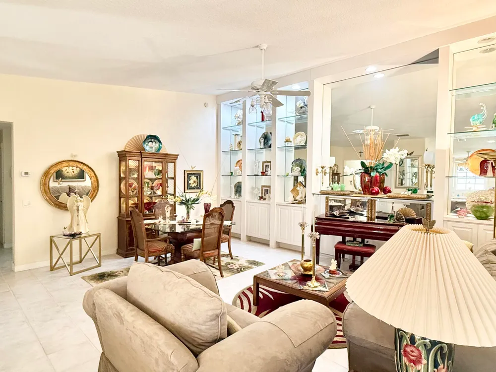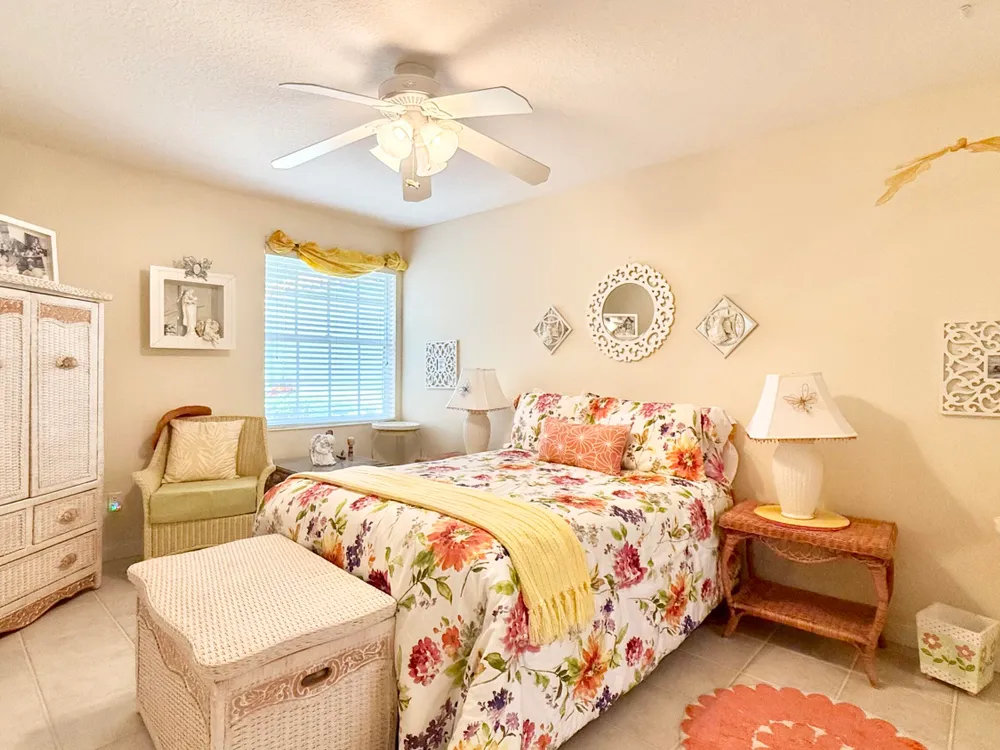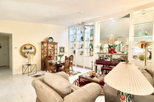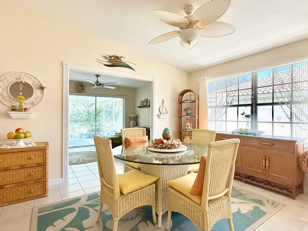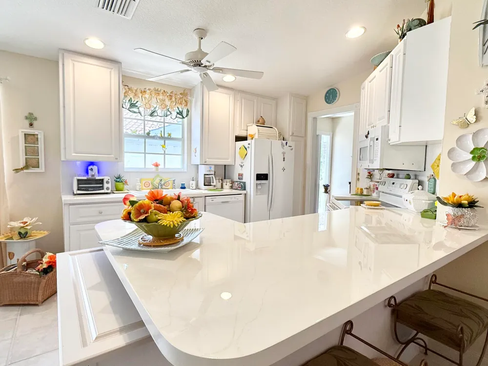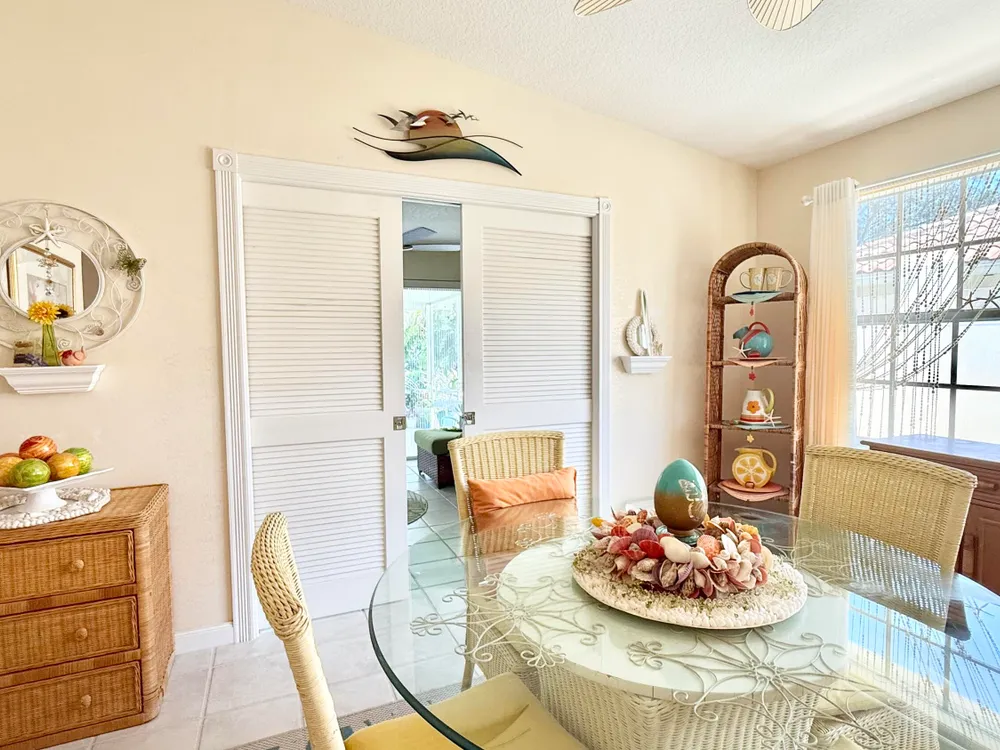 Sought-after Expanded Regent model featuring 3 bedrooms, 2 bathrooms, plus a versatile den with sliders leading to the covered patio and an additional bonus - The roof was replaced in 2019!! The open layout boasts vaulted ceilings in the great room, built in entertainment center and ceramic tile flooring throughout (wood flooring in principal bedroom) The principal suite offers an en-suite bath with double sinks, a large walk-in shower, and walk-in closet. Two guest bedrooms share a full bath with a tub/shower combo. Additional features include a laundry room with utility sink, central vacuum, and security system. Enjoy the covered, 30X15 screened patio with skylight and tranquil garden views in a very quiet location.
