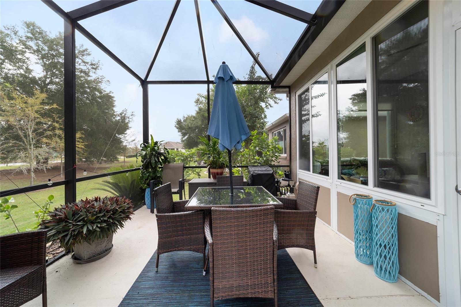 Indigo East • OTOW • Gateway Pass • Private outdoor living • No rear neighbors. Located in the gated, golf-cart-friendly Indigo East community within On Top of the World, this home emphasizes privacy, upgraded outdoor living, and extensive amenity access. The landscaped backyard with no rear neighbors creates a quiet, private setting for the enclosed lanai, which features new windows, remote blinds, ceiling fans, and added electrical outlets. Directly behind the lanai sits the screened birdcage enclosure, extending the outdoor living area and offering additional outlets to support lighting, small appliances, or hobby use. Inside, the home includes 2 bedrooms plus a third bedroom option with closet, providing flexible space for guests, office needs, crafts, or fitness. Diagonal-set tile enhances the main living areas, while the kitchen offers granite countertops, stainless steel appliances, under-cabinet lighting, pendant lights, and recessed lighting with dimmers. The owner’s suite includes a large walk-in closet and a no-step shower. Recent exterior paint adds to overall appeal, and the 2-car garage includes overhead storage. With a low HOA fee of $241.33/month, Indigo East offers two pools, a recreation center, gym, and a paved walking trail, along with OTOW fitness, golf, and recreation amenities through the Gateway Pass. Services include curbside mail, trash and recycling pickup, and roadside tree and branch removal. Video tour available.