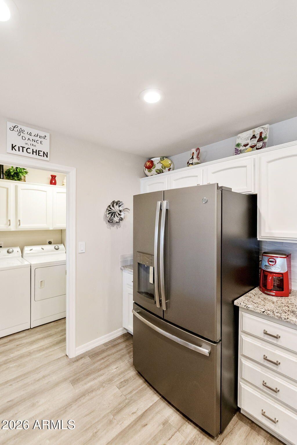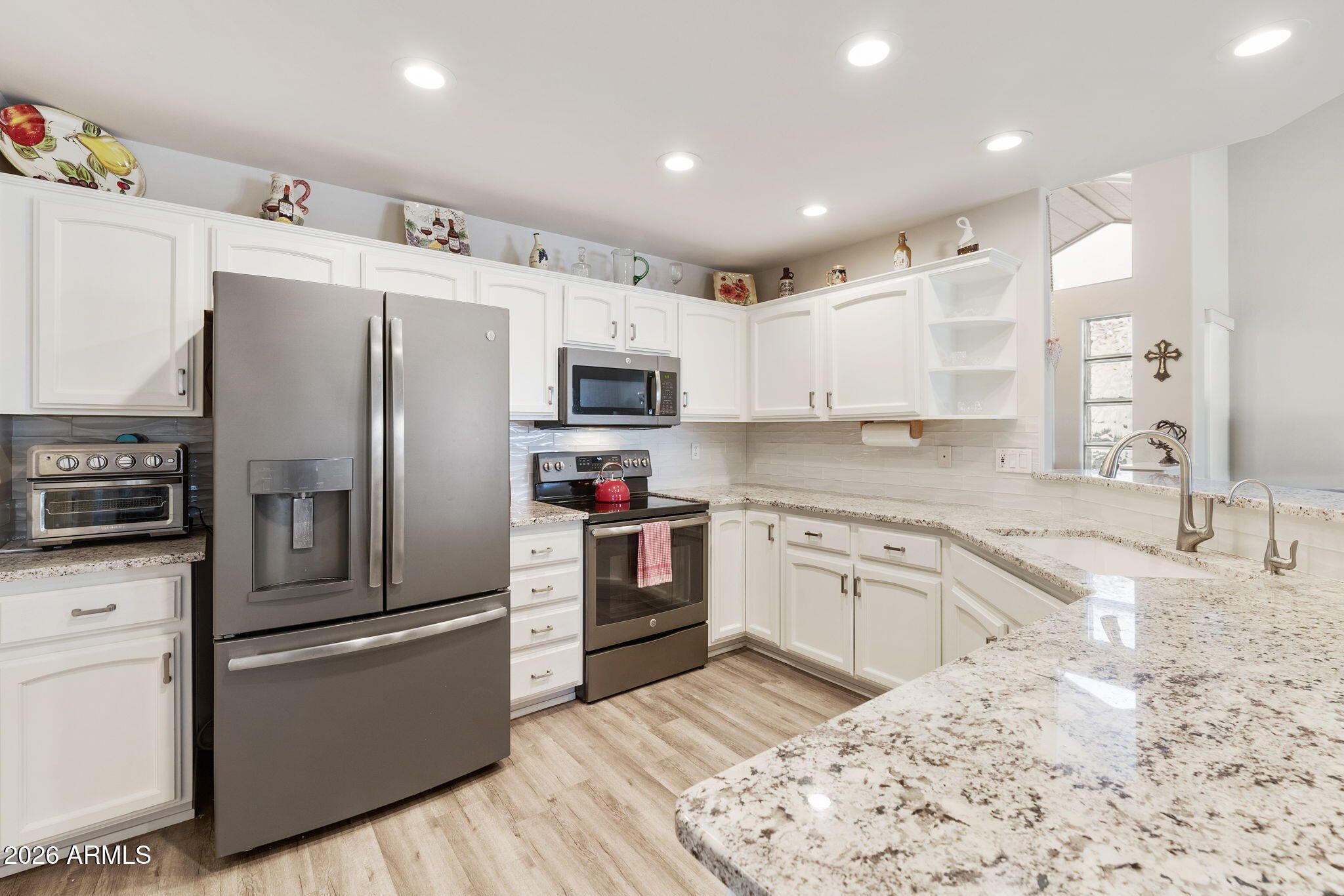 Highly sought-after 55+ Fountain of the Sun GEM! Fully furnished as shown, this inviting 2 bed, 2 bath home offers a desirable split primary suite with walk-in closet and a second bedroom with walk-in closet. Features include updated laminate flooring (2024), dual-pane windows, and a formal dining area. The kitchen offers granite counters, updated appliances including oven, dishwasher, refrigerator, disposal, and partial updates completed in 2024. Water heater 2025, partial plumbing updates 2024, washer and dryer inside. Enjoy a covered patio, east/west exposure, 2-car garage plus 2 slab parking spaces, water softener, water purifier, bath grab bars, and PET FRIENDLY AREA. CLICK MORE... Conveniently located near the US 60 and Red Mountain Freeways, this home offers easy access to Mesa Gateway Airport, Sky Harbor, and shopping at Costco, Superstition Springs, and San Tan Mall. Enjoy Country Club & Golf Community amenities including a lake, golf, fitness center, pickleball, bocce ball, and Birdie's Restaurant open daily.