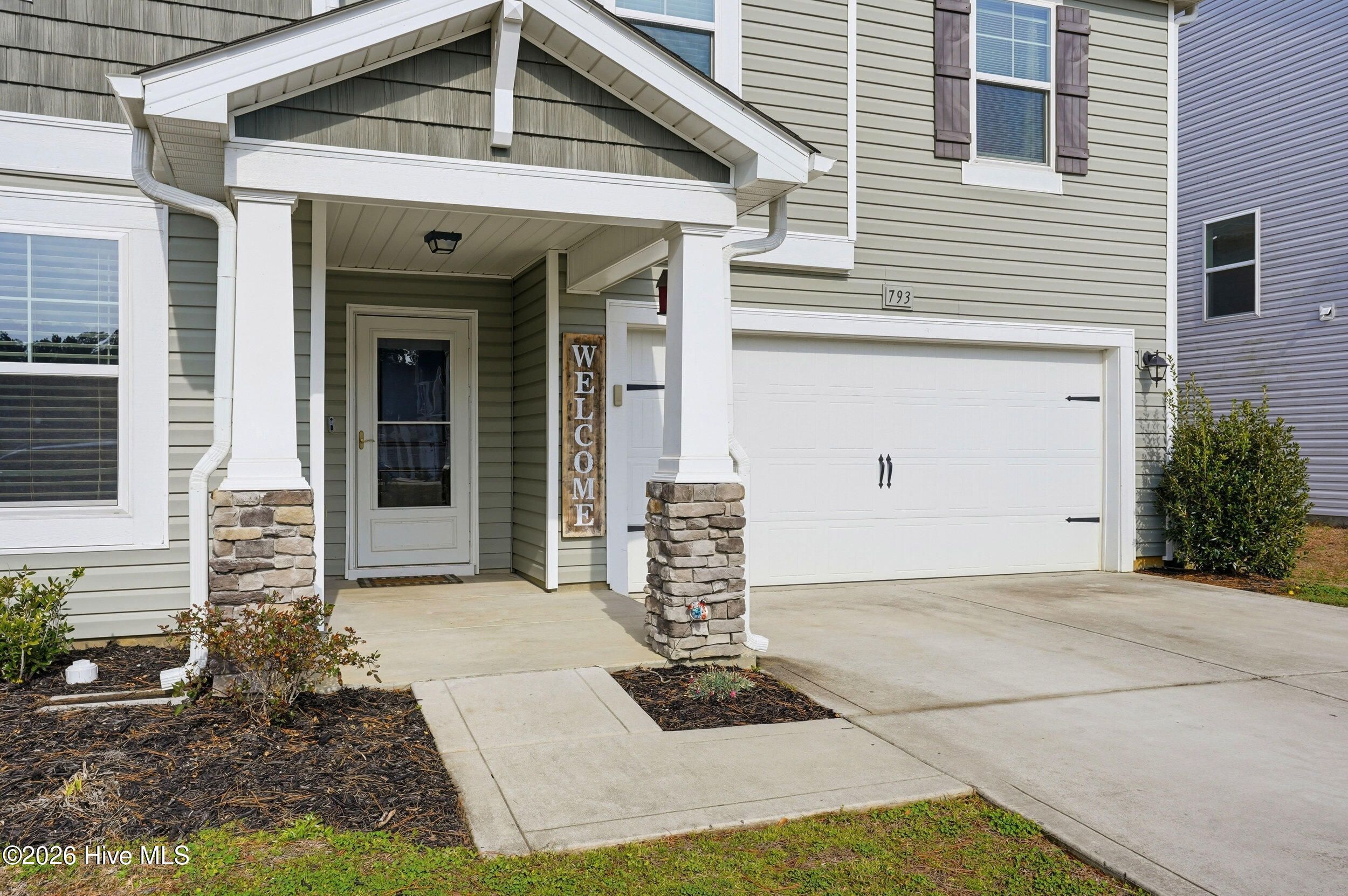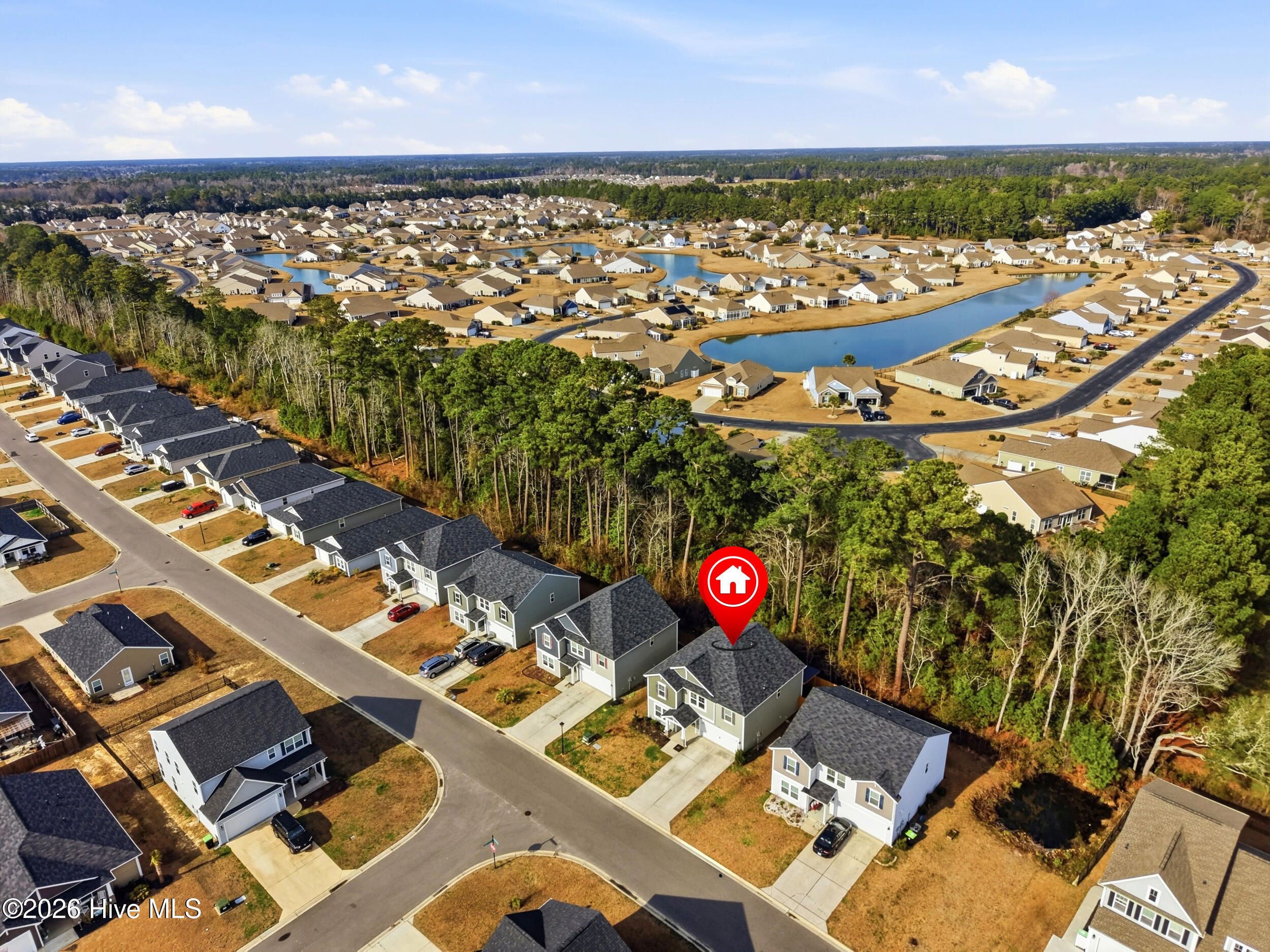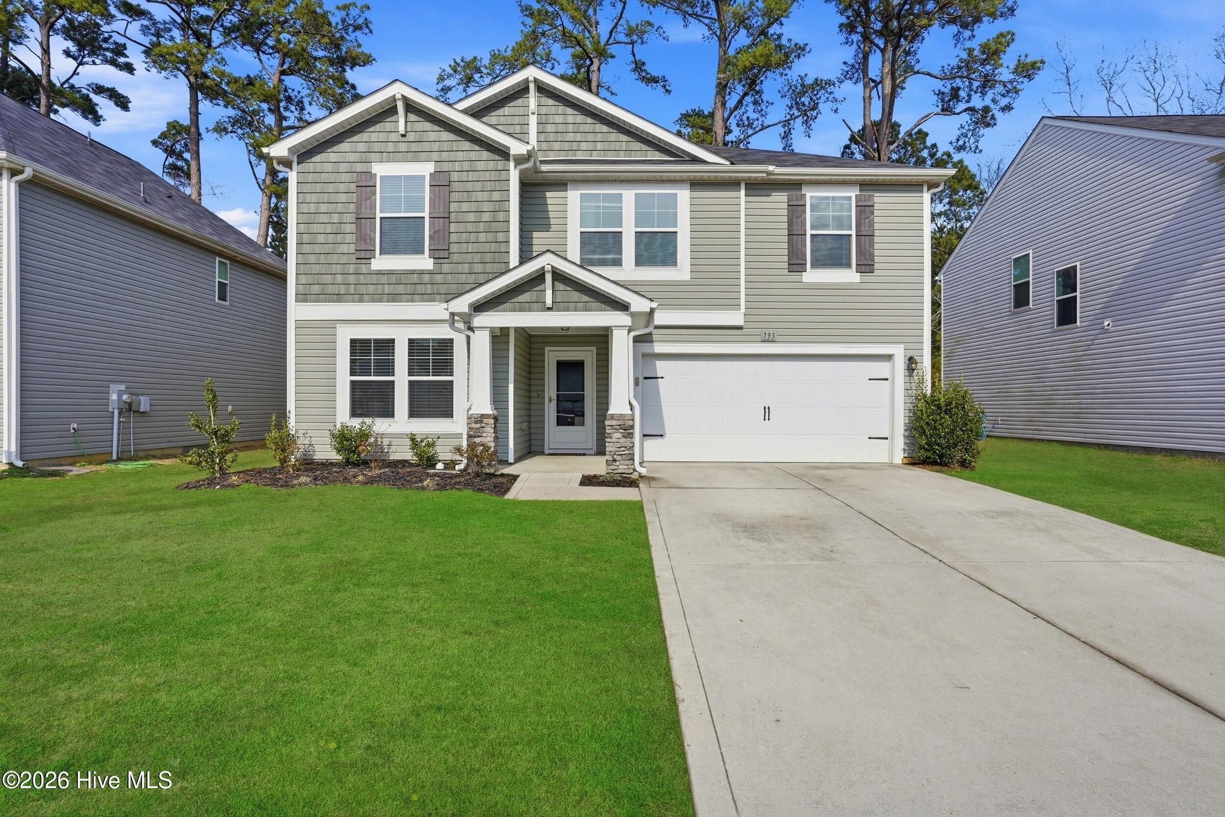 Welcome to 793 Landmark Cove, a stunning 4-bedroom, 2.5-bath home in the highly desirable Calabash community. This thoughtfully designed home combines bright, open interiors with functional spaces that flow effortlessly from room to room. Step inside to durable LVP flooring throughout the main living areas and a welcoming entry that sets the tone for this light-filled residence. The spacious living room features abundant natural light and a ceiling fan, seamlessly connecting to the dining area and kitchen. The kitchen is a chef's dream with a large island with integrated sink and prep space, ample cabinetry, a pantry for storage, and an open layout that makes entertaining effortless. Sliding doors from the dining and living areas lead to a covered back patio with ceiling fan, perfect for enjoying North Carolina's seasonal weather. The main floor also offers a convenient bedroom and half bath, while upstairs features a versatile flex/family space, additional bedrooms, a full bath, and a media room, providing room for every need. The primary suite is a bright and spacious retreat with carpeted floors, ceiling fan, and a primary bathroom with double vanity and walk-in shower. Outside, enjoy a fully fenced backyard, low-maintenance landscaping, and a covered patio, all backing to a serene wood line for added privacy. The two-car garage and front covered entry add both functionality and curb appeal. Drone and aerial photography showcase the home's location, lot, and neighborhood, including nearby green space and a scenic community pond. Located in a welcoming neighborhood with well-maintained streets, green spaces, and natural water features, this home offers the perfect blend of comfort, style, and coastal North Carolina living.